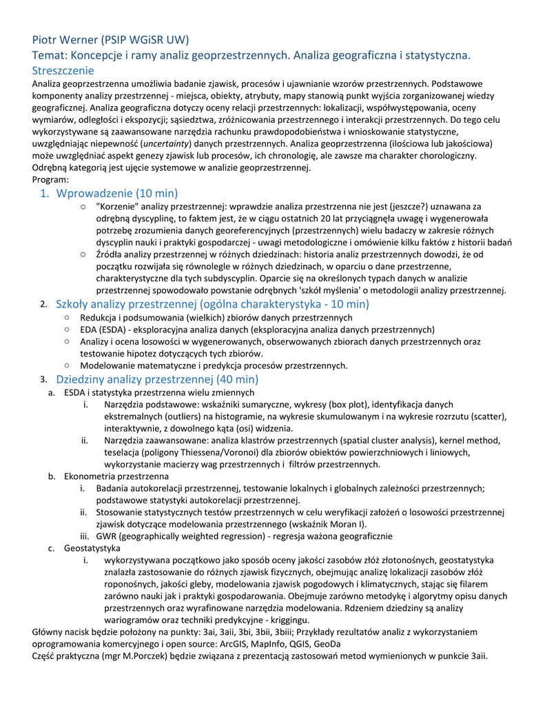 Piotr Werner (PSIP WGiSR UW) Temat: Koncepcje i ramy analiz geoprzestrzennych. Analiza geograficzna i statystyczna. Streszczenie Analiza geoprzestrzenna umożliwia badanie zjawisk, procesów i ujawnianie wzorów przestrzennych. Podstawowe komponenty analizy przestrzennej - miejsca, obiekty, atrybuty, mapy stanowią punkt wyjścia zorganizowanej wiedzy geograficznej. Analiza geograficzna dotyczy oceny relacji przestrzennych: lokalizacji, współwystępowania, oceny wymiarów, odległości i ekspozycji; sąsiedztwa, zróżnicowania przestrzennego i interakcji przestrzennych. Do tego celu wykorzystywane są zaawansowane narzędzia rachunku prawdopodobieństwa i wnioskowanie statystyczne, uwzględniając niepewność (uncertainty) danych przestrzennych. Analiza geoprzestrzenna (ilościowa lub jakościowa) może uwzględniać aspekt genezy zjawisk lub procesów, ich chronologię, ale zawsze ma charakter chorologiczny. Odrębną kategorią jest ujęcie systemowe w analizie geoprzestrzennej. Program: 1. Wprowadzenie (10 min) o o 2. Szkoły analizy przestrzennej (ogólna charakterystyka - 10 min) o o o o 3. "Korzenie" analizy przestrzennej: wprawdzie analiza przestrzenna nie jest (jeszcze?) uznawana za odrębną dyscyplinę, to faktem jest, że w ciągu ostatnich 20 lat przyciągnęła uwagę i wygenerowała potrzebę zrozumienia danych georeferencyjnych (przestrzennych) wielu badaczy w zakresie różnych dyscyplin nauki i praktyki gospodarczej - uwagi metodologiczne i omówienie kilku faktów z historii badań Źródła analizy przestrzennej w różnych dziedzinach: historia analiz przestrzennych dowodzi, że od początku rozwijała się równolegle w różnych dziedzinach, w oparciu o dane przestrzenne, charakterystyczne dla tych subdyscyplin. Oparcie się na określonych typach danych w analizie przestrzennej spowodowało powstanie odrębnych 'szkół myślenia' o metodologii analizy przestrzennej. Redukcja i podsumowania (wielkich) zbiorów danych przestrzennych EDA (ESDA) - eksploracyjna analiza danych (eksploracyjna analiza danych przestrzennych) Analizy i ocena losowości w wygenerowanych, obserwowanych zbiorach danych przestrzennych oraz testowanie hipotez dotyczących tych zbiorów. Modelowanie matematyczne i predykcja procesów przestrzennych. Dziedziny analizy przestrzennej (40 min) a. ESDA i statystyka przestrzenna wielu zmiennych i. Narzędzia podstawowe: wskaźniki sumaryczne, wykresy (box plot), identyfikacja danych ekstremalnych (outliers) na histogramie, na wykresie skumulowanym i na wykresie rozrzutu (scatter), interaktywnie, z dowolnego kąta (osi) widzenia. ii. Narzędzia zaawansowane: analiza klastrów przestrzennych (spatial cluster analysis), kernel method, teselacja (poligony Thiessena/Voronoi) dla zbiorów obiektów powierzchniowych i liniowych, wykorzystanie macierzy wag przestrzennych i filtrów przestrzennych. b. Ekonometria przestrzenna i. Badania autokorelacji przestrzennej, testowanie lokalnych i globalnych zależności przestrzennych; podstawowe statystyki autokorelacji przestrzennej. ii. Stosowanie statystycznych testów przestrzennych w celu weryfikacji założeń o losowości przestrzennej zjawisk dotyczące modelowania przestrzennego (wskaźnik Moran I). iii. GWR (geographically weighted regression) - regresja ważona geograficznie c. Geostatystyka i. wykorzystywana początkowo jako sposób oceny jakości zasobów złóż złotonośnych, geostatystyka znalazła zastosowanie do różnych zjawisk fizycznych, obejmując analizę lokalizacji zasobów złóż roponośnych, jakości gleby, modelowania zjawisk pogodowych i klimatycznych, stając się filarem zarówno nauki jak i praktyki gospodarowania. Obejmuje zarówno metodykę i algorytmy opisu danych przestrzennych oraz wyrafinowane narzędzia modelowania. Rdzeniem dziedziny są analizy wariogramów oraz techniki predykcyjne - kriggingu. Główny nacisk będzie położony na punkty: 3ai, 3aii, 3bi, 3bii, 3biii; Przykłady rezultatów analiz z wykorzystaniem oprogramowania komercyjnego i open source: ArcGIS, MapInfo, QGIS, GeoDa Część praktyczna (mgr M.Porczek) będzie związana z prezentacją zastosowań metod wymienionych w punkcie 3aii.