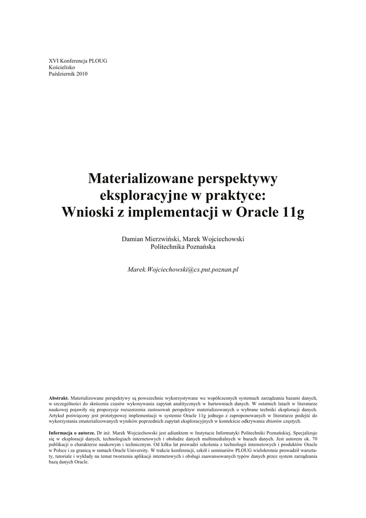 XVI Konferencja PLOUG Kościelisko Październik 2010 Materializowane perspektywy eksploracyjne w praktyce: Wnioski z implementacji w Oracle 11g Damian Mierzwiński, Marek Wojciechowski Politechnika Poznańska [email protected] Abstrakt. Materializowane perspektywy są powszechnie wykorzystywane we współczesnych systemach zarządzania bazami danych, w szczególności do skrócenia czasów wykonywania zapytań analitycznych w hurtowniach danych. W ostatnich latach w literaturze naukowej pojawiły się propozycje rozszerzenia zastosowań perspektyw materializowanych o wybrane techniki eksploracji danych. Artykuł poświęcony jest prototypowej implementacji w systemie Oracle 11g jednego z zaproponowanych w literaturze podejść do wykorzystania zmaterializowanych wyników poprzednich zapytań eksploracyjnych w kontekście odkrywania zbiorów częstych. Informacja o autorze. Dr inż. Marek Wojciechowski jest adiunktem w Instytucie Informatyki Politechniki Poznańskiej. Specjalizuje się w eksploracji danych, technologiach internetowych i obsłudze danych multimedialnych w bazach danych. Jest autorem ok. 70 publikacji o charakterze naukowym i technicznym. Od kilku lat prowadzi szkolenia z technologii internetowych i produktów Oracle w Polsce i za granicą w ramach Oracle University. W trakcie konferencji, szkół i seminariów PLOUG wielokrotnie prowadził warsztaty, tutoriale i wykłady na temat tworzenia aplikacji internetowych i obsługi zaawansowanych typów danych przez system zarządzania bazą danych Oracle. Materializowane perspektywy eksploracyjne w praktyce: Wnioski z implementacji w Oracle 11g 201 1. Wprowadzenie Eksploracja danych stanowi jeden z etapów pojmowanego szerzej procesu odkrywania wiedzy (ang. knowledge discovery in databases, KDD). Definiowana jest jako proces automatycznego odkrywania nietrywialnych, dotychczas nieznanych, potencjalnie użytecznych reguł, zależności, wzorców, schematów, podobieństw lub trendów w dużych repozytoriach danych [FPS96]. Pomimo iż proces ten jest w znacznej mierze zautomatyzowany, centralne miejsce zajmuje w nim człowiek, który może ukierunkowywać proces eksploracji poprzez specyfikowanie warunków i ograniczeń w ramach tzw. zapytań eksploracyjnych [IM96]. Dobór ograniczeń prowadzących do wyboru możliwych do ogarnięcia interesujących wzorców nie jest zadaniem łatwym, dlatego też interaktywna eksploracja danych jest procesem iteracyjnym, w którym użytkownik modyfikuje kryteria zapytania aż do uzyskania satysfakcjonujących rezultatów. Z punktu widzenia systemu eksploracji danych taki scenariusz oznacza sekwencję podobnych zapytań do wykonania. Materializacja wyników zapytań może pozwolić na zwiększenie efektywności przetwarzania kolejnych zapytań, poprzez ich modyfikację (tzw. przepisanie – ang. query rewrite), tak aby wykorzystały zmaterializowane wyniki zapytań poprzednich [ZMW04, WZ05]. Oczywiście z materializowanych wyników zapytań jednego użytkownika mogą w przyszłości skorzystać również inni użytkownicy, pod warunkiem opracowania architektury umożliwiającej współdzielenie materializowanych wyników zapytań eksploracyjnych w bazie danych. Niniejszy artykuł stanowi sprawozdanie z budowy biblioteki FI_WRAPPER stanowiącej nakładkę na dostarczaną przez firmę Oracle funkcję odkrywania zbiorów częstych, udostępnianą w ramach systemu zarządzania bazą danych Oracle 10g oraz 11g w postaci pakietu DBMS_FREQUENT_ITEMSET. Biblioteka ta miała być praktyczną implementacją metod przepisywania zapytań eksploracyjnych, zaproponowanych w [ZMW04]. Bazując na przedstawionych w tym opracowaniu rozważaniach teoretycznych oraz wynikach testów wydajnościowych, a także dokumentacji udostępnianej przez firmę Oracle, określony miał zostać algorytm przepisywania zapytań odkrywania zbiorów częstych. Powstała na jego bazie implementacja miała dalej posłużyć zweryfikowaniu adekwatności wykorzystania wspomnianych metod, w stosunku do komercyjnego rozwiązania firmy Oracle. Podstawą dla takiej weryfikacji miały być testy wydajnościowe, porównujące powstałą implementację z bazową funkcją w kontekście całego scenariusza zapytań eksploracyjnych. W ten sposób zweryfikowane miały zostać przyjęte założenia oraz jakość wykonanej implementacji. 2. Odkrywanie zbiorów częstych 2.1. Opis problemu Odkrywanie zbiorów częstych (ang. frequent itemset mining) jest jedną z podstawowych technik eksploracji danych (ang. data mining), stosowaną zarówno samodzielnie jak i jako pierwszy etap w odkrywaniu reguł asocjacyjnych (ang. association rules) [AIS93]. Problem ten został pierwotnie sformułowany w kontekście analizy koszyka zakupów, ale szybko znalazł liczne inne zastosowania, do których należą m.in. analiza danych medycznych, społecznych i telekomunikacyjnych oraz analiza zachowań użytkowników WWW. Odkrywanie zbiorów częstych polega na odkrywaniu najczęściej występujących podzbiorów w bazie danych zawierającej zbiory nazywane transakcjami1. Miarą częstości występowania zbio1 Nazewnictwo nawiązuje do transakcji dokonywanych przez klientów w sklepach, a nie do pojęcia transakcji w systemach baz danych. 202 Damian Mierzwiński, Marek Wojciechowski ru w bazie danych jest współczynnik wsparcia (ang. support) definiowany jako liczba transakcji zawierających dany zbiór. W rzeczywistych systemach, dla wygody użytkowników, wsparcie wyrażane jest procentowo względem liczby wszystkich transakcji. Podstawowe sformułowanie problemu zakłada, że użytkownik zlecając zadanie odkrywania zbiorów częstych oprócz wskazania danych źródłowych specyfikuje jedynie próg minimalnego wsparcia, określający które zbiory z punktu widzenia użytkownika są częste. W praktyce, w celu zawężenia zbioru zbiorów częstych stanowiących wynik eksploracji, interfejsy do specyfikowania zadań odkrywania zbiorów częstych umożliwiają specyfika