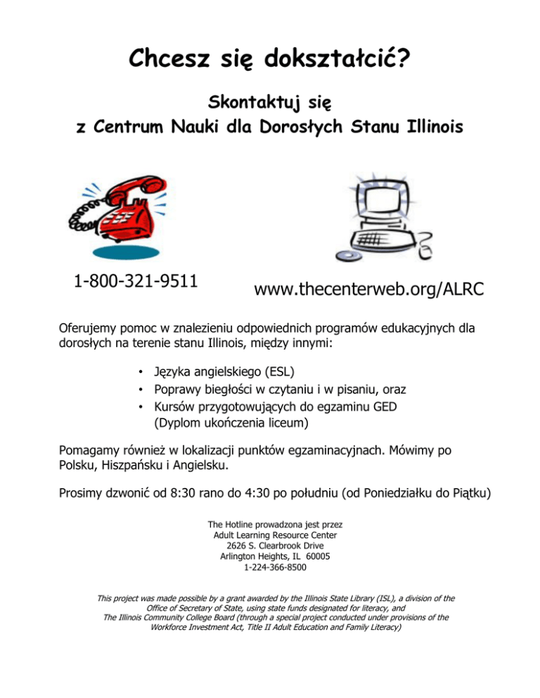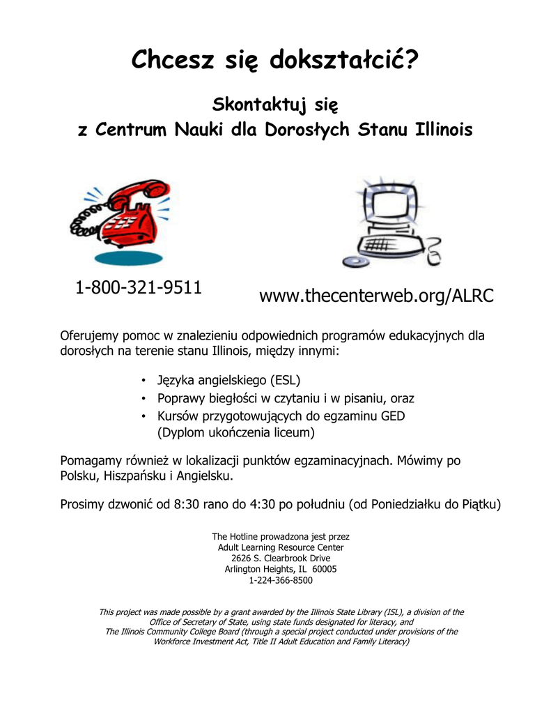 Chcesz się dokształcić? Skontaktuj się z Centrum Nauki dla Dorosłych Stanu Illinois 1-800-321-9511 www.thecenterweb.org/ALRC Oferujemy pomoc w znalezieniu odpowiednich programów edukacyjnych dla dorosłych na terenie stanu Illinois, między innymi: • Języka angielskiego (ESL) • Poprawy biegłości w czytaniu i w pisaniu, oraz • Kursów przygotowujących do egzaminu GED (Dyplom ukończenia liceum) Pomagamy również w lokalizacji punktów egzaminacyjnach. Mówimy po Polsku, Hiszpańsku i Angielsku. Prosimy dzwonić od 8:30 rano do 4:30 po południu (od Poniedziałku do Piątku) The Hotline prowadzona jest przez Adult Learning Resource Center 2626 S. Clearbrook Drive Arlington Heights, IL 60005 1-224-366-8500 This project was made possible by a grant awarded by the Illinois State Library (ISL), a division of the Office of Secretary of State, using state funds designated for literacy, and The Illinois Community College Board (through a special project conducted under provisions of the Workforce Investment Act, Title II Adult Education and Family Literacy)