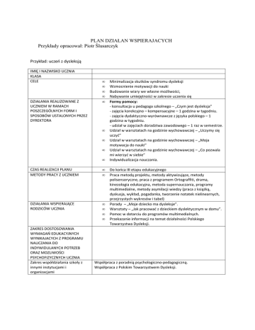 PLAN DZIAŁAN WSPIERAJACYCH Przykłady opracował: Piotr Ślusarczyk Przykład: uczeń z dysleksją IMIĘ I NAZWISKO UCZNIA KLASA CELE DZIAŁANIA REALIZOWANE Z UCZNIEM W RAMACH POSZCZEGÓLNYCH FORM I SPOSOBÓW USTALONYCH PRZEZ DYREKTORA • • • • • • • • • CZAS REALIZACJI PLANU METODY PRACY Z UCZNIEM • • DZIAŁANIA WSPIERAJĄCE RODZICÓW UCZNIA • • • • ZAKRES DOSTOSOWANIA WYMAGAŃ EDUKACYJNYCH WYNIKAJACYCH Z PROGRAMU NAUCZANIA DO INDYWIDULANYCH POTRZEB ORAZ MOZLIWOŚCI PSYCHOFIZYCZNYCH UCZNIA Zakres współdziałania szkoły z innymi instytucjami i organizacjami Minimalizacja skutków syndromu dysleksji Wzmocnienie motywacji do nauki Budowanie wiary we własne możliwości, Nabywanie umiejętności w zakresie uczenia się Formy pomocy: - konsultacja u pedagoga szkolnego – „Czym jest dysleksja” - zajęcia korekcyjno – kompensacyjne – 1 godzina w tygodniu. - zajęcia dydaktyczno-wyrównawcze z języka polskiego – 1 godzina w tygodniu. - udział w zajęciach doradztwa zawodowego – 1 raz w semestrze. Udział w warsztatach na godzinie wychowawczej – „Uczymy się uczyć” Udział w warsztatach na godzinie wychowawczej – „Moja motywacja do nauki” Udział w warsztatach na godzinie wychowawczej – „Co pozwala mi wierzyć w siebie” Indywidualizacja nauczania. Do końca III etapu edukacyjnego Praca metodą projektu, metody aktywizujące, metody polisensoryczne, praca z programem Ortograffiti, drama, kinezologia edukacyjna, metoda supernauczania, programy multimedialne, metody asymilacji wiedzy (praca z książką, dyskusja, wykład, pogadanka, tworzenie notatek nielinearnych, przejrzystych wykresów i tabel) Porady – „Moje dziecko ma dysleksje”. Warsztaty – „Jak pracować z dzieckiem dyslektycznym w domu”. Pomoc w dotarciu do programów multimedialnych. Przekazanie informacji na temat działalności Polskiego Towarzystwa Dysleksji. Współpraca z poradnią psychologiczno-pedagogiczną. Współpraca z Polskim Towarzystwem Dysleksji. Uczeń o obniżonych możliwościach intelektualnych IMIĘ I NAZWISKO UCZNIA KLASA CELE DZIAŁANIA REALIZOWANE Z UCZNIEM W RAMACH POSZCZEGÓLNYCH FORM I SPOSOBÓW USTALONYCH PRZEZ DYREKTORA • • • • • • • • • • • • • CZAS REALIZACJI PLANU METODY PRACY Z UCZNIEM • • DZIAŁANIA WSPIERAJĄCE RODZICÓW UCZNIA ZAKRES DOSTOSOWANIA WYMAGAŃ EDUKACYJNYCH WYNIKAJACYCH Z PROGRAMU NAUCZANIA DO INDYWIDULANYCH POTRZEB ORAZ MOZLIWOŚCI PSYCHOFIZYCZNYCH UCZNIA Zakres współdziałania szkoły z Innymi instytucjami i organizacjami • Minimalizacja skutków obniżonej sprawności intelektualnej Wzmocnienie motywacji do nauki Budowanie wiary we własne możliwości, Nabywanie umiejętności w zakresie uczenia się Wyposażanie ucznia w umiejętności przydatne w codziennym życiu (pisanie, czytanie, rozumienie i tworzenie tekstów użytkowych, stosowanie wiedzy matematycznej w codziennych sytuacjach, komunikowanie się z rówieśnikami) Wzmocnienie stopnia integracji ucznia z grupą rówieśniczą. Formy pomocy: - zajęcia dydaktyczno-wyrównawcze z języka polskiego – 1 godzina raz na dwa tygodnie. - zajęcia dydaktyczno-wyrównawcze z matematyki – 1 godzina raz na dwa tygodnie. - udział w zajęciach doradztwa zawodowego – 1 raz w semestrze. Udział w warsztatach na godzinie wychowawczej – „Uczymy się uczyć” Udział w warsztatach na godzinie wychowawczej – „Co pozwala mi wierzyć w siebie” Udział w warsztatach na godzinie wychowawczej – „Tolerancja wobec inności”. Indywidualizacja nauczania. Stosowanie komunikacji wspierającej Obrona przed ośmieszeniem ze strony rówieśników. Do końca III etapu edukacyjnego Metody aktywizujące, metody polisensoryczne, metody pracy grupowej, metody stymulujące koncentrację, metody praktyczne. Porady dla rodziców – „Wspieranie rozwoju intelektualnego dziecka” Poradnia psychologiczno-pedagogiczna, dom kultury Uczeń uzdolniony IMIĘ I NAZWISKO UCZNIA KLASA CELE • • • DZIAŁANIA REALIZOWANE Z UCZNIEM W RAMACH POSZCZEGÓLNYCH FORM I SPOSOBÓW USTALONYCH PRZEZ DYREKTORA CZAS REALIZACJI PLANU METODY PRACY Z UCZNIEM DZIAŁANIA WSPIERAJĄCE RODZICÓW UCZNIA • • • • • • • • • • ZAKRES DOSTOSOWANIA WYMAGAŃ EDUKACYJNYCH WYNIKAJACYCH Z PROGRAMU NAUCZANIA DO INDYWIDULANYCH POTRZEB ORAZ MOZLIWOŚCI PSYCHOFIZYCZNYCH UCZNIA ZAKRES WSPÓŁDZIAŁANIA Z INNYMI PODMIOTAMI DZIAŁAJĄCYMI NA RZECZ DZIECI I MŁODZIEŻY • • • • • • • • Umożliwienie poszerzania wiedzy w zakresie matematyki o treści wykraczające poza podstawę programową, Umożliwienie korzystania z pozaszkolnych form rozwoju zainteresowań matematycznych, Przygotowanie do konfrontacji posiadanej wiedzy z wymaganiami konkursowymi (olimpiada matematyczna, Konkurs Matematyczny Kangur) Budowanie wiary we własne możliwości, Nabywanie umiejętności w zakresie uczenia się Udział w zajęciach rozwijających zainteresowania; grupowe – 2 godz. tygodniowo, Udział w indywidualnych konsultacjach z matematyki – 1 godz. tygodniowo, Udział w warsztatach „Jak uczyć się szybko i skutecznie” w ramach godziny wychowawczej Do końca III etapu edukacyjnego Praca projektowa, warsztaty; metody problemowe, Umożliwienie nawiązania kontaktu z fundacjami działającymi na rzecz uczniów zdolnych, np.: Stowarzyszenie Przyjaciół Dzieci Zdolnych, Krajowy Fundusz na Rzecz Dzieci, Fundusz Pomocy Młodym Talentom Jolanty i Aleksandra Kwaśniewskich, Fundacja Ewy Czeszejko-Sochackiej „Promocja Talentu” w celu udziału ucznia w turnusach kolonii naukowych, uzyskania stypendium naukowego itp. Umożliwienie udziału w warsztatach dla rodziców nt. Trudności emocjonalne dzieci zdolnych. Wsparcie finansowe w postaci zakupu dodatkowych podręczników z zakresu matematyki (finansowanie – stypendium naukowe, rada rodziców) Różnicowanie obszerności i terminowości prac szczególnie z matematyki, fizyki i informatyki; Motywowanie poprzez