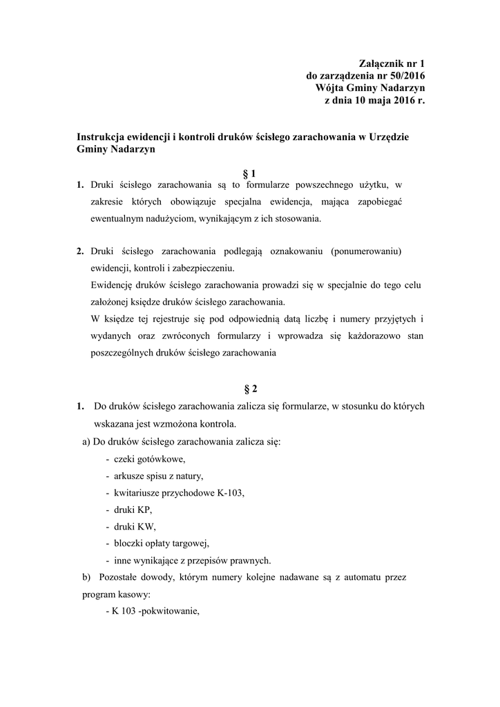 Załącznik nr 1 do zarządzenia nr 50/2016 Wójta Gminy Nadarzyn z dnia 10 maja 2016 r. Instrukcja ewidencji i kontroli druków ścisłego zarachowania w Urzędzie Gminy Nadarzyn §1 1. Druki ścisłego zarachowania są to formularze powszechnego użytku, w zakresie których obowiązuje specjalna ewidencja, mająca zapobiegać ewentualnym nadużyciom, wynikającym z ich stosowania. 2. Druki ścisłego zarachowania podlegają oznakowaniu (ponumerowaniu) ewidencji, kontroli i zabezpieczeniu. Ewidencję druków ścisłego zarachowania prowadzi się w specjalnie do tego celu założonej księdze druków ścisłego zarachowania. W księdze tej rejestruje się pod odpowiednią datą liczbę i numery przyjętych i wydanych oraz zwróconych formularzy i wprowadza się każdorazowo stan poszczególnych druków ścisłego zarachowania §2 1. Do druków ścisłego zarachowania zalicza się formularze, w stosunku do których wskazana jest wzmożona kontrola. a) Do druków ścisłego zarachowania zalicza się: - czeki gotówkowe, - arkusze spisu z natury, - kwitariusze przychodowe K-103, - druki KP, - druki KW, - bloczki opłaty targowej, - inne wynikające z przepisów prawnych. b) Pozostałe dowody, którym numery kolejne nadawane są z automatu przez program kasowy: - K 103 -pokwitowanie, 2. Dokładna ewidencja i kontrola obrotu tymi drukami stanowi podstawę gospodarki drukami ścisłego zarachowania. Ewidencja druków ścisłego zarachowania polega na: - przyjęciu druków ścisłego zarachowania niezwłocznie po ich otrzymaniu, - bieżącym wpisaniu przychodu, rozchodu druków w księdze druków ścisłego zarachowania. - oznaczeniu numerem ewidencyjnym druków nie posiadających serii i numerów nadanych przez drukarnię. 3. 1. Pracownikiem odpowiedzialnym za prawidłową gospodarkę, ewidencję i zabezpieczenie druków ścisłego zarachowania: - czeki gotówkowe, - pokwitowanie K103 - arkusze spisu z natury, jest kasjer Urzędu Gminy, 2. Pracownikiem odpowiedzialnym za prawidłową gospodarkę, ewidencję i zabezpieczenie druków ścisłego zarachowania: - kwitariusze przychodowe K-103 - druki KP - druki KW - bloczki opłaty targowej - inne wynikające z przepisów prawnych Jest pracownik Referatu Realizacji Podatków i Opłat wskazany przez Kierownika referatu. Urząd Gminy jest zobowiązany umożliwić pracownikom odpowiedzialnym za gospodarkę drukami ścisłego zarachowania należyte przechowywanie tych druków w miejscu zabezpieczonym przed kradzieżą lub zniszczeniem. 4. Do obowiązków pracowników, o których mowa w punkcie 3 należy: - nadanie numerów ewidencyjnych dowodom, które nie posiadają serii i numerów nadanych przez drukarnię. §3 1. Oznaczenia druków ścisłego zarachowania, które nie posiadają nadanych przez drukarnię serii i numerów, dokonuje się w niżej podany sposób; - każdy egzemplarz należy oznaczyć kolejnym numerem ewidencyjnym. 2. W przypadku druków broszurowych (w blokach) należy dodatkowo na okładce każdego bloku odnotować (dotyczy również druków posiadających serie i numery nadane w drukarni) ; - numer kolejny bloku, - numer kart bloku od nr......... do nr....... - liczbę kart każdego bloku poświadczoną podpisem osoby odpowiedzialnej za gospodarkę drukami ścisłego zarachowania. 3. Poszczególne bloki dowodów wpłaty i wypłaty należy ponumerować w momencie przyjęcia i zaprzychodować w księdze druków ścisłego zarachowania. Poszczególne karty bloków należy ponumerować bezpośrednio przed wydaniem ich do użytku, w celu zachowania ciągłości numerów w ciągu roku. Na okładce należy wpisać numery kart bloku. Po wyczerpaniu bloku, przy wydaniu następnego, na okładce należy wpisać okres, w którym druki zostały wykorzystane. Arkusze spisu z natury również traktuje się jako druki ścisłego zarachowania i przed ich wydaniem osobie upoważnionej do odbioru nadaje się kolejny numer i od tego momentu są drukami ścisłego zarachowania. 4. Niedopuszczalne jest wydawanie do użytku druków ścisłego zarachowania nie ujętych w ewidencji oraz nie posiadających wszystkich wymienionych wyżej oznaczeń. §4 1. Ewidencję wszystkich druków ścisłego zarachowania należy prowadzić odrębnie w miarę potrzeb w księdze o ponumerowanych stronach. Na ostatniej stronie księgi ewidencyjnej należy wpisać: księga zawiera ….. stron, słownie ………, kolejno ponumerowanych, a następnie zaopatrzyć podpisem osoby upoważnionej. 2. Podstawę zapisów w księdze druków ścisłego zarachowania stanowią: - dla przychodu – druki z nadanym numerem ewidencyjnym, - dla rozchodu – pokwitowanie osoby upoważnionej do odbioru druków, udokumentowane upoważnieniem i ewentualnie dowodem wydania. 3. Zapisy w księdze druków ścisłego zarachowania powinny być dokonywane czytelnie atramentem lub długopisem. Niedopuszczalne jest jakiekolwiek wycieranie, wyskrobywanie lub zamazywanie korektorem omyłkowych zapisów. Omyłkowy zapis należy przekreślić tak, aby można go było odczytać i wpisać prawidłowy. Osoba dokonująca poprawki powinna obok wniesionej poprawki umieścić swój podpis datę dokonania tej czynności (art. 22 ust. 3 ustawy o rachunkowości ). 4. Wydanie druków ścisłego zarachowania może nastąpić na podstawie pisemnego upoważnienia do ich pobrania zaakceptowanego przez Skarbnika Gminy lub osobę przez niego wskazaną. 5. Druki ścisłego zarachowania, księgi ewidencyjne, protokoły przyjęcia i ocechowania oraz wszelką dokumentację dotyczącą gospodarki drukami ścisłego zarachowania (zapotrzebowania, rozliczenia itp.) należy przechowywać przez okres 10 lat. 6. Błędnie wypełnione druki powinny być anulowane przez adnotację „ Anulowano” wraz z datą i czytelnym podpisem osoby dokonującej tej czynności. Anulowane druki, o ile s ą broszurowane, należy pozostawić w bloku, a luźne druki należy przechowywać w przeznaczonym do tego celu segregatorze lub teczce. Czeki niewykor