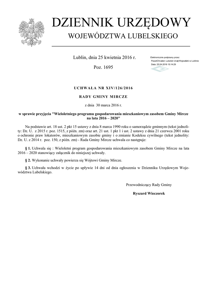 Uchwala Nr XIV/126/2016 z dnia 30 marca 2016 r.