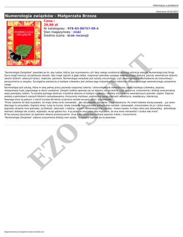 Informacje o produkcie Utworzono 03-03-2017 Numerologia związków - Małgorzata Brzoza Cena : 29,90 zł IA T Nr katalogowy : 978-83-86757-09-4 Stan magazynowy : niski Średnia ocena : brak recenzji EZ O ŚW "Numerologia Związków" powstała po to, aby ludzie, którzy (po zsumowaniu cyfr daty swego urodzenia) poznają wibrację własnej Numerologicznej Drogi Życia mogli tworzyć szczęśliwsze zwiazki. Aby mogli zajrzeć w głąb siebie, rozpoznać potrzeby swojego wewnętrznego dziecka, poznać wewnetrzne dziecko swoich bliskich: własnych dzieci, rodziców, partnera. Numerologia zwiazków jest sztuką zrozumienia, czyli pewnego etapu dochodzenia do komunikacji i porozumienia w związku. Szczegolną wartoscią w każdym człowieku jest zestaw jego indywidualnych talentów i indywidualnego wewnetrznego ustawienia uwagi. Numerologia jest sztuką, która w swej pełnej pracy pozwala rozpoznać talenty i ukierunkowanie wewnetrznej uwagi każdego czlowieka, poprzez interpretacje kodu zapisanego w dacie urodzenia. Związki ludzkie opieraja się na dążeniu do szcześcia, czyli wsparcia, zrozumienia i bliskiej emocjonalnej więzi pomiędzy ludźmi. Ta ksiażka pomaga dostrzec trzyletnie dziecko w każdym czowieku. Ułatwia zrozumienie wewnętrznych potrzeb i dążeń. Poprzez wiedzę o potrzebach naszych bliskich rozbudowujemy choryzonty myślowe, podnosimy swoją zdolność współżycia, współpracy, tolerancję. Pewnego dnia na jednym z moich kursów 60 letnia uczennica wstała wczasie zajęć i powiedziała: "Przez ostatnie 42 lata myslałam, że moja córka mnie nienawidzi. - Na sali zapadło milczenie. Cisza absolutna. Po chwili kobieta kontynuowała. - Już wiem dlaczego tu przyszłam. Dopiero teraz, tutaj na kursie, kiedy omówiła Pani potrzeby emocjinalne szóstek i dziewiątek, zrozumiałam że ja i córka mamy poprostu skrajnie inne potrzeby. Ja bliskość, obecność i rodzinę - jestem numerologiczną szóstką - mama kwoka. A moja córka jest dziewiatką - potrzebuje wolności dlatego tak ucieka, wyjeżdża, wciąż gdzieś leci. A ja przez te wszystkie lata myślałam, że ona mnie nienawidzi i ucieka ode mnie". W tej sytuacji poczułam że spełniam własne przeznaczenie. Uczę ludzi sztuki komunikacji poprzez miłośc i zrozumienie. "Numerologia Związków" ułatwia zrozumienie bliskiej nam osoby. Ta ksiażka wąłśnie po to powstała. Wygenerowano w programie www.oscGold.com