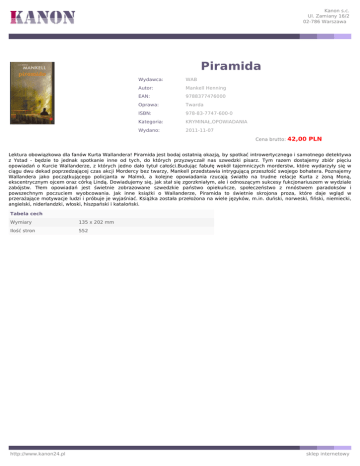 Kanon s.c. Ul. Zamiany 16/2 02-786 Warszawa Piramida Wydawca: WAB Autor: Mankell Henning EAN: 9788377476000 Oprawa: Twarda ISBN: 978-83-7747-600-0 Kategoria: KRYMINAŁ,OPOWIADANIA Wydano: 2011-11-07 Cena brutto: 42,00 PLN Lektura obowiązkowa dla fanów Kurta Wallandera! Piramida jest bodaj ostatnią okazją, by spotkać introwertycznego i samotnego detektywa z Ystad - będzie to jednak spotkanie inne od tych, do których przyzwyczaił nas szwedzki pisarz. Tym razem dostajemy zbiór pięciu opowiadań o Kurcie Wallanderze, z których jedno dało tytuł całości.Budując fabułę wokół tajemniczych morderstw, które wydarzyły się w ciągu dwu dekad poprzedzającej czas akcji Mordercy bez twarzy, Mankell przedstawia intrygującą przeszłość swojego bohatera. Poznajemy Wallandera jako początkującego policjanta w Malmö, a kolejne opowiadania rzucają światło na trudne relacje Kurta z żoną Moną, ekscentrycznym ojcem oraz córką Lindą. Dowiadujemy się, jak stał się zgorzkniałym, ale i odnoszącym sukcesy fukcjonariuszem w wydziale zabójstw. Tłem opowiadań jest świetnie zobrazowane szwedzkie państwo opiekuńcze, społeczeństwo z mnóstwem paradoksów i powszechnym poczuciem wyobcowania. Jak inne książki o Wallanderze, Piramida to świetnie skrojona proza, które daje wgląd w przerażające motywacje ludzi i próbuje je wyjaśniać. Książka została przełożona na wiele języków, m.in. duński, norweski, fiński, niemiecki, angielski, niderlandzki, włoski, hiszpański i kataloński. Tabela cech Wymiary 135 x 202 mm Ilość stron 552 http://www.kanon24.pl sklep internetowy