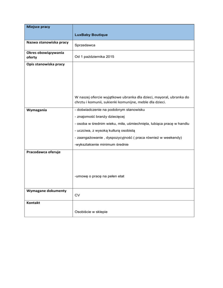 Miejsce pracy LuxBaby Boutique Nazwa stanowiska pracy Okres obowiązywania oferty Sprzedawca Od 1 października 2015 Opis stanowiska pracy W naszej ofercie wyjątkowe ubranka dla dzieci, mayoral, ubranka do chrztu i komunii, sukienki komunijne, meble dla dzieci. Wymagania - doświadczenie na podobnym stanowisku - znajomość branży dziecięcej - osoba w średnim wieku, miła, uśmiechnięta, lubiąca pracę w handlu - uczciwa, z wysoką kulturą osobistą - zaangażowanie , dyspozycyjność ( praca również w weekendy) -wykształcenie minimum średnie Pracodawca oferuje -umowę o pracę na pełen etat Wymagane dokumenty CV Kontakt Osobiście w sklepie