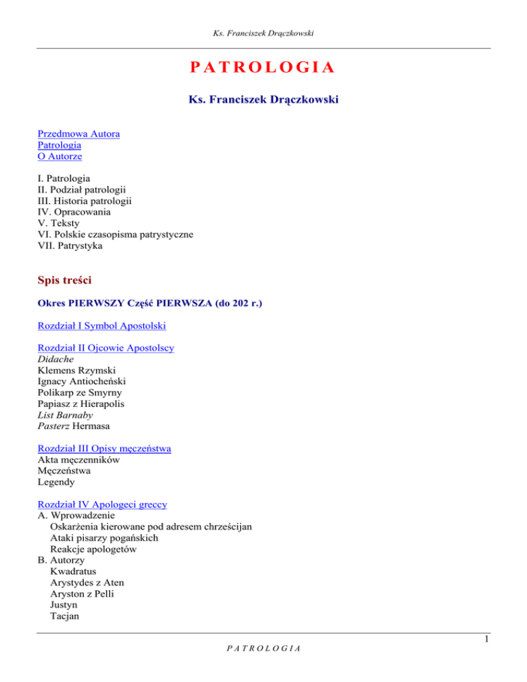 Ks. Franciszek Drączkowski PATROLOGIA Ks. Franciszek Drączkowski Przedmowa Autora Patrologia O Autorze I. Patrologia II. Podział patrologii III. Historia patrologii IV. Opracowania V. Teksty VI. Polskie czasopisma patrystyczne VII. Patrystyka Spis treści Okres PIERWSZY Część PIERWSZA (do 202 r.) Rozdział I Symbol Apostolski Rozdział II Ojcowie Apostolscy Didache Klemens Rzymski Ignacy Antiocheński Polikarp ze Smyrny Papiasz z Hierapolis List Barnaby Pasterz Hermasa Rozdział III Opisy męczeństwa Akta męczenników Męczeństwa Legendy Rozdział IV Apologeci greccy A. Wprowadzenie Oskarżenia kierowane pod adresem chrześcijan Ataki pisarzy pogańskich Reakcje apologetów B. Autorzy Kwadratus Arystydes z Aten Aryston z Pelli Justyn Tacjan PATROLOGIA 1 Ks. Franciszek Drączkowski Atenagoras z Aten Teofil z Antiochii Meliton z Sardes List do Diogneta Hermiasz Inni apologeci Rozdział V Zagrożenia błędnowierstwa Gnoza 1. Gnoza w ogólności 2. Gnoza ortodoksyjna 3. Gnoza fałszywa (heterodoksyjna) 4. Główne sekty gnostyckie Bazylidianie Walentynianie Karpokratianie Marcjonici Kasjanici Montanizm Rozdział VI Początki literatury antyheretyckiej Hegezyp Ireneusz z Lyonu Okres PIERWSZY Część DRUGA (202-235) Rozdział VII Środowisko aleksandryjskie Klemens Aleksandryjski Orygenes Rozdział VIII Środowisko afrykańskie Tertulian Cyprian Arnobiusz z Sikka Laktancjusz Rozdział IX Pisarze Azji Mniejszej, Syrii i Palestyny Szkoła w Cezarei Palestyńskiej Szkoła w Antiochii Grzegorz Cudotwórca Paweł z Samosaty Lucjan z Antiochii Metody z Olimpu Hipolit Statua Hipolita Rozdział X Środowisko rzymskie Minucjusz Feliks Kanon Muratoriego Nowacjan PATROLOGIA 2 Ks. Franciszek Drączkowski Rozdział XI Początki monastycyzmu Antoni Pustelnik Pachomiusz Okres DRUGI (325-451) Rozdział I Aleksandryjczycy i Egipcjanie Ariusz Atanazy Wielki Dydym Aleksandryjski Cyryl Aleksandryjski Ewagriusz z Pontu Palladiusz Apoftegmaty Rozdział II Pisarze Azji Mniejszej Ojcowie Kapadoccy Bazyli Wielki Grzegorz z Nazjanzu Grzegorz z Nyssy Rozdział III Pisarze Syrii i Palestyny Efrem Syryjski Euzebiusz z Cezarei Cyryl Jerozolimski Epifaniusz z Salaminy Diodor z Tarsu Teodor z Mopsuestii Jan Chryzostom Nestoriusz Rozdział IV Historycy kościelni Filip z Side Filostorgiusz Sokrates Historyk Sozomen Teodoret z Cyru Rozdział V Pisarze italscy Ambroży Euzebiusz z Vercelli Lucyferiusz z Calaris Rufin z Akwilei Hieronim Paulin z Noli Piotr Chryzolog Leon Wielki PATROLOGIA 3 Ks. Franciszek Drączkowski Rozdział VI Pisarze galijscy Hilary z Poitiers Jan Kasjan Prosper z Akwitanii Wincenty z Lerynu Rozdział VII Środowisko afrykańskie Augustyn Orozjusz Quodwultdeus Rozdział VIII Pisarze hiszpańscy Hozjusz Grzegorz z Elwiry Okres TRZECI (451-636 lub 749) Rozdział I Pisarze łacińscy Grzegorz Wielki Boecjusz Kasjodor Cezary z Arles Grzegorz z Tours Fulgencjusz z Ruspe Ildefons z Toledo Izydor z Sewilli Rozdział II Pisarze greccy Pseudo-Dionizy Areopagita Maksym Wyznawca Leoncjusz z Bizancjum Jan Damasceński PATROLOGIA 4 Ks. Franciszek Drączkowski Przedmowa Autora Od wielu już lat polskie środowisko akademickie zgłasza zapotrzebowanie na podręcznik patrologii, uwzględniający zdolność percepcji przeciętnego studenta. Istniejące opracowania w języku polskim można podzielić, generalnie rzecz biorąc, na dwie grupy. Do pierwszej należy zaliczyć, bardzo wartościowe i potrzebne skądinąd opracowania o charakterze encyklopedyczno-słownikowym, przeładowane bibliografią szczegółową (jak np. podręcznik B. Altanera, A. Stuibera) oraz ogromną ilością materiału faktograficznego, podanego w formie bardzo skondensowanej i lakonicznej (np. hasła w Encyklopedii Katolickiej i Słowniku wczesnochrześcijańskiego piśmiennictwa). Drugą skrajność stanowią równie cenne i potrzebne opracowania syntetyczne o charakterze wprowadzającym do studium Ojców Kościoła, traktujące wybiórczo bogaty materiał treściowy, o zbyt zredukowanej faktografii (jak np. Wprowadzenie do Ojców Kościoła, ks. A. Żurka). Opracowanie niniejsze, wybierając drogę pośrednią między wyżej wymienionymi, ma na celu przede wszystkim podanie podstawowego materiału z zakresu patrologii i patrystyki oraz, przez specyfikę formy podawczej, ułatwić jego zrozumienie i zapamiętanie. Jego istotnym novum jest wstęp ogólny, w którym obok podstawowych informacji dotyczących patrologii jako nauki oraz związanych z nią określeń: Ojcowie Kościoła i doktorzy Kościoła, podany został szkic ogólny całości materiału (niejako rzut oka na całość z “lotu ptaka”), ukazujący poszczególne okresy rozwoju patrologii z uwzględnieniem sukcesywnie powstających ośrodków myśli patrystycznej w określonych regionach geograficznych Cesarstwa Rzymskiego. Ponadto w omawianym wstępie zostały przedstawione dzieła pisarzy starożytnych stanowiące źródła do historii patrologii; najważniejsze współczesne opracowania podręcznikowe w języku polskim i w językach obcych; serie wydawnicze oryginalnych dzieł pisarzy wczesnochrześcijańskich oraz wiodące serie przekładów dzieł Ojców Kościoła wydane w języku polskim. Postanowiono więcej uwagi poświęcić biogramom poszczególnych pisarzy, z wyeksponowaniem cech charakterystycznych, ułatwiających zapamiętanie poszczególnych postaci. Nie wolno zapominać, że życie i działalność poszczególnych autorów w określonych uwarunkowaniach historyczno-doktrynalnych, wpływały z zasady w sposób decydujący na tematykę i rodzaj ich twórczości. Ojcowie Kościoła są żywi i ciągle do nas przemawiają żywym głosem poprzez swoje pisma. Z tej racji obcowanie z ich utworami jest niezbędne i niczym niezastąpione. Opracowania, które z założenia rezygnują z podania nawet najważniejszych wypowiedzi autorów starożytnych, stają się uczonymi informatorami trudnymi “do strawienia” przez studentów, którzy sarkastycznie zwykli je nazy