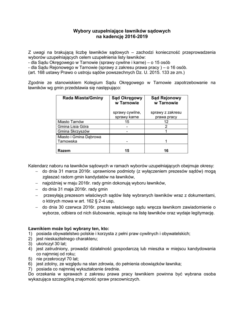 Wybory uzupełniające ławników sądowych na kadencję 2016-2019 Z uwagi na brakującą liczbę ławników sądowych – zachodzi konieczność przeprowadzenia wyborów uzupełniających celem uzupełnienia listy ławników: - dla Sądu Okręgowego w Tarnowie (sprawy cywilne i karne) – o 15 osób - dla Sądu Rejonowego w Tarnowie (sprawy z zakresu prawa pracy ) – o 16 osób. (art. 168 ustawy Prawo o ustroju sądów powszechnych Dz. U. 2015. 133 ze zm.) Zgodnie ze stanowiskiem Kolegium Sądu Okręgowego w Tarnowie zapotrzebowanie na ławników wg gmin przedstawia się następująco: Rada Miasta/Gminy Miasto Tarnów Gmina Lisia Góra Gmina Skrzyszów Miasto i Gmina Dąbrowa Tarnowska Razem Sąd Okręgowy w Tarnowie Sąd Rejonowy w Tarnowie sprawy cywilne, sprawy karne 15 - sprawy z zakresu prawa pracy 12 2 1 - 1 15 16 Kalendarz naboru na ławników sądowych w ramach wyborów uzupełniających obejmuje okresy: do dnia 31 marca 2016r. uprawnione podmioty (z wyłączeniem prezesów sądów) mogą zgłaszać radom gmin kandydatów na ławników, najpóźniej w maju 2016r. rady gmin dokonują wyboru ławników, do dnia 31 maja 2016r. rady gmin przesyłają prezesom właściwych sądów listę wybranych ławników wraz z dokumentami, o których mowa w art. 162 § 2-4 usp, do dnia 30 czerwca 2016r. prezes właściwego sądu wręcza ławnikom zawiadomienie o wyborze, odbiera od nich ślubowanie, wpisuje na listę ławników oraz wydaje legitymację. Ławnikiem może być wybrany ten, kto: 1) posiada obywatelstwo polskie i korzysta z pełni praw cywilnych i obywatelskich; 2) jest nieskazitelnego charakteru; 3) ukończył 30 lat; 4) jest zatrudniony, prowadzi działalność gospodarczą lub mieszka w miejscu kandydowania co najmniej od roku; 5) nie przekroczył 70 lat; 6) jest zdolny, ze względu na stan zdrowia, do pełnienia obowiązków ławnika; 7) posiada co najmniej wykształcenie średnie. Do orzekania w sprawach z zakresu prawa pracy ławnikiem powinna być wybrana osoba wykazująca szczególną znajomość spraw pracowniczych. Ławnikami nie mogą być: 1) osoby zatrudnione w sądach powszechnych i innych sądach oraz w prokuraturze; 2) osoby wchodzące w skład organów, od których orzeczenia można żądać skierowania sprawy na drogę postępowania sądowego; 3) funkcjonariusze Policji oraz inne osoby zajmujące stanowiska związane ze ściganiem przestępstw i wykroczeń; 4) adwokaci i aplikanci adwokaccy; 5) radcy prawni i aplikanci radcowscy; 6) duchowni; 7) żołnierze w czynnej służbie wojskowej; 8) funkcjonariusze Służby Więziennej; 9) radni gminy, powiatu i województwa. Nie można być ławnikiem jednocześnie w więcej niż jednym sądzie. Kandydatów na ławników mogą zgłaszać radom gmin, stowarzyszenia, inne organizacje społeczne i zawodowe, zarejestrowane na podstawie przepisów prawa, z wyłączeniem partii politycznych, oraz co najmniej pięćdziesięciu obywateli mających czynne prawo wyborcze, zamieszkujących stale na terenie gminy dokonującej wyboru. Zgłoszenie kandydatów na ławników dokonuje się na karcie zgłoszenia. Wzór karty zgłoszenia zawarty jest w Rozporządzeniu Ministra Sprawiedliwości z dnia 9 czerwca 2011 r. w sprawie sposobu postępowania z dokumentami złożonymi radom gmin przy zgłaszaniu kandydatów na ławników oraz wzoru karty zgłoszenia - Dz. U. z 2011 r., nr 121, poz. 693. Do karty zgłoszenia dołącza się następujące dokumenty: 1) informację o kandydacie z Krajowego Rejestru Karnego, 2) oświadczenie kandydata, że nie jest prowadzone przeciwko niemu postępowanie o przestępstwo ścigane z oskarżenia publicznego lub przestępstwo skarbowe, 3) oświadczenie kandydata, że nie jest lub nie był pozbawiony władzy rodzicielskiej, a także, że władza rodzicielska nie została mu ograniczona ani zawieszona, 4) zaświadczenie lekarskie o stanie zdrowia kandydata, wystawione przez lekarza podstawowej opieki zdrowotnej w rozumieniu przepisów o świadczeniach opieki zdrowotnej finansowanych ze środków publicznych (Dz. U. z 2008r., Nr 164, poz. 1027 z późn. zm.), stwierdzające brak przeciwwskazań do wykonywania funkcji ławnika, 5) dwa aktualne zdjęcia zgodnie z wymaganiami stosowanymi przy składaniu wniosku o wydawanie dowodu osobistego. Wymienione dokumenty powinny być opatrzone datą nie wcześniejszą niż trzydzieści dni przed dniem zgłoszenia. Dodatkowo do karty zgłoszenia należy dołączyć: aktualny odpis z Krajowego Rejestru Sądowego albo odpis lub zaświadczenie potwierdzające wpis do innego właściwego rejestru lub ewidencji - jeśli kandydata zgłasza stowarzyszenie lub inna organizacja społeczna lub zawodowa, zarejestrowana na podstawie przepisów prawa. Dokumenty te powinny być opatrzone datą nie wcześniejszą, niż 3 m-ce przed dniem zgłoszenia. imienną listę osób zgłaszających kandydata wraz z podaniem ich numeru PESEL, miejsca stałego zamieszkania i własnoręcznym podpisem każdej z tych osób - gdy zgłoszenia kandydata na ławnika dokonuje grupa pięćdziesięciu obywateli. Osobą uprawnioną do składania wyjaśnień w sprawie zgłoszenia kandydata jest osoba, której nazwisko zostało umieszczone jako pierwsze na liście. Zgodnie z art. 162 § 7 usp koszt opłaty za wydanie informacji z Krajowego Rejestru Karnego oraz opłaty za badanie lekarskie i za wystawienie zaświadczenia lekarskiego ponosi kandydat na ławnika. Zgodnie z art. 162 § 8 usp koszt opłaty za wydanie aktualnego odpisu z Krajowego Rejestru Sądowego albo odpisu lub zaświadczenia z innego właściwego rejestru lub ewidencji ponosi podmiot, którego dotyczy odpis lub zaświadczenie.