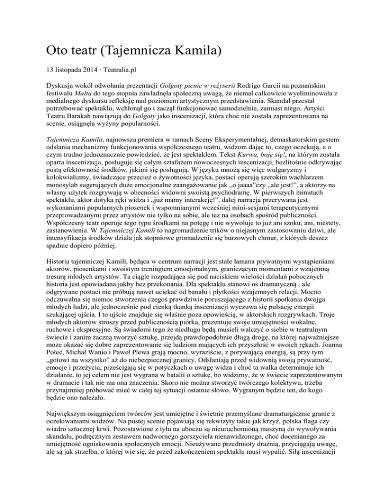 Oto teatr (Tajemnicza Kamila) 13 listopada 2014 · Teatralia.pl Dyskusja wokół odwołania prezentacji Golgoty picnic w reżyserii Rodrigo Garcíi na poznańskim festiwalu Malta do tego stopnia zawładnęła społeczną uwagą, że niemal całkowicie wyeliminowała z medialnego dyskursu refleksję nad poziomem artystycznym przedstawienia. Skandal przestał potrzebować spektaklu, wchłonął go i zaczął funkcjonować samodzielnie, zamiast niego. Artyści Teatru Barakah nawiązują do Golgoty jako inscenizacji, która choć nie została zaprezentowana na scenie, osiągnęła wyżyny popularności. Tajemnicza Kamila, najnowsza premiera w ramach Sceny Eksperymentalnej, demaskatorskim gestem odsłania mechanizmy funkcjonowania współczesnego teatru, widzom dając to, czego oczekują, a o czym trudno jednoznacznie powiedzieć, że jest spektaklem. Tekst Kurwa, boję się!, na którym została oparta inscenizacja, posługuje się całym sztafażem nowoczesnych inscenizacji, bezlitośnie odkrywając pustą efektowność środków, jakimi się posługują. W języku mnożą się więc wulgaryzmy i kolokwializmy, świadczące przecież o żywotności języka, postaci operują szerokim wachlarzem monosylab sugerujących duże emocjonalne zaangażowanie jak „o jaaaa”czy „ale jest!”, a aktorzy na własny użytek rozgrywają w obecności widowni swoistą psychodramę. W pierwszych minutach spektaklu, aktor dotyka ręki widza i „już mamy interakcję!”, dalej narracja przerywana jest wykonaniami popularnych piosenek i wspomnianymi wcześniej mini-sesjami terapeutycznymi przeprowadzanymi przez artystów nie tylko na sobie, ale tez na osobach spośród publiczności. Współczesny teatr operuje tego typu środkami na potęgę i nie wywołuje to już ani szoku, ani, niestety, zastanowienia. W Tajemniczej Kamili to nagromadzenie trików o niejasnym zastosowaniu dziwi, ale intensyfikacja środków działa jak stopniowe gromadzenie się burzowych chmur, z których deszcz spadnie dopiero później. Historia tajemniczej Kamili, będąca w centrum narracji jest stale łamana prywatnymi wystąpieniami aktorów, piosenkami i swoistym treningiem emocjonalnym, graniczącym momentami z wzajemną tresurą młodych artystów. Ta ciągle rozpadająca się pod naciskiem wielości działań pobocznych historia jest opowiadana jakby bez przekonania. Dla spektaklu stanowi oś dramatyczną , ale odgrywane postaci nie próbują nawet uciekać od banału i płytkości wzajemnych relacji. Mocno odczuwalna się niemoc stworzenia czegoś prawdziwie poruszającego z historii spotkania dwojga młodych ludzi, ale jednocześnie pod cienką tkanką inscenizacji wyczuwa się pulsację energii szukającej ujścia. I to ujście znajduje się właśnie poza opowieścią, w aktorskich rozgrywkach. Troje młodych aktorów stroszy przed publicznością piórka, prezentuje swoje umiejętności wokalne, ruchowe i ekspresyjne. Są świadomi tego że niedługo będą musieli walczyć o siebie w teatralnym świecie i zanim zaczną tworzyć sztukę, przejdą prawdopodobnie długą drogę, na której najważniejsze może okazać się dobre zaprezentowanie się ludziom mających ich przyszłość w swoich rękach. Joanna Połeć, Michał Wanio i Paweł Plewa grają mocno, wyraziście, z porywającą energią, są przy tym „gotowi na wszystko” aż do niebezpiecznej granicy. Odsłaniają przed widownią swoją prywatność, emocje i przeżycia, prześcigają się w potyczkach o uwagę widza i choć ta walka determinuje ich działanie, to jej celem nie jest wygrana w batalii o sztukę, bo widzimy, że w świecie zaprezentowanym w dramacie i tak nie ma ona znaczenia. Skoro nie można stworzyć twórczego kolektywu, trzeba przynajmniej próbować mieć w całej tej sytuacji ostatnie słowo. Wygranym będzie ten, do kogo będzie ono należało. Największym osiągnięciem twórców jest umiejętne i świetnie przemyślane dramaturgicznie granie z oczekiwaniami widzów. Na pustej scenie pojawiają się rekwizyty takie jak krzyż, polska flaga czy wiadro sztucznej krwi. Pozostawione z tyłu na uboczu są nieuruchomioną maszyną do wywoływania skandalu, podręcznym zestawem nadwornego gorszyciela nienawidzonego, choć docenianego za umiejętność ogniskowania społecznych emocji. Nieużywane przedmioty drażnią, przyciągają uwagę, ale są jak strzelba, o której wie się, że przed zakończeniem spektaklu musi wypalić. Siłą inscenizacji Barakah jest bezkompromisowe stawianie współczesnemu teatrowi brutalnej diagnozy, że w bardzo małym stopniu chodzi w nim dzisiaj o sztukę. Przedstawienie ma subwersywny potencjał i energię ludzi wierzących w sprawczą moc swojego działania, działania na teatralnym polu bitwy. Artyści teatru na Paulińskiej zgotowali odwiedzającym ich widzom sporą niespodziankę, służącą jednak konkretnemu celowi: odważnej wypowiedzi, która zostanie przez publiczność potraktowana poważnie i przemyślana. Zuzanna Berendt, Teatralia Kraków Internetowy Magazyn „Teatralia” 114/2014 Teatr Barakah w Krakowie Tajemnicza Kamila reżyseria: reżyser obsada: aktorzy scenografia i muzyka: artyści Teatru Barakah premiera: 17 października 2014 Zuzanna Berendt, rocznik 1994, studentka wiedzy o teatrze UJ, w wolnych chwilach podróżująca do Gdańska (koniecznie z książką!), skąd pochodzi i w którym zaczął się dla niej teatr.