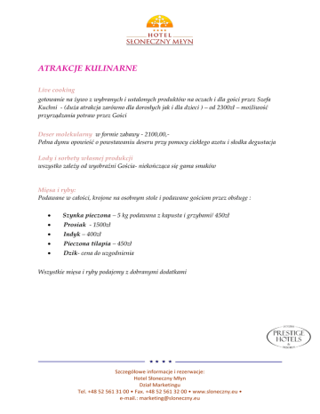 ATRAKCJE KULINARNE Live cooking gotowanie na żywo z wybranych i ustalonych produktów na oczach i dla gości przez Szefa Kuchni - (duża atrakcja zarówno dla dorosłych jak i dla dzieci ) – od 2300zł – możliwość przyrządzania potraw przez Gości Deser molekularny w formie zabawy - 2100,00,Pełna dymu opowieść o powstawaniu deseru przy pomocy ciekłego azotu i słodka degustacja Lody i sorbety własnej produkcji wszystko zależy od wyobraźni Gościa- niekończąca się gama smaków Mięsa i ryby: Podawane w całości, krojone na osobnym stole i podawane gościom przez obsługę : Szynka pieczona – 5 kg podawana z kapusta i grzybami/ 450zł Prosiak - 1500zł Indyk – 400zł Pieczona tilapia – 450zł Dzik- cena do uzgodnienia Wszystkie mięsa i ryby podajemy z dobranymi dodatkami Szczegółowe informacje i rezerwacje: Hotel Słoneczny Młyn Dział Marketingu Tel. +48 52 561 31 00 • Fax. +48 52 561 32 00 • www.sloneczny.eu • e-mail.: [email protected]