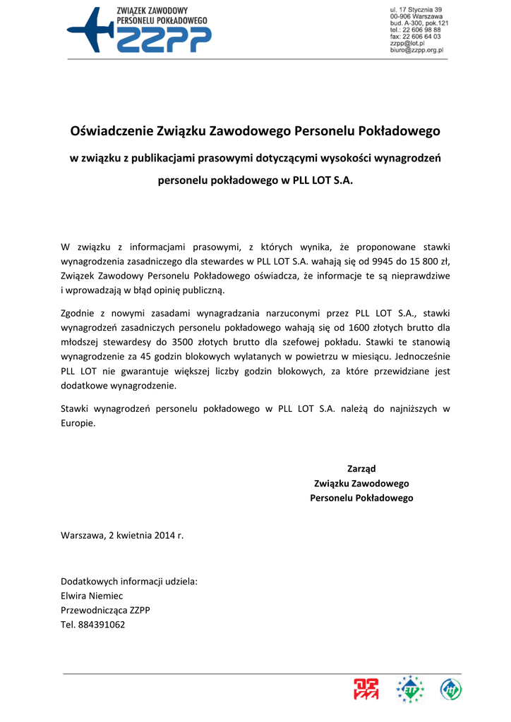 Oświadczenie Związku Zawodowego Personelu Pokładowego w związku z publikacjami prasowymi dotyczącymi wysokości wynagrodzeń personelu pokładowego w PLL LOT S.A. W związku z informacjami prasowymi, z których wynika, że proponowane stawki wynagrodzenia zasadniczego dla stewardes w PLL LOT S.A. wahają się od 9945 do 15 800 zł, Związek Zawodowy Personelu Pokładowego oświadcza, że informacje te są nieprawdziwe i wprowadzają w błąd opinię publiczną. Zgodnie z nowymi zasadami wynagradzania narzuconymi przez PLL LOT S.A., stawki wynagrodzeń zasadniczych personelu pokładowego wahają się od 1600 złotych brutto dla młodszej stewardesy do 3500 złotych brutto dla szefowej pokładu. Stawki te stanowią wynagrodzenie za 45 godzin blokowych wylatanych w powietrzu w miesiącu. Jednocześnie PLL LOT nie gwarantuje większej liczby godzin blokowych, za które przewidziane jest dodatkowe wynagrodzenie. Stawki wynagrodzeń personelu pokładowego w PLL LOT S.A. należą do najniższych w Europie. Zarząd Związku Zawodowego Personelu Pokładowego Warszawa, 2 kwietnia 2014 r. Dodatkowych informacji udziela: Elwira Niemiec Przewodnicząca ZZPP Tel. 884391062