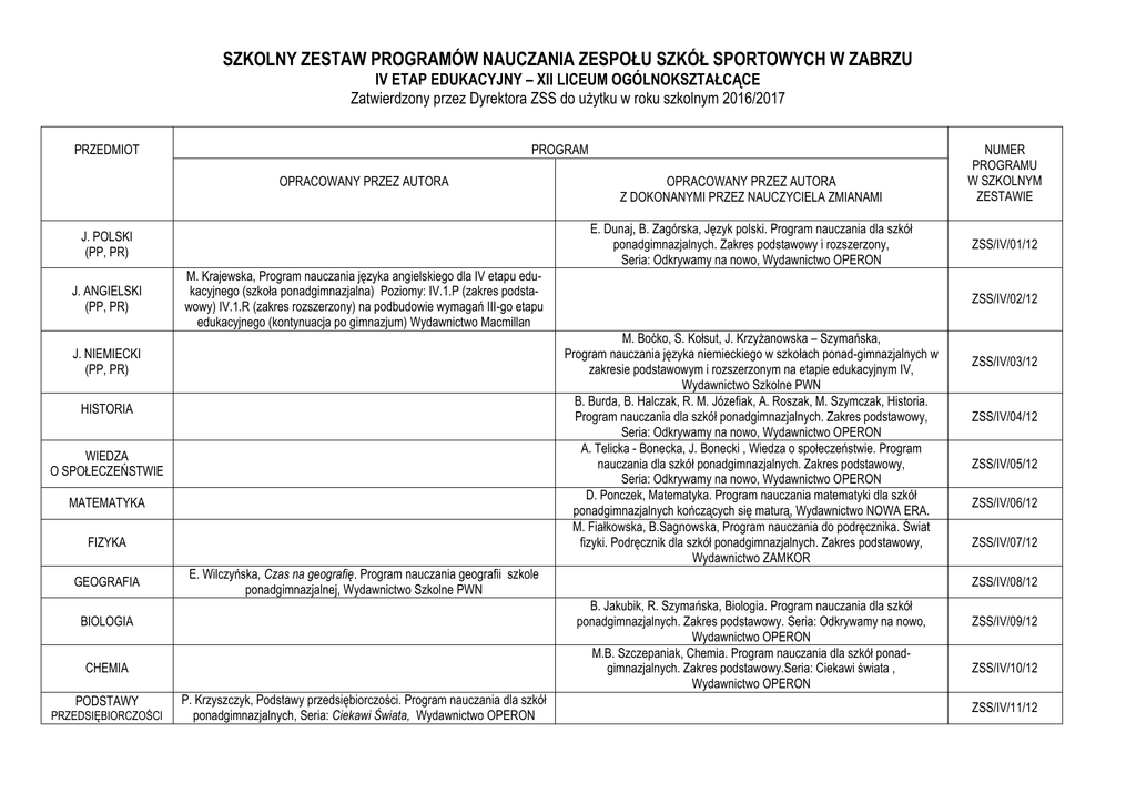 SZKOLNY ZESTAW PROGRAMÓW NAUCZANIA ZESPOŁU SZKÓŁ SPORTOWYCH W ZABRZU IV ETAP EDUKACYJNY – XII LICEUM OGÓLNOKSZTAŁCĄCE Zatwierdzony przez Dyrektora ZSS do użytku w roku szkolnym 2016/2017 PRZEDMIOT PROGRAM OPRACOWANY PRZEZ AUTORA J. POLSKI (PP, PR) J. ANGIELSKI (PP, PR) M. Krajewska, Program nauczania j zyka angielskiego dla IV etapu edukacyjnego (szkoła ponadgimnazjalna) Poziomy: IV.1.P (zakres podstawowy) IV.1.R (zakres rozszerzony) na podbudowie wymaga III-go etapu edukacyjnego (kontynuacja po gimnazjum) Wydawnictwo Macmillan J. NIEMIECKI (PP, PR) HISTORIA WIEDZA O SPOŁECZE STWIE MATEMATYKA FIZYKA GEOGRAFIA E. Wilczy ska, Czas na geografię. Program nauczania geografii szkole ponadgimnazjalnej, Wydawnictwo Szkolne PWN BIOLOGIA CHEMIA PODSTAWY PRZEDSI BIORCZO CI P. Krzyszczyk, Podstawy przedsi biorczo ci. Program nauczania dla szkół ponadgimnazjalnych, Seria: Ciekawi Świata, Wydawnictwo OPERON OPRACOWANY PRZEZ AUTORA Z DOKONANYMI PRZEZ NAUCZYCIELA ZMIANAMI E. Dunaj, B. Zagórska, J zyk polski. Program nauczania dla szkół ponadgimnazjalnych. Zakres podstawowy i rozszerzony, Seria: Odkrywamy na nowo, Wydawnictwo OPERON NUMER PROGRAMU W SZKOLNYM ZESTAWIE ZSS/IV/01/12 ZSS/IV/02/12 M. Boćko, S. Kołsut, J. Krzyżanowska – Szyma ska, Program nauczania j zyka niemieckiego w szkołach ponad-gimnazjalnych w zakresie podstawowym i rozszerzonym na etapie edukacyjnym IV, Wydawnictwo Szkolne PWN B. Burda, B. Halczak, R. M. Józefiak, A. Roszak, M. Szymczak, Historia. Program nauczania dla szkół ponadgimnazjalnych. Zakres podstawowy, Seria: Odkrywamy na nowo, Wydawnictwo OPERON A. Telicka - Bonecka, J. Bonecki , Wiedza o społecze stwie. Program nauczania dla szkół ponadgimnazjalnych. Zakres podstawowy, Seria: Odkrywamy na nowo, Wydawnictwo OPERON D. Ponczek, Matematyka. Program nauczania matematyki dla szkół ponadgimnazjalnych ko czących si maturą, Wydawnictwo NOWA ERA. M. Fiałkowska, B.Sagnowska, Program nauczania do podr cznika. wiat fizyki. Podr cznik dla szkół ponadgimnazjalnych. Zakres podstawowy, Wydawnictwo ZAMKOR ZSS/IV/03/12 ZSS/IV/04/12 ZSS/IV/05/12 ZSS/IV/06/12 ZSS/IV/07/12 ZSS/IV/08/12 B. Jakubik, R. Szyma ska, Biologia. Program nauczania dla szkół ponadgimnazjalnych. Zakres podstawowy. Seria: Odkrywamy na nowo, Wydawnictwo OPERON M.B. Szczepaniak, Chemia. Program nauczania dla szkół ponadgimnazjalnych. Zakres podstawowy.SeriaŚ Ciekawi wiata , Wydawnictwo OPERON ZSS/IV/09/12 ZSS/IV/10/12 ZSS/IV/11/12 INFORMATYKA WIEDZA O KULTURZE EDUKACJA DLA BEZPIECZE STWA RELIGIA WYCHOWANIE FIZYCZNE BIOLOGIA (PR) PRZYRODA (przedmiot uzupełniający) WOS (PR) FIZYKA (PR) A. Gawełek, Informatyka. Program nauczania dla szkół ponadgimnazjalnych. Zakres podstawowy, Seria: Odkrywamy na nowo Wydawnictwo OPERON A. Prochyra, Wiedza o kulturze. Program nauczania dla szkół ponadgimnazjalnych, Seria: Ciekawi Świata, Wydawnictwo OPERON A. Nowak-Kowal, Edukacja dla bezpiecze stwa. Program nauczania dla szkół ponadgimnazjalnych, Seria: Odkrywamy na nowo, Wydawnictwo OPERON ks. T. miech, E. Kondrak, B. Nosek Żyć, aby wierzyć i kochać. Program nauczania dla liceum i technikum. Wydawnictwo Jedno ć M. Kmieć, Program wychowania fizycznego dla liceum ogólnokształcącego w Zespole Szkół Sportowych w Zabrzu ZSS/IV/12/12 ZSS/IV/13/12 ZSS/IV/14/12 ZSS/IV/01/13 ZSS/IV/05/14 J. Holeczek, Biologia. Program nauczania dla szkół ponadgimnazjalnych. Zakres rozszerzony. Seria: Odkrywamy na nowo, Wydawnictwo OPERON E. Jakubowska, M. Kaczmarzyk, J. Mrzigód, E. Tuz, Przyroda. Program nauczania przedmiotu uzupełniającego dla szkół ponadgimnazjalnych. Wydawnictwo NOWA ERA A. Telicka-Bonecka, J. Bonecki, Wiedza o społecze stwie. Program nauczania dla szkół ponadgimnazjalnych. Zakres rozszerzony, Seria: Odkrywamy na nowo, Wydawnictwo OPERON A. Byczuk, K.Byczuk, Z. Suwald, S. Suwald, Program nauczania fizyki dla szkół ponadgimnazjalnych (kształcenie ogólne w zakresie rozszerzonym) Wydawnictwa NOWA ERA ZSS/IV/02/13 (klasa II-III) ZSS/IV/01/14 (klasa II-III) ZSS/IV/03/14 (klasa II-III) ZSS/IV/04/14 (klasa III) HISTORIA I SPOŁECZE STWO K. Panimasz, Poznać przeszło ć. Program nauczania przedmiotu historia i społecze stwo. Dziedzictwo epok, Wydawnictwo NOWA ERA ZSS/IV/01/15 (klasa II-III) HISTORIA (PR) R. niegocki, Zrozumieć przeszło ć. Program nauczania do historii dla zakresu rozszerzonego liceum ogólnokształcące i technikum, Wydawnictwo NOWA ERA ZSS/IV/02/15 (klasa III) (przedmiot uzupełniający) Plan Wychowawczy Zespołu Szkół Sportowych im. Janusza Kusoci skiego w Zabrzu E. Szczecina, K. Wloka, A.Grzesiczek, A. Dydkowska, Szkolny Program Profilaktyczny Zespołu Szkół Sportowych im. Janusza Kusoci skiego w Zabrzu. E. Krauz, Program autorski j zyka angielskiego dla gimnazjum i liceum ogólnokształcącego jako przedmiotu uzupełniającego dla klas trenujących piłk r czną w Zespole Szkół Sportowych w Zabrzu ZSS/I-IV/01/10 ZSS/I-IV/02/10 ZSS/III-IV/01/16 01.09.2016r.