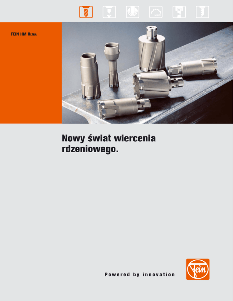 FEIN HM ULTRA Nowy świat wiercenia rdzeniowego. Wyznacza nowe standardy – wiercenie rdzeniowe przy użyciu systemów do wiercenia rdzeniowego firmy FEIN. Firma FEIN osiąga sukcesy rynkowe od ponad 20 lat, oferując innowacyjne wiertarki do wiercenia rdzeniowego, wiertła do wiercenia rdzeniowego i akcesoria. Nowości, takie jak np. system szybkomocujący QuickIN lub podwójna prowadnica o przekroju jaskółczego ogona wyznaczyły standardy w zakresie ekonomiczności, ergonomii, bezpieczeństwa i jakości pracy – czyniąc firmę FEIN liderem w zakresie jakości i innowacji. Wiodącą pozycję chcemy umocnić, prezentując nowe wiertła rdzeniowe FEIN HM ULTRA . 2 Wyjątkowa trwałość, wyjątkowa ekonomiczność. Wyjątkowa elastyczność – FEIN HM ULTRA. Wiertła rdzeniowe z nową geometrią ostrzy. Lepsze w każdym punkcie: Wyjątkowa trwałość: dzięki nowej geometrii ostrzy wiertła rdzeniowe FEIN HM ULTRA mają nawet o 100% większą trwałość, niż klasyczne wiertła rdzeniowe ze spieków. Wyjątkowa ekonomiczność: Wiertła rdzeniowe FEIN HM ULTRA zapewniają do 20% większą wydajność skrawania. Przez równoczesny kontakt większej liczby ostrzy z powierzchnią materiału. Wyjątkowa elastyczność: Wiertła rdzeniowe FEIN HM ULTRA znajdują zastosowanie we wszystkich typowych gatunkach stali, w stali szlachetnej i w metalach nieżelaznych. Wyjątkowy komfort: Wiertła rdzeniowe FEIN HM ULTRA wymagają mniejszego nacisku, co oszczędza siłę. A dzięki systemowi szybkomocującemu QuickIN wiertło rdzeniowe można wymieniać w ciągu kilku sekund – bez użycia narzędzi! Wyjątkowe bezpieczeństwo: dzięki nowej geometrii ostrzy powstają krótkie wióry. Zapewnia to lepszą obserwację obrabianego przedmiotu. Gwarantuje to bezpieczeństwo – dla operatora i dla materiału. 3 FEIN HM ULTRA – na okrągło większa wartość. Wyjątkowa żywotność: Wydłużenie żywotności nawet o 100% dzięki nowej geometrii ostrzy. Innowacja, opłacająca się pod względem żywotności i jakości pracy: z jednej strony znacznie zredukowane zostało obciążenie każdego ostrza, a z drugiej zapewnione zostało jego bardziej równomierne rozłożenie. Wynik: Wiertła rdzeniowe FEIN HM ULTRA są znacznie trwalsze od tradycyjnych wierteł rdzeniowych ze spieków. Skąd to wiemy? Przeprowadziliśmy odpowiednie testy: 380 FEIN HM ULTRA 190 Konkurenci ze spieków Liczba otworów 0 50 100 150 200 250 300 350 400 Warunki testowe: Przy przeciętnym wyniku konkurencyjnych produktów ze spieków, wynoszącym 190 otworów na wiertło rdzeniowe, wiertło FEIN HM ULTRA wykonało 380 otworów. Materiał: stal C 45, grubość 30 mm; średnica rury: 18 mm. Wyjątkowa ekonomiczność: Nowa geometria ostrzy zapewnia bardzo równomierny proces skrawania – i tym samym szczególnie dobry ubytek przy optymalnej jakości pracy. Wynik: Do 20% większa wydajność skrawania dzięki równoczesnej pracy ostrzy. Inaczej mówiąc: za pomocą wierteł rdzeniowych FEIN HM ULTRA można wykonać więcej prac w ciągu jednej roboczogodziny – polepszając w ten sposób swoją wydajność. 4 Wyjątkowa elastyczność: Wiertła rdzeniowe FEIN HM ULTRA są wysoko wyspecjalizowane: na uzyskanie optymalnego wyniku wiercenia rdzeniowego. I to we wszystkich typowych gatunkach stali, stali szlachetnej i metali nieżelaznych. Wiertło rdzeniowe FEIN HM ULTRA wykonuje zawsze bardzo dokładny otwór – nawet jeżeli nie napędza go wiertarka rdzeniowa FEIN. Wiertła rdzeniowe FEIN HM ULTRA są oczywiście dostępne z systemem szybkomocującym FEIN QuickIN oraz z gwintem M 18 FEIN lub z uchwytem Weldon. Wyjątkowy komfort: kombinacja HM ULTRA i QuickIN oferuje najwyższy komfort wiercenia rdzeniowego w każdym calu. Dzięki systemowi szybkomocującemu QuickIN wymiana narzędzi jest również wysoce komfortowa i oszczędna w czasie: wystarczy włożyć wiertło rdzeniowe, zaryglować i gotowe. Wyjątkowe bezpieczeństwo: Ostre ostrza, duże siły – wiertła FEIN HM ULTRA zapewniają przy tym większe bezpieczeństwo: nowa geometria ostrzy z podcięciem wytwarza krótkie wióry i szybciej transportuje je z wierconego otworu. Jest to podwójnie praktyczne: wiercone miejsce jest lepiej widoczne i praca jest bezpieczniejsza. 5 Opłacalna inwestycja – wiercenie rdzeniowe wiertłami FEIN HM ULTRA . O 40% ekonomiczniejsze od wiercenia pełnego. Wiercenie rdzeniowe jest bardzo ekonomiczną metodą: szybszą, cichszą i bardziej precyzyjną niż wiercenie pełne. Za pomocą wiercenia rdzeniowego można uzyskiwać duże średnice i przewiercać materiały o dużej grubości przy znacznie mniejszym zapotrzebowaniu mocy – w znacznie krótszym czasie. A ponieważ odpada konieczność wstępnego nawiercania i przezbrajania cała operacja jest o około 40% szybsza, a tym samym bardziej ekonomiczna niż wiercenie pełne. Wiertarka rdzeniowa w jednej operacji wykonuje wszystko to, do czego przy wierceniu pełnym potrzebne są cztery operacje robocze: napunktowanie, centrowanie, nawiercenie i wywiercenie gotowego otworu. Dzięki nowym wiertłom rdzeniowym FEIN HM ULTRA można teraz pracować jeszcze ekonomiczniej i wydajniej: wiertło FEIN HM ULTRA amortyzuje się już po ok. 40 otworach!* Odpowiednie wiertła rdzeniowe FEIN HM ULTRA w zestawie Zestaw wierteł rdzeniowych FEIN HM ULTRA : Zestawi wierteł rdzeniowych FEIN HM ULTRA : składający się z 4 wierteł rdzeniowych QuickINØ 18, 32, 40, 50 mm i kołka centrującego w walizeczce z tworzywa sztucznego. Do wiertarek rdzeniowych KBM 50 Q, 52 U. składający się z 4 wierteł rdzeniowych QuickINØ 14, 18, 22, 32 mm i kołka centrującego w walizeczce z tworzywa sztucznego. Do wiertarek rdzeniowych KBM 32 Q. Nr katalogowy Nr katalogowy 6 31 27 092 02 0 6 31 27 088 03 0 Wiertła rdzeniowe FEIN w porównaniu Material alu alu stal stal stal stal stal Hardox/Weldox INOX Ti GG(G) CuZn < 10% Si > 10% Si < 500 < 750 < 900 < 1100 < 1200 < 45 HRC < 1200 < 1200 < 900 < 700 HSS-Co (konk