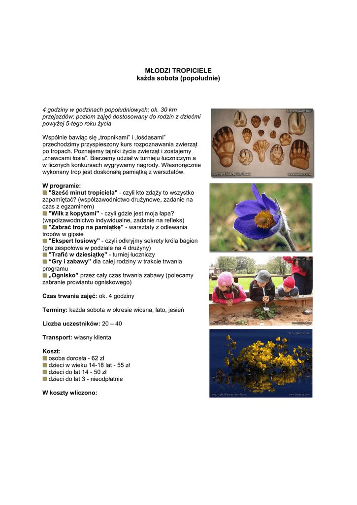 MŁODZI TROPICIELE każda sobota (popołudnie) 4 godziny w godzinach popołudniowych; ok. 30 km przejazdów; poziom zajęć dostosowany do rodzin z dziećmi powyżej 5-tego roku życia Wspólnie bawiąc się „tropnikami” i „łośdasami” przechodzimy przyspieszony kurs rozpoznawania zwierząt po tropach. Poznajemy tajniki życia zwierząt i zostajemy „znawcami łosia”. Bierzemy udział w turnieju łuczniczym a w licznych konkursach wygrywamy nagrody. Własnoręcznie wykonany trop jest doskonałą pamiątką z warsztatów. W programie: "Sześć minut tropiciela" - czyli kto zdąży to wszystko zapamiętać? (współzawodnictwo drużynowe, zadanie na czas z egzaminem) "Wilk z kopytami" - czyli gdzie jest moja łapa? (współzawodnictwo indywidualne, zadanie na refleks) "Zabrać trop na pamiątkę" - warsztaty z odlewania tropów w gipsie "Ekspert łosiowy" - czyli odkryjmy sekrety króla bagien (gra zespołowa w podziale na 4 drużyny) "Trafić w dziesiątkę" - turniej łuczniczy “Gry i zabawy” dla całej rodziny w trakcie trwania programu „Ognisko” przez cały czas trwania zabawy (polecamy zabranie prowiantu ogniskowego) Czas trwania zajęć: ok. 4 godziny Terminy: każda sobota w okresie wiosna, lato, jesień Liczba uczestników: 20 – 40 Transport: własny klienta Koszt: osoba dorosła - 62 zł dzieci w wieku 14-18 lat - 55 zł dzieci do lat 14 - 50 zł dzieci do lat 3 - nieodpłatnie W koszty wliczono: prowadzenie zajęć edukacyjnych przez trenera przyrody pomoce dydaktyczne liczne materiały do zajęć gry, zabawy i animacje z dziećmi drobne nagrody dla wszystkich uczestników zajęć – upominki firmowe podatek VAT Miejsce spotkania: parking przed siedzibą Biebrzańskiego Parku Narodowego w Osowcu Twierdzy Jak należy przygotować się do zajęć? Polecamy zabranie prowiantu dla najmłodszych dzieci. Wiosną należy zaopatrzyć się w środki odstraszające owady. W upalne dni wskazane jest zabranie ze sobą: wody, czapki i kremu z filtrem od słońca. Osobom lubiącym kameralną atmosferę wypraw proponujemy podobny pakiet w wersji na wyłączność w innych terminach. Sprawdź dostępność miejsc w wybranym terminie wypełniając zapytanie przez formularz.
