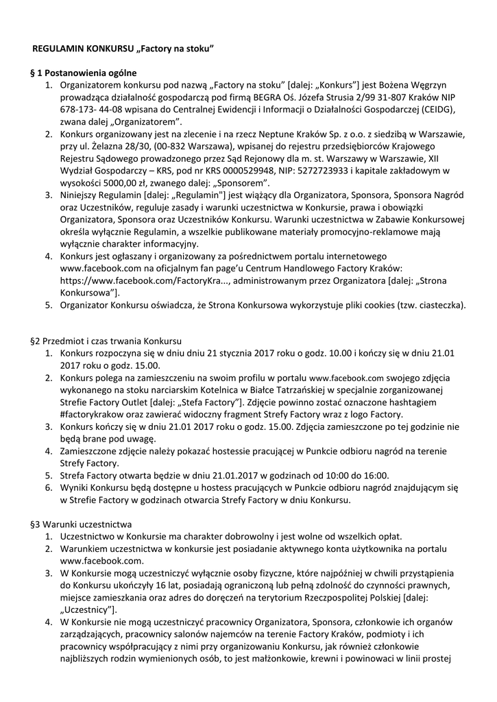 REGULAMIN KONKURSU „Factory na stoku” § 1 Postanowienia ogólne 1. Organizatorem konkursu pod nazwą „Factory na stoku” [dalej: „Konkurs”] jest Bożena Węgrzyn prowadząca działalność gospodarczą pod firmą BEGRA Oś. Józefa Strusia 2/99 31-807 Kraków NIP 678-173- 44-08 wpisana do Centralnej Ewidencji i Informacji o Działalności Gospodarczej (CEIDG), zwana dalej „Organizatorem”. 2. Konkurs organizowany jest na zlecenie i na rzecz Neptune Kraków Sp. z o.o. z siedzibą w Warszawie, przy ul. Żelazna 28/30, (00-832 Warszawa), wpisanej do rejestru przedsiębiorców Krajowego Rejestru Sądowego prowadzonego przez Sąd Rejonowy dla m. st. Warszawy w Warszawie, XII Wydział Gospodarczy – KRS, pod nr KRS 0000529948, NIP: 5272723933 i kapitale zakładowym w wysokości 5000,00 zł, zwanego dalej: „Sponsorem”. 3. Niniejszy Regulamin [dalej: „Regulamin"] jest wiążący dla Organizatora, Sponsora, Sponsora Nagród oraz Uczestników, reguluje zasady i warunki uczestnictwa w Konkursie, prawa i obowiązki Organizatora, Sponsora oraz Uczestników Konkursu. Warunki uczestnictwa w Zabawie Konkursowej określa wyłącznie Regulamin, a wszelkie publikowane materiały promocyjno-reklamowe mają wyłącznie charakter informacyjny. 4. Konkurs jest ogłaszany i organizowany za pośrednictwem portalu internetowego www.facebook.com na oficjalnym fan page’u Centrum Handlowego Factory Kraków: https://www.facebook.com/FactoryKra..., administrowanym przez Organizatora [dalej: „Strona Konkursowa”]. 5. Organizator Konkursu oświadcza, że Strona Konkursowa wykorzystuje pliki cookies (tzw. ciasteczka). §2 Przedmiot i czas trwania Konkursu 1. Konkurs rozpoczyna się w dniu dniu 21 stycznia 2017 roku o godz. 10.00 i kończy się w dniu 21.01 2017 roku o godz. 15.00. 2. Konkurs polega na zamieszczeniu na swoim profilu w portalu www.facebook.com swojego zdjęcia wykonanego na stoku narciarskim Kotelnica w Białce Tatrzańskiej w specjalnie zorganizowanej Strefie Factory Outlet [dalej: „Stefa Factory”]. Zdjęcie powinno zostać oznaczone hashtagiem #factorykrakow oraz zawierać widoczny fragment Strefy Factory wraz z logo Factory. 3. Konkurs kończy się w dniu 21.01 2017 roku o godz. 15.00. Zdjęcia zamieszczone po tej godzinie nie będą brane pod uwagę. 4. Zamieszczone zdjęcie należy pokazać hostessie pracującej w Punkcie odbioru nagród na terenie Strefy Factory. 5. Strefa Factory otwarta będzie w dniu 21.01.2017 w godzinach od 10:00 do 16:00. 6. Wyniki Konkursu będą dostępne u hostess pracujących w Punkcie odbioru nagród znajdującym się w Strefie Factory w godzinach otwarcia Strefy Factory w dniu Konkursu. §3 Warunki uczestnictwa 1. Uczestnictwo w Konkursie ma charakter dobrowolny i jest wolne od wszelkich opłat. 2. Warunkiem uczestnictwa w konkursie jest posiadanie aktywnego konta użytkownika na portalu www.facebook.com. 3. W Konkursie mogą uczestniczyć wyłącznie osoby fizyczne, które najpóźniej w chwili przystąpienia do Konkursu ukończyły 16 lat, posiadają ograniczoną lub pełną zdolność do czynności prawnych, miejsce zamieszkania oraz adres do doręczeń na terytorium Rzeczpospolitej Polskiej [dalej: „Uczestnicy”]. 4. W Konkursie nie mogą uczestniczyć pracownicy Organizatora, Sponsora, członkowie ich organów zarządzających, pracownicy salonów najemców na terenie Factory Kraków, podmioty i ich pracownicy współpracujący z nimi przy organizowaniu Konkursu, jak również członkowie najbliższych rodzin wymienionych osób, to jest małżonkowie, krewni i powinowaci w linii prostej (np. rodzice, dzieci, dziadkowie, wnuki), ich przysposobieni lub przysposabiający, a także rodzeństwo. 5. Warunkiem otrzymania nagrody jest spełnienie przez Uczestnika wszystkich postanowień niniejszego Regulaminu. §4 Zasady Konkursu 1. Osoba, która spełnia warunki określone w §3 ust.2-3, przystępuje do Konkursu poprzez zamieszczenie swojego zdjęcia z Strefy Factory z widocznym logo Factory. Zdjęcie podpisane powinno być hashtagiem #factorykrakow i zamieszczone przy użyciu własnego konta użytkownika na portalu www.facebook.com, w terminie wskazanym w §2 ust.1 [dalej „Zgłoszenie”]. 2. Prawidłowe wykonanie czynności określonych w ust. 1 skutkuje uczestnictwem w Konkursie. 3. Każdy Uczestnik Konkursu może wziąć udział w Konkursie dowolną liczbę razy, nagroda w Konkursie przyznawana jest jednak jednokrotnie. 4. Wysłanie Zgłoszenia jest jednoznaczne z akceptacją Regulaminu. 5. W celu wyjaśnienia wątpliwości związanych z udziałem Uczestnika w Konkursie, Organizator może kontaktować się z Uczestnikiem za pośrednictwem portalu www.facebook.com oraz żądać podania szczegółowych informacji wyłącznie związanych z jego udziałem w Konkursie, w tym złożenia oświadczenia o określonej formie i treści oraz przedstawienia stosownych dokumentów. 6. Organizator zastrzega sobie prawo do odrzucenia Zgłoszeń, których treść jest niezgodna z prawem lub dobrymi obyczajami, w szczególności, jeżeli zdjęcie jest obraźliwe, wulgarne, nieprzyzwoite, obrażające uczucia religijne, obyczajowe lub narodowe, naruszające obowiązujące normy prawne, moralne, propagujące przemoc, alkohol lub narkotyki, a także mogące naruszać dobra osobiste jakiejkolwiek osoby albo prawa autorskie lub pokrewne osoby trzeciej. 7. Nadesłane przez Uczestników Zgłoszenia będą oceniane przez Jury konkursu składające się z trzech osób, będących przedstawicielami Organizatora. Jury wybiera łącznie 50 pierwszych zgłoszeń w danej godzinie zegarowej zgodnie z ustępem poprzedzającym, w ciągu danej godziny zegarowej, tj: I. 11.00 – 12.00 – 50 pierwszych zgłoszeń II. 12.00 – 13.00 – 50 pierwszych zgłoszeń III. 13.00 – 14.00 – 50 pierwszych zgłoszeń IV. 14.00 – 15.00 – 50 pierwszych zgłoszeń dokonując oceny zdjęcia (wykonania Zgłoszenia) na podstawie godziny dodania posta oraz autentyczności pochodz