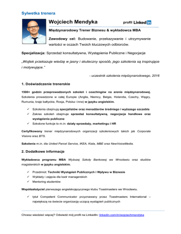 Sylwetka trenera Wojciech Mendyka profil Międzynarodowy Trener Biznesu & wykładowca MBA Zawodowy cel: Budowanie, przekazywanie i utrzymywanie wartości w oczach Twoich kluczowych odbiorców. Specjalizacja: Sprzedaż konsultatywna, Wystąpienia Publiczne i Negocjacje „Wojtek przekazuje wiedzę w jasny i skuteczny sposób, jego szkolenia są inspirujące i motywujące.” - uczestnik szkolenia międzynarodowego, 2016 1. Doświadczenie trenerskie 1500+ godzin przeprowadzonych szkoleń i coachingów na arenie międzynarodowej. Szkolenia prowadzone w całej Europie (Anglia, Niemcy, Belgia, Holandia, Czechy, Węgry, Rumunia, kraje bałtyckie, Rosja, Polska i inne) w języku angielskim. Szkolenia obejmują specjalistów oraz menadżerów średniego i wyższego szczebla Zakres szkoleń obejmuje sprzedaż konsultatywną, negocjacje handlowe oraz wystąpienia publiczne Szkolone funkcje to m.in: działy sprzedaży, marketingu i HR Certyfikowany trener międzynarodowych organizacji szkoleniowych takich jak Corporate Visions oraz BTS. Szkolenia m.in. dla United Parcel Service, IKEA, Kiala, MBE oraz NewVoiceMedia. 2. Dodatkowe informacje Wykładowca programu MBA Wyższej Szkoły Bankowej we Wrocławiu oraz studiów magisterskich w języku angielskim. Przedmiot: Techniki Wystąpień Publicznych i Wpływu w Biznesie Wykłady i zajęcia dla kadr managerskich Mentoring studentów Współzałożyciel pierwszego angielskojęzycznego klubu Toastmasters we Wrocławiu. tytuł Competent Communicator przyznawany przez Toastmasters International – największą na świecie organizację uczącą wystąpień publicznych Chcesz wiedzieć więcej? Odwiedź mój profil na LinkedIn: linkedin.com/in/wojciechmendyka
