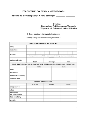 ZGŁOSZENIE DO SZKOŁY OBWODOWEJ dziecka do pierwszej klasy w roku szkolnym __________-__________. Dyrektor Gimnazjum Publicznego w Wąsowie Wąsowo, ul. Szkolna 2, 64-316 Kuślin I. Dane osobowe kandydata i rodziców (Tabelę naleŜy wypełnić drukowanymi literami ) DANE IDENTYFIKACYJNE DZIECKA imię nazwisko PESEL W przypadku braku numeru PESEL – seria i nr paszportu lub innego dokumentu potwierdzającego toŜsamość. data urodzenia dzień miesiąc rok DANE IDENTYFIKACYJNE I KONTAKTOWE RODZICÓW LUB OPIEKUNÓW PRAWNYCH matka ojciec imię nazwisko telefon kontaktowy adres e-mail ADRESY ZAMIESZKANIA dziecko matka ojciec miejscowość ulica nr domu / nr. mieszkania kod pocztowy poczta 1 Oświadczenie wnioskodawcy 1. Oświadczam, Ŝe podane we wniosku i załącznikach do wniosku dane są zgodne z aktualnym stanem faktycznym. 2. WyraŜam zgodę na przetwarzanie danych osobowych mojego dziecka zawartych w niniejszym wniosku i załącznikach do wniosku przez Gimnazjum Publiczne w Wąsowie, w zakresie obejmującym niezbędne dane do prawidłowego funkcjonowania szkoły i w celach realizacji zadań ustawowych szkoły oraz promowania jakości pracy szkoły, zgodnie z ustawą z dnia 29 sierpnia 1997 r. o ochronie danych osobowych (Dz. U. z 2014 r., Nr 1182, z późniejszymi zmianami). ………………………………….. Data ………………………………….. Czytelny podpis rodzica Załączniki do wniosku: NaleŜy dostarczyć w terminie do dnia 30 czerwca 1. Dane dodatkowe o kandydacie. 2. Świadectwo ukończenia Szkoły Podstawowej. 3. Zaświadczenie o wynikach Sprawdzianu po Szkole Podstawowej. 2