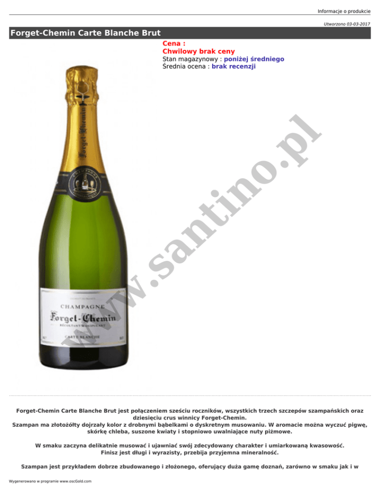 Informacje o produkcie Utworzono 03-03-2017 Forget-Chemin Carte Blanche Brut Cena : Chwilowy brak ceny w w w .s an t in o. pl Stan magazynowy : poniżej średniego Średnia ocena : brak recenzji Forget-Chemin Carte Blanche Brut jest połączeniem sześciu roczników, wszystkich trzech szczepów szampańskich oraz dziesięciu crus winnicy Forget-Chemin. Szampan ma złotożółty dojrzały kolor z drobnymi bąbelkami o dyskretnym musowaniu. W aromacie można wyczuć pigwę, skórkę chleba, suszone kwiaty i stopniowo uwalniające nuty piżmowe. W smaku zaczyna delikatnie musować i ujawniać swój zdecydowany charakter i umiarkowaną kwasowość. Finisz jest długi i wyrazisty, przebija przyjemna mineralność. Szampan jest przykładem dobrze zbudowanego i złożonego, oferujący duża gamę doznań, zarówno w smaku jak i w Wygenerowano w programie www.oscGold.com aromacie. W 2012 otrzymał złoty medal w Concours General Agricole de Paris oraz Concours des Vignerons Independants a także srebrnym medalistą w Concours des Vins de la Propriete. Dom Szampański Forget-Chemin powstał w 1930 roku, znajduje się na terenie Premier Cru – Ludes – Le – Coquet. Właśnie tutaj już od czterech pokoleń rodzina Forget zajmuje się uprawą winorośli i pełną gamą produkcji szampana. w w w .s an t in o. pl Roczna produkcja Maison to ok 100.000 butelek z czego tylko 5-10% trafia na eksport. Winnice Forget-Chemin zdominowane są przez szczep Pinot Meunier (68%), ale obecnie są tu również szczepy Pinot Noir (17%) oraz Chardonnay (14%).