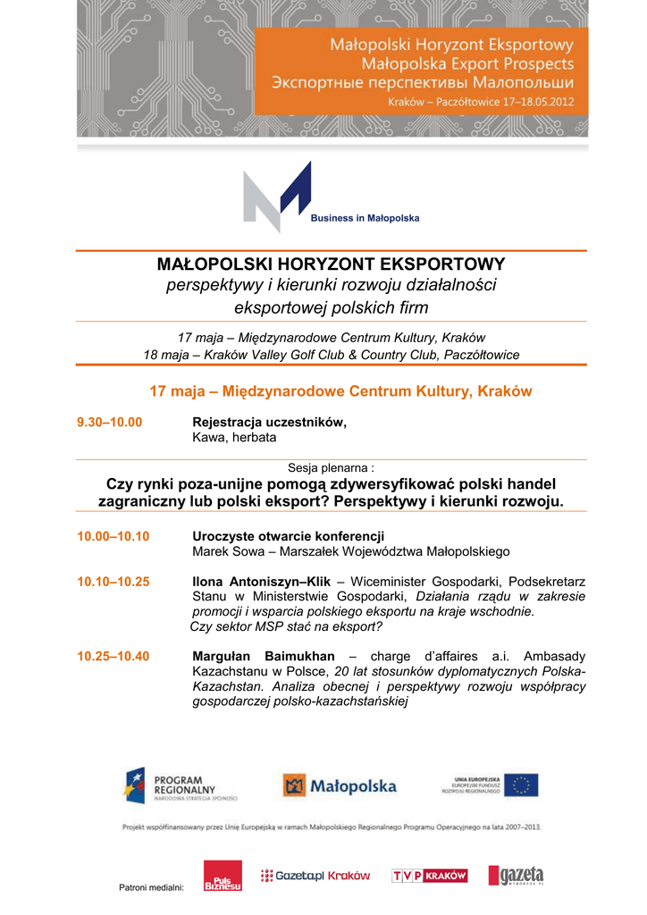 MAŁOPOLSKI HORYZONT EKSPORTOWY perspektywy i kierunki rozwoju działalności eksportowej polskich firm 17 maja – Międzynarodowe Centrum Kultury, Kraków 18 maja – Kraków Valley Golf Club & Country Club, Paczółtowice 17 maja – Międzynarodowe Centrum Kultury, Kraków 9.30–10.00 Rejestracja uczestników, Kawa, herbata Sesja plenarna : Czy rynki poza-unijne pomogą zdywersyfikować polski handel zagraniczny lub polski eksport? Perspektywy i kierunki rozwoju. 10.00–10.10 Uroczyste otwarcie konferencji Marek Sowa – Marszałek Województwa Małopolskiego 10.10–10.25 Ilona Antoniszyn–Klik – Wiceminister Gospodarki, Podsekretarz Stanu w Ministerstwie Gospodarki, Działania rządu w zakresie promocji i wsparcia polskiego eksportu na kraje wschodnie. Czy sektor MSP stać na eksport? 10.25–10.40 Margułan Baimukhan – charge d’affaires a.i. Ambasady Kazachstanu w Polsce, 20 lat stosunków dyplomatycznych PolskaKazachstan. Analiza obecnej i perspektywy rozwoju współpracy gospodarczej polsko-kazachstańskiej Patroni medialni: 10.40–10.55 BoŜena Lublińska–Kasprzak – Prezes Polskiej Agencji Rozwoju Przedsiębiorczości – Działania PARP jako odpowiedź na oczekiwania i potrzeby polskich eksporterów – perspektywa 2020. 10.55–11.10 Piotr Ciećwierz – Dyrektor w Departamencie Dyplomacji Ekonomicznej, Ministerstwo Spraw Zagranicznych, Ocena ryzyka eksportu na rynki pozaeuropejskie wg. MSZ 11.10–11.20 Wiesław Bury – Prezes Małopolskiej Agencji Rozwoju Regionalnego S.A. Instrumenty promocji eksportu w Małopolsce 11.20–12.00 Dyskusja moderowana przez dra Wojciecha Zyska z Uniwersytetu Ekonomicznego w Krakowie 12.00–14.00 Lunch; business mixer PANEL I A. Eksport do krajów Wspólnoty Niepodległych Państw – wielkie moŜliwości czy wielkie problemy? Paneliści: 1. prof. dr hab. Stanisław Wydymus – Uniwersytet Ekonomiczny w Krakowie (moderator) 2. Piotr Guzowski – Prezes Polsko – Kazachstańskiej Izby Handlowo Przemysłowej 3. Zbigniew Fryzowicz – Dyrektor Zarządu, Zakład Maszyn Górniczych „GLINIK” Sp. z o.o. 4. Wiesław Wojas – Prezes Zarządu, Wojas S.A. 5. Krzysztof Szupryczyński – Szef Działu Eksportu, Regis Sp. z o.o. Patroni medialni: Pozostali uczestnicy: Roman Dryps – koordynator Konsorcjum Platforma Bezpieczeństwa Gospodarczego; Wojciech Szczepanik – Wiceprezes MARR SA; przedstawiciel Krajowej Izby Gospodarczej Centrum Promocji 14.00–14.10 Informacje o gospodarkach krajów WNP, wymiana handlowa pomiędzy Polską (Małopolską) a tymi krajami – przedstawione przez eksperta z Uniwersytetu Ekonomicznego w Krakowie 14.10–14.20 Piotr Guzowski: Nisze rynkowe i szanse dla polskich firm w Kazachstanie 14.20–14.50 Wystąpienia trzech przedstawicieli firm z Małopolski, które działają na rynkach WNP: Wojas S.A., Regis Sp. z o.o., Glinik Sp. z o.o. 14.50–16.00 Pytania / dyskusja z udziałem publiczności 16.00–16.30 Przerwa kawowa PANEL I B. Eksport do Chin, Indii, Irackiego Kurdystanu – czy i jak polska firma moŜe zaistnieć na rynkach krajów o bardzo niskich kosztach produkcji? Paneliści: 1. dr Wojciech Zysk, Uniwersytet Ekonomiczny w Krakowie (moderator) 2. Ziyad Raoof – Przedstawiciel Regionalnego Rządu Irackiego Kurdystanu 3. Bartosz Komasa – Dyrektor, Bank of China 4. Darren Chong - Dyrektor, Connect Asia 5. Marek Pardyak – Dyrektor Zarządzający, Synergy Consulting Patroni medialni: Pozostali uczestnicy: dr Joanna Bocheńska – UJ; dr hab. Cezary Galewicz, UJ, przedstawiciel Krajowej Izby Gospodarczej Centrum Promocji 14.00–14.10 Informacje o gospodarkach krajów Chin, Indii, Irackiego Kurdystanu, wymiana handlowa pomiędzy Polską (Małopolską) a krajami Bliskiego i Dalekiego Wschodu – przedstawione przez eksperta z Uniwersytetu Ekonomicznego w Krakowie 14.10–14.20 Iracki Kurdystan – jak współpracować z Kurdami przy rozwoju tego chłonnego i otwartego rynku? Wystąpienie przedstawiciela Irackiego Kurdystanu 14.20–14.40 Prowadzenie biznesu w Chinach - wystąpienia przedstawiciela Bank of China oraz Connect Asia 14.40–15.00 Prezentacja doświadczeń firmy Synergy Consulting dot. eksportu towarów/usług 15.00–16.00 Dyskusja z udziałem publiczności 16.00–16.30 Przerwa kawowa Sesja plenarna 16.00–16.30 Podsumowanie i zakończenie I dnia konferencji 17.30–19.00 *** Spotkanie – kolacja (wymagane odrębne zaproszenie) Patroni medialni: 18 maja – Kraków Valley Golf Club & Country Club, Paczółtowice wyjazd zorganizowany do Paczółtowic: godzina 8.30 , parking ul Powiśle 7 (przed hotelem Sheraton) (prosimy o zabranie wygodnego obuwia i ewentualnie okrycia przeciwdeszczowego w razie niepogody) 9.00 wyjazd autokarem z Krakowa 9.40–10.00 przyjazd do Paczółtowic, rejestracja na konferencję Sesja plenarna 10.00–10.30 dr hab. Cezary Galewicz, Uniwersytet Jagielloński Komunikacja oraz róŜnice kulturowe w kontaktach z Hindusami 10.30–11.00 Darren Chong, Connect Asia – Biznes za Wielkim Murem. Jakich błędów unikać w relacjach z Chińczykami? 11.00–11.30 Przerwa kawowa 11.30–12.00 dr Joanna Bocheńska, Uniwersytet Jagielloński – Kurdowie, Irakijczycy, Arabowie, Turcy – na co zwracać uwagę w kontaktach gospodarczych w rejonie Bliskiego Wschodu 12.00–12.30 Sergiy Tyupa, Uniwersytet Jagielloński – Proces podejmowania decyzji przez przedsiębiorców i urzędników ukraińskich 12.30–13.30 Obiad 13.30–15.30 Kurs gry w golfa / konkursy / spotkania networkingowe 15.30–16.00 Podsumowanie i zakończenie konferencji – wręczenie nagród w konkursie golfowym – odjazd autokaru do Krakowa Patroni medialni: – Patroni medialni: