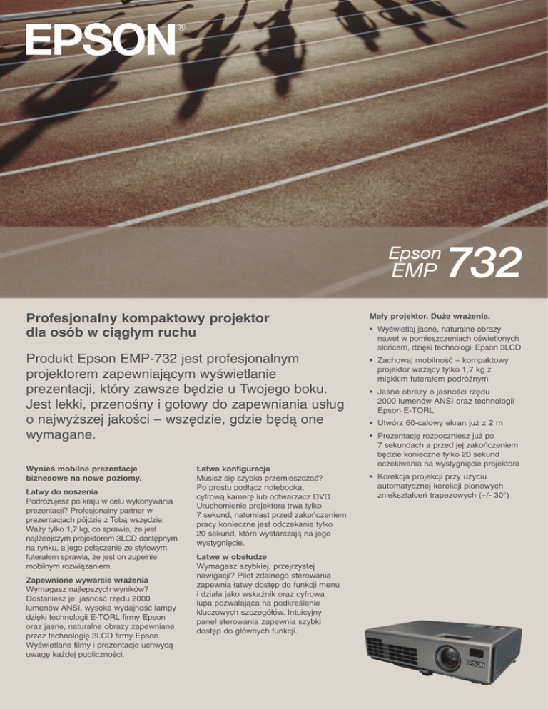 Profesjonalny kompaktowy projektor dla osób w ciàg∏ym ruchu Ma∏y projektor. Du˝e wra˝enia. Produkt Epson EMP-732 jest profesjonalnym projektorem zapewniajàcym wyÊwietlanie prezentacji, który zawsze b´dzie u Twojego boku. Jest lekki, przenoÊny i gotowy do zapewniania us∏ug o najwy˝szej jakoÊci – wsz´dzie, gdzie b´dà one wymagane. • Zachowaj mobilnoÊç – kompaktowy projektor wa˝àcy tylko 1,7 kg z mi´kkim futera∏em podró˝nym WynieÊ mobilne prezentacje biznesowe na nowe poziomy. ¸atwy do noszenia Podró˝ujesz po kraju w celu wykonywania prezentacji? Profesjonalny partner w prezentacjach pójdzie z Tobà wsz´dzie. Wa˝y tylko 1,7 kg, co sprawia, ˝e jest najl˝eejszym projektorem 3LCD dost´pnym na rynku, a jego po∏àczenie ze stylowym futera∏em sprawia, ˝e jest on zupe∏nie mobilnym rozwiàzaniem. Zapewnione wywarcie wra˝enia Wymagasz najlepszych wyników? Dostaniesz je: jasnoÊç rz´du 2000 lumenów ANSI, wysoka wydajnoÊç lampy dzi´ki technologii E-TORL firmy Epson oraz jasne, naturalne obrazy zapewniane przez technologi´ 3LCD firmy Epson. WyÊwietlane filmy i prezentacje uchwycà uwag´ ka˝dej publicznoÊci. ¸atwa konfiguracja Musisz si´ szybko przemieszczaç? Po prostu pod∏àcz notebooka, cyfrowà kamer´ lub odtwarzacz DVD. Uruchomienie projektora trwa tylko 7 sekund, natomiast przed zakoƒczeniem pracy konieczne jest odczekanie tylko 20 sekund, które wystarczajà na jego wystygni´cie. ¸atwe w obs∏udze Wymagasz szybkiej, przejrzystej nawigacji? Pilot zdalnego sterowania zapewnia ∏atwy dost´p do funkcji menu i dzia∏a jako wskaênik oraz cyfrowa lupa pozwalajàca na podkreÊlenie kluczowych szczegó∏ów. Intuicyjny panel sterowania zapewnia szybki dost´p do g∏ównych funkcji. • WyÊwietlaj jasne, naturalne obrazy nawet w pomieszczeniach oÊwietlonych s∏oƒcem, dzi´ki technologii Epson 3LCD • Jasne obrazy o jasnoÊci rz´du 2000 lumenów ANSI oraz technologii Epson E-TORL • Utwórz 60-calowy ekran ju˝ z 2 m • Prezentacj´ rozpoczniesz ju˝ po 7 sekundach a przed jej zakoƒczeniem b´dzie konieczne tylko 20 sekund oczekiwania na wystygni´cie projektora • Korekcja projekcji przy u˝yciu automatycznej korekcji pionowych zniekszta∏ceƒ trapezowych (+/- 30°) Przekàtna ekranu (cale) (SVRQ(039+ 0RGHO =DDZDQVRZDQDWHFKQRORJLDREUD]RZDQLD(SVRQ/&' 6\VWHPZ\ŋZLHWODQLD 3U]äGW\IJPRFRZDQLHSRGVXILWRZH 0HWRGDZ\ŋZLHWODQLD 3DUDPHWU\WHFKQLF]QHJIJäZQ\FKF]ĊŋFL /DPSD 5R]PLDUHNUDQX 2GOHJIJRŋøZ\ŋZLHWODQLD 150 .RQWUDVW -HGQRURGQRŋøMDVQRŋFL 2GWZDU]DQLHNRORUäZ 'ŪZLĊNZ\MŋFLRZ\ ZHZQĊWU]Q\JIJRŋQLN )XQNFMH 7U\E\NRORUX 5HJXODWRUVWRS\ .öWSRFK\OHQLD $XWRPDW\F]QDNRUHNFMD ]QLHNV]WDIJFHQLDWUDSH]RZHJR $XWRPDW\F]QDGHWHNFMD 5*%<&E&U )XQNFMDRFKURQ\SDQHOX 2FKURQDKDVIJHP ]DEH]SLHF]HQLD =IJöF]HZHMŋFLRZHREUD]X 3.4/4.0 5.0/6.0 6.7/8.0 10.0/12.0 Odleg∏oÊç wyÊwietlania (szerokokàtnie / tele) (metry) :VNDŪQLNORJRXŬ\WNRZQLNDZ\FLV]HQLHREUD]XGŪZLĊNX]DWU]\PDQLHREUD]X '\QDPLFG\QDPLF]Q\3UHVHQWDWLRQSUH]HQWDFMD%ODFNERDUGWDEOLFD7KHDWUHNLQR /LYLQJURRPVDORQV5*% 3L[HO&ORFNV]HURNRŋøSDVPD0+]GR0+] 3R]LRPR.+]GR.+]3LRQRZR+]GR+] 8VWDZLHQLH]QLHNV]WDIJFHĴWUDSH]RZ\FKMDVQRŋFLNRQWUDVWX]DEDUZLHQLDQDV\FHQLDNRORUXGŪZLĊNX V\JQDIJXZHMŋFLRZHJR 1DŋURGNXSU]RGX]W\IJX GRVWRSQL 1 =IJöF]HZHMŋFLRZHREUD]X :HMZ\MGŪZLĊNX =DLPSOHPHQWRZDQD =DLPSOHPHQWRZDQD =DLPSOHPHQWRZDQDRFKURQDORJRXŬ\WNRZQLNDEORNDGDF]DVRZD 1DW\ZQLH[SXQNWäZ 5RG]DMV\JQDIJXRGG]LHOQ\V\JQDIJV\JQDIJZLGHRDQDORJRZ\9SSRPäZ0DF9SS RPäZV\JQDIJV\QFKURQL]DFMLRGG]LHOQ\GRGDWQLLXMHPQ\GZXELHJXQRZH9SS]IJRŬRQ\ RGG]LHOQ\GRGDWQLLXMHPQ\GZXELHJXQRZH9SSV\QFUKRQL]DFMDQD]LHORQ\PXMHPQ\ 9SS 0LQL'VXEZW\NRZH[%OXHPROGLQJ 176&ZLHUV]\3$/ZLHUV]\]DOHŬ\RGREVHUZDFMLZ]RUFDZLHOXLPSXOVäZ 6WDQGDUG\ZLGHR176&176&3$/03$/13$/3$/6(&$0 6\JQDIJZLGHR&DIJNRZLW\V\JQDIJZL]\MQ\9SSXMHPQDV\QFKRPäZ69LGHRŋZLHWOQ\ 9SSFKURPLQDQFMD9SSRPäZVNIJDGQLNRZ\V\JQDIJZLGHRDQDORJRZ\SR]LRP <9RPäZSR]LRP&U&E9RPäZXMHPQDV\QFK9OXEVWDQRZH 9QD<9LGHR5*%9SSRPäZ0DF9SSRPäZ &DIJNRZLW\V\JQDIJREUD]X5&$ŬäIJW\[69LGHR0LQL',16NIJDGRZ\V\JQDIJREUD]X0LQL'VXE VW\NRZHIJöF]HW\SX%OXHPROGLQJZVSäOQHGOD]IJöF]DDQDORJRZHJR5*%9LGHR5*%0LQL'VXE VW\NRZHIJöF]HW\SX%OXHPROGLQJZVSäOQHGOD]IJöF]DDQDORJRZHJR5*% 6\JQDIJGŪZLĊNRZ\ZDUWRŋøVNXWHF]QDPNLORRPäZ]DFLVNGŪZLĊNRZ\*QLD]GNR6WHUHRPLQL [ZHMŋFLHDXGLR :HMZ\MVWHURZDQLD :HMZ\M86% 7HPSHUDWXUDSUDF\ 'LUHFW21 &]DVUR]UXFKX &]DVVW\JQLĊFLD =DVLODQLH 3REäUPRF\ EMD1512_EMP732_PL – 02/05 :\PLDU\G[V][Z &LĊŬDU *IJRŋQRŋø $NFHVRULD 1 2 3 4 5 2 3 4 5 USB Audio Video WejÊcie S—Video WejÊcie RGB :SLRQLHGRVWRSQL :\GDMQRŋøZ\ŋZLHWODQLD ZHMZ\MZLGHR 6\JQDIJZHMŋFLRZ\ 65 cm 2.7/3.2 8.4/10.0 :\GDMQRŋøZ\ŋZLHWODQLD ZHMZ\MZLGHR 6\JQDIJZHMŋFLRZ\ 54 cm 2.0/2.4 OXPHQäZ$16,7U\ENRORURZ\'\QDPLF]Q\3RZLĊNV]HQLH:LGH OXPHQäZ$16,7U\ENRORURZ\'\QDPLF]Q\3RZLĊNV]HQLH:LGH 7U\ENRORUX'\QDPLF]Q\WU\EZ\VRNLHMMDVQRŋFL ]D]Z\F]DM 3HIJQ\NRORUPLOLRQDNRORUäZ :PRQR )XQNFMHUHJXODFML 3URMHNWRU3LORW ]GDOQHJRVWHURZDQLD 44 cm 1.7/2.0 (IHNW\ZQ\]DNUHV &]ĊVWRWOLZRŋFLVNDQRZDQLD DQDORJRZR 33 cm 1.3/1.6 -DVQRŋø 7U\EZ\VRNLHMMDVQRŋFL 7U\EFLFK\ 22 cm 100 13 cm 1.0/1.2 80 60 17 cm 7 cm 50 30 40 9 cm 2ELHNW\Z :\PLDU\FDOD]0/$PHWRGDQDSĊGRZDSROLVLOLNRQRZDDNW\ZQDPDWU\FD7)7 ,ORŋøSLNVHOLSXQNWäZ[[1DW\ZQDUR]G]LHOF]Rŋø;*$ :VSäIJF]\QQLNNV]WDIJWXREUD]X5R]PLHV]F]HQLHSLNVHOL3DVHN&]ĊVWRWOLZRŋøRGŋZLHŬDQLD+] 5RG]DM5ĊF]QLH3RZLĊNV]HQLH2VWURŋø2JQLVNRRGGR2JQLVNRZDPPPP :VSäIJF]\QQLNSRZLĊNV]HQLD3U]HVXQLĊFLH3RNU\ZDRELHNW\ZX3U]\PRFRZDQDV]QXUNLHP 6WRVXQHNRGOHJIJRŋFLGRV]HURNRŋFL 5RG]DM:8+(ū\ZRWQRŋøJRG]LQWU\EZ\VRNLHMMDVQRŋFLJRG]LQWU\EFLFK\ GRFDOL>GRP@SRZLĊNV]HQLH7HOH GRFDOL>GRP@SRZLĊNV]HQLH:LGH 11 cm 3DQHO/&' 300 250 200 =IJöF]HZHMZ\M]IJöF]H86%VHULL%[GODP\V]\.%VWHURZDQLH ¡&GR¡& =DLPSOHPHQWRZDQD RNRIJRVHNXQG VHNXQG 9¢+]SUöGVLHFLRZ\ ಥ9aಥ$+] [[PPEH]VWRSHN[[PPPDNV\PDOQLH NJ G%WU\EFLFK\ 3U]HZäG]DVLODMöF\P3U]HZäGNRPSXWHURZ\PVW\NRZH]IJöF]H0LQL'VXEPĊVNLHಥ VW\NRZH]IJöF]H0LQL'VXEPĊVNLH.DEHO86%P86%$86%%]GDOQHVWHURZDQLH GRIJöF]RQHWDNLHVDPRMDNZ.DQDG]LH%D