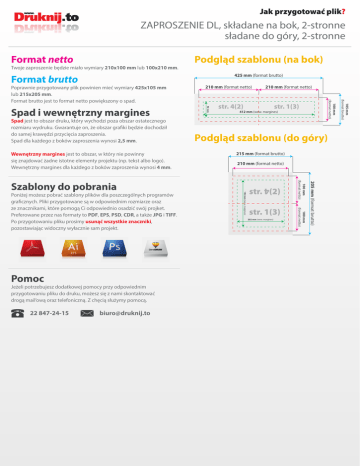 Jak przygotować plik? ZAPROSZENIE DL, składane na bok, 2-stronne sładane do góry, 2-stronne Format netto Twoje zaproszenie będzie miało wymiary 210x100 mm lub 100x210 mm. 425 mm (format brutto) Format brutto Wewnętrzny margines jest to obszar, w który nie powinny się znajdować żadne istotne elementy projektu (np. tekst albo logo). Wewnętrzny margines dla każdego z boków zaproszenia wynosi 4 mm. [email protected] 215 mm (format brutto) 210 mm (format netto) str. 1(3) 202 mm (wew. margines) 205 mm (format brutto) Jeżeli potrzebujesz dodatkowej pomocy przy odpowiednim przygotowaniu pliku do druku, możesz się z nami skontaktować drogą mail’ową oraz telefoniczną. Z chęcią służymy pomocą. Podgląd szablonu (do góry) 100 mm (format netto) Pomoc str. 1(3) 412 mm (wew. margines) 100 mm (format netto) Poniżej możesz pobrać szablony plików dla poszczególnych programów graficznych. Pliki przygotowane są w odpowiednim rozmiarze oraz ze znacznikami, które pomogą Ci odpowiednio osadzić swój projket. Preferowane przez nas formaty to PDF, EPS, PSD, CDR, a także JPG i TIFF. Po przygotowaniu pliku prosimy usunąć wszystkie znaczniki, pozostawiając widoczny wyłacznie sam projekt. str. 4(2) 192 mm (wew. margines) Szablony do pobrania 210 mm (format netto) 105 mm (format brutto) Spad jest to obszar druku, który wychodzi poza obszar ostatecznego rozmiaru wydruku. Gwarantuje on, że obszar grafiki będzie dochodził do samej krawędzi przycięcia zaproszenia. Spad dla każdego z boków zaproszenia wynosi 2,5 mm. 92 mm Spad i wewnętrzny margines 210 mm (format netto) 100 mm (format netto) Poprawnie przygotowany plik powinien mieć wymiary 425x105 mm lub 215x205 mm. Format brutto jest to format netto powiększony o spad. 22 847-24-15 Podgląd szablonu (na bok)