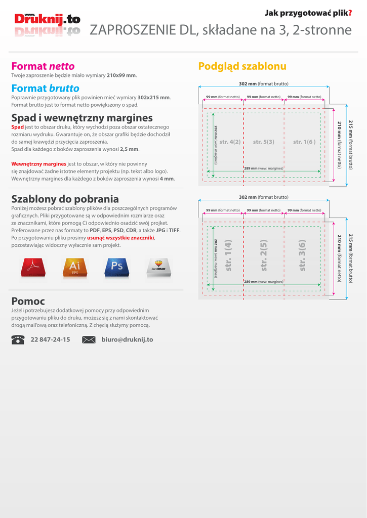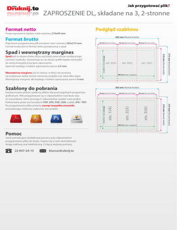 Jak przygotować plik? ZAPROSZENIE DL, składane na 3, 2-stronne Format netto Twoje zaproszenie będzie miało wymiary 210x99 mm. Podgląd szablonu 302 mm (format brutto) Format brutto Poprawnie przygotowany plik powinien mieć wymiary 302x215 mm. Format brutto jest to format netto powiększony o spad. 99 mm (format netto) str. 4(2) str. 1(6 ) 289 mm (wew. margines) Szablony do pobrania 302 mm (format brutto) 289 mm (wew. margines) Pomoc Jeżeli potrzebujesz dodatkowej pomocy przy odpowiednim przygotowaniu pliku do druku, możesz się z nami skontaktować drogą mail’ową oraz telefoniczną. Z chęcią służymy pomocą. 22 847-24-15 [email protected] 99 mm (format netto) str. 3(6) 99 mm (format netto) str. 2(5) str. 1(4) 99 mm (format netto) 202 mm (wew. margines) Poniżej możesz pobrać szablony plików dla poszczególnych programów graficznych. Pliki przygotowane są w odpowiednim rozmiarze oraz ze znacznikami, które pomogą Ci odpowiednio osadzić swój projket. Preferowane przez nas formaty to PDF, EPS, PSD, CDR, a także JPG i TIFF. Po przygotowaniu pliku prosimy usunąć wszystkie znaczniki, pozostawiając widoczny wyłacznie sam projekt. 215 mm (format brutto) Wewnętrzny margines jest to obszar, w który nie powinny się znajdować żadne istotne elementy projektu (np. tekst albo logo). Wewnętrzny margines dla każdego z boków zaproszenia wynosi 4 mm. 202 mm (wew. margines) Spad jest to obszar druku, który wychodzi poza obszar ostatecznego rozmiaru wydruku. Gwarantuje on, że obszar grafiki będzie dochodził do samej krawędzi przycięcia zaproszenia. Spad dla każdego z boków zaproszenia wynosi 2,5 mm. 215 mm (format brutto) str. 5(3) Spad i wewnętrzny margines 210 mm (format netto) 99 mm (format netto) 210 mm (format netto) 99 mm (format netto)