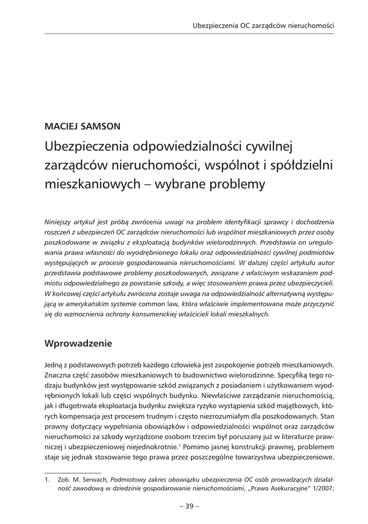 Ubezpieczenia OC zarządców nieruchomości MACIEJ SAMSON Ubezpieczenia odpowiedzialności cywilnej zarządców nieruchomości, wspólnot i spółdzielni mieszkaniowych – wybrane problemy Niniejszy artykuł jest próbą zwrócenia uwagi na problem identyfikacji sprawcy i dochodzenia roszczeń z ubezpieczeń OC zarządców nieruchomości lub wspólnot mieszkaniowych przez osoby poszkodowane w związku z eksploatacją budynków wielorodzinnych. Przedstawia on uregulowania prawa własności do wyodrębnionego lokalu oraz odpowiedzialności cywilnej podmiotów występujących w procesie gospodarowania nieruchomościami. W dalszej części artykułu autor przedstawia podstawowe problemy poszkodowanych, związane z właściwym wskazaniem podmiotu odpowiedzialnego za powstanie szkody, a więc stosowaniem prawa przez ubezpieczycieli. W końcowej części artykułu zwrócona zostaje uwaga na odpowiedzialność alternatywną występującą w amerykańskim systemie common law, która właściwie implementowana może przyczynić się do wzmocnienia ochrony konsumenckiej właścicieli lokali mieszkalnych. Wprowadzenie Jedną z podstawowych potrzeb każdego człowieka jest zaspokojenie potrzeb mieszkaniowych. Znaczna część zasobów mieszkaniowych to budownictwo wielorodzinne. Specyfiką tego rodzaju budynków jest występowanie szkód związanych z posiadaniem i użytkowaniem wyodrębnionych lokali lub części wspólnych budynku. Niewłaściwe zarządzanie nieruchomością, jak i długotrwała eksploatacja budynku zwiększa ryzyko wystąpienia szkód majątkowych, których kompensacja jest procesem trudnym i często niezrozumiałym dla poszkodowanych. Stan prawny dotyczący wypełniania obowiązków i odpowiedzialności wspólnot oraz zarządców nieruchomości za szkody wyrządzone osobom trzecim był poruszany już w literaturze prawniczej i ubezpieczeniowej niejednokrotnie.1 Pomimo jasnej konstrukcji prawnej, problemem staje się jednak stosowanie tego prawa przez poszczególne towarzystwa ubezpieczeniowe. 1. Zob. M. Serwach, Podmiotowy zakres obowiązku ubezpieczenia OC osób prowadzących działalność zawodową w dziedzinie gospodarowanie nieruchomościami, „Prawo Asekuracyjne” 1/2007; – 39 – Wiadomości Ubezpieczeniowe 3/2011 Dochodzenie roszczeń od podmiotu odpowiedzialnego za powstałą szkodę, pomimo iż opiera się na tych samych zasadach prawnych, często różni się w zależności od tego, przeciwko jakiemu podmiotowi skierowane jest roszczenie poszkodowanego lub w jakim towarzystwie ubezpieczeniowym przychodzi nam dochodzić roszczenia. Zaobserwować można zróżnicowane zasady występujące w postępowaniu likwidacyjnym poszczególnych ubezpieczycieli, które wprowadzają w swego rodzaju dezorientację nie tylko samych poszkodowanych, ale także ich pełnomocników. Wzajemne relacje pomiędzy członkami wspólnot mieszkaniowych a zarządcą nieruchomości oraz innymi osobami trzecimi, które doznały szkody związanej z eksploatacją budynku, rodzą komplikacje w precyzyjnym wskazaniu odpowiedzialnego za powstałą szkodę. Właściwe wskazanie sprawcy szkody to jeden z największych problemów w uzyskaniu odszkodowania należnego poszkodowanemu z ubezpieczenia OC wspólnoty mieszkaniowej lub zarządcy jej nieruchomości, który dotąd pozostawał poza zainteresowaniem doktryny. 1. Regulacja własności w budynkach wielorodzinnych Rozważań kwestii odpowiedzialności cywilnej podmiotów za szkody majątkowe i osobowe wyrządzone osobom trzecim w związku z posiadaniem, korzystaniem lub zarządzaniem nieruchomością nie sposób rozpocząć inaczej, niż przybliżając podstawowe informacje dotyczące prawa własności i współwłasności. Zazwyczaj lokal stanowi jedynie część składową nieruchomości gruntowej, jednak w szczególnym wypadku stanowić będzie on odrębną nieruchomość – tzw. nieruchomość lokalową (w dalszej części artykułu dla uproszczenia tym pojęciem nazywać będziemy wyodrębnioną z całości budynku nieruchomość, na którą składa się lokal). Własność lokalu w budynku wielomieszkaniowym łączy się ściśle z zagadnieniem współwłasności, uregulowanej w art. 195 kodeksu cywilnego, polegającej na niepodzielnym prawie kilku osób do tej samej rzeczy. Prawo własności przysługuje do wydzielonej części budynku – lokalu. Lokal to wydzielona trwałymi ścianami w obrębie budynku izba lub zespół izb przeznaczonych na stały pobyt ludzi, które wraz z pomieszczeniami pomocniczymi służą zaspokajaniu ich potrzeb mieszkaniowych.2 Części, które nie pozwalają na przyporządkowanie danego elementu budynku do danego lokalu i służące do użytku przez współwłaścicieli, szczególnie części konstrukcyjne, instalacje i ciągi komunikacyjne, stanowią część wspólną budynku opartą o współwłasność ułamkową. Współwłasność ta jest niezależna od woli właścicieli wyodrębnionych lokali. Na podstawie art. 200 kodeksu cywilnego każdy ze współwłaścicieli jest zobowiązany do współdziałania w zarządzie rzeczą wspólną. Wyróżnia się zarząd umowny, sądowy i ustawowy.3 Ogół właścicieli lokali wchodzących w skład określonej nieruchomości tworzy wspólT. Sangowski, Ubezpieczenie odpowiedzialności cywilnej zarządców nieruchomości, „Prawo Asekuracyjne” 4/1999; K. Lewandowski, Odpowiedzialność kontraktowa zarządcy nieruchomościami, „Gazeta Ubezpieczeniowa” z 23 maja 2006 r.; czy wreszcie artykuły Dariusza Fuchsa w Zeszycie 7 i 8 „Rozpraw Ubezpieczeniowych”. 2. Art. 2, ust. 2 ustawy o własności lokali (Dz. U. 1994, Nr 85, poz. 388, z późn. zm.). 3. Zob. rozdział II i V w: T. Filipiak, J. Mojak, M. Nazar, E. Niezbecka, Zarys prawa cywilnego, Verba, Lublin 2005. – 40 – Ubezpieczenia OC zarządców nieruchomości notę mieszkaniową z mocy samego prawa. Pomimo że nie posiada ona osobowości prawnej, przyznaje się jej uprawnienie do nabywania praw i zaciągania