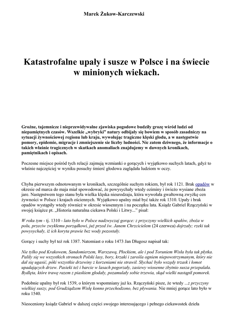 Marek Żukow-Karczewski Katastrofalne upały i susze w Polsce i na świecie w minionych wiekach. Groźne, tajemnicze i nieprzewidywalne zjawiska pogodowe budziły grozę wśród ludzi od niepamiętnych czasów. Wszelkie „wybryki” natury odbijały się bowiem w sposób zasadniczy na sytuacji żywnościowej regionu lub kraju, wywołując tragiczne klęski głodu, a w następstwie pomory, epidemie, migracje i zmniejszenie sie liczby ludności. Nic zatem dziwnego, że informacje o takich właśnie tragicznych w skutkach anomaliach znajdujemy w dawnych kronikach, pamiętnikach i opisach. Poczesne miejsce pośród tych relacji zajmują wzmianki o gorących i wyjątkowo suchych latach, gdyż to właśnie najczęściej w wyniku posuchy śmierć głodowa zaglądała ludziom w oczy. Chyba pierwszym odnotowanym w kronikach, szczególnie suchym rokiem, był rok 1121. Brak opadów w okresie od marca do maja miał spowodować, że powysychały wtedy oziminy i świeżo wysiane zboża jare. Następstwem tego stanu była wielka klęska nieurodzaju, która wywołała gwałtowną zwyżkę cen żywności w Polsce i krajach ościennych. Wyjątkowo upalny miał być także rok 1310. Upały i brak opadów wystąpiły wtedy również w okresie wiosennym i na początku lata. Ksiądz Gabriel Rzączyński w swojej książce pt. „Historia naturalna ciekawa Polski i Litwy...” pisał: W roku tym - tj. 1310 - lato było w Polsce nadzwyczaj gorące: z przyczyny wielkich upałów, zboża w polu, przeciw zwykłemu porządkowi, już przed św. Janem Chrzcicielem (24 czerwca) dojrzały; rzeki tak powysychały, iż ich koryta prawie bez wody pozostały. Gorący i suchy był też rok 1387. Natomiast o roku 1473 Jan Długosz napisał tak: Nie tylko pod Krakowem, Sandomierzem, Warszawą, Płockiem, ale i pod Toruniem Wisła była tak płytka. Paliły się we wszystkich stronach Polski lasy, bory, krzaki i zarośla ogniem niepowstrzymanym, który nie dał się ugasić, póki wszystkie drzewiny z korzeniami nie strawił. Słychać było wszędy trzask i łomot upadających drzew. Pasieki też i barcie w lasach pogorzały, zasiewy wiosenne zbytnio susza przepalała. Bydlęta, które trawę razem z piaskiem głodały, pozamulały sobie trzewia, skąd wielki nastąpił pomorek. Podobnie upalny był rok 1539, o którym wspomniany już ks. Rzączyński pisze, że wtedy ...z przyczyny wielkiej suszy, pod Grudziądzem Wisłę konno przechodzono, bez pływania. Nie mniej gorące lato było w roku 1540. Nieoceniony ksiądz Gabriel w dalszej części swojego interesującego i pełnego ciekawostek dzieła zanotował, co następuje: W 1708 roku, w czasie lata i jesieni ledwo kilka razy deszcz padał, z tej przyczyny w polach orać nie można było, a przez to i zasiewów jesiennych uskutecznić. Jest tu mowa o początkach wielkiej suszy, jaka nawiedziła tereny Polski w początkach XVIII wieku. Trwała ona aż do 1718 roku, kiedy to wypalone zostały wszystkie zboża. Jeszcze w roku 1719 upały i brak deszczu spowodowały nieurodzaj zbóż w zachodniej Polsce (Wielkopolska i Śląsk). Na tereny te sprowadzano zatem żywność z Małopolski, gdzie lato było wilgotniejsze. Susze miały również miejsce w XIX i XX wieku. Z tego okresu dysponujemy już ściślejszymi danymi, jako że prowadzono wówczas systematyczne obserwacje i gromadzono dane klimatologiczne. Tak więc posusznym był np. rok 1894, kiedy to niedobór wody zaznaczył się wiosną i na początku lata. Suma roczna opadów wyniosła wtedy ok. 350 mm, co stanowiło zaledwie ok. 58 proc. średniej wieloletniej. Klęska nieurodzaju jednak wtedy nie nastąpiła. Na marginesie dodajmy, że niższą sumę opadów odnotowano w roku 1942. Opad roczny wyniósł wtedy ok. 54 proc. średniej sumy rocznej. W okresie międzywojennym, w lipcu 1921 roku, fala panujących wówczas w Europie rekordowych upałów dotarła również do Polski. Termometry wskazały wtedy niespotykanie wysokie – najwyższe od lipca 1833 roku – temperatury, m.in. w Poznaniu było aż +38,7 st.C. Przez dłuższy czas brakowało też opadów deszczu. Na koniec tego krótkiego przeglądu dodajmy jeszcze, że wyjątkową w ciągu lata i na jesieni posuchą charakteryzował się rok 1951. W wyniku tych anomalii obniżone zostały plony roślin okopowych oraz zmniejszeniu uległ drugi pokos siana. Ponadto opóźnione zostały wysiewy i wschody zbóż ozimych. Podobne zestawienia można wykonać oczywiście dla każdego większego kraju w Europie i na świecie. Pamiętać jednak należy, że w niektórych rejonach ekstremalnie wysokie temperatury, susza i głód były i niestety wciąż są normą, a więc mamy tam do czynienia ze stanem klęski permanentnej. Ograniczymy się zatem do przedstawienia kilku charakterystycznych zdarzeń z minionego stulecia, które to wypadki wstrząsnęły żyjącymi we względnym dobrobycie społeczeństwami. Na początku lipca 1901 roku niespotykane upały nawiedziły Nowy Jork. Mieszkańcy tego ogromnego i bogatego miasta chronili się przed skwarem wśród zieleni Central Parku, gdyż w mieszkaniach i biurach panował nieznośny zaduch. Zarejestrowano wówczas ok. 400 zgonów spowodowanych panującym gorącem. Na drugim końcu świata – a mam na myśli nie tylko położenie geograficzne – w północnych Chinach, w roku 1920 katastrofalna susza pochłonęła – jeżeli wierzyć ówczesnym statystykom – 500 tys. istnień ludzkich. W latach 1933 - 1934 niebywała susza nawiedziła z kolei Stany Zjednoczone Ameryki Północnej. W jej wyniku zniszczeniu uległo ok. 300 milionów ton wysokogatunkowych zbóż rosnących na 40 milionach hektarów w stanach Kansas, Kolorado, Oklahoma i Teksas. Klęska ta doprowadziła do masowej migracji miejscowych farmerów do pobliskich stanów i Kalifornii. Społeczne i gospodarcze skutki dwuletniej posuchy znalazły odbicie w literaturze i filmie. Chyba najbardziej przejmująco oddaje atmosferę tamtych lat John Steinbeck w „Gronach gnie
