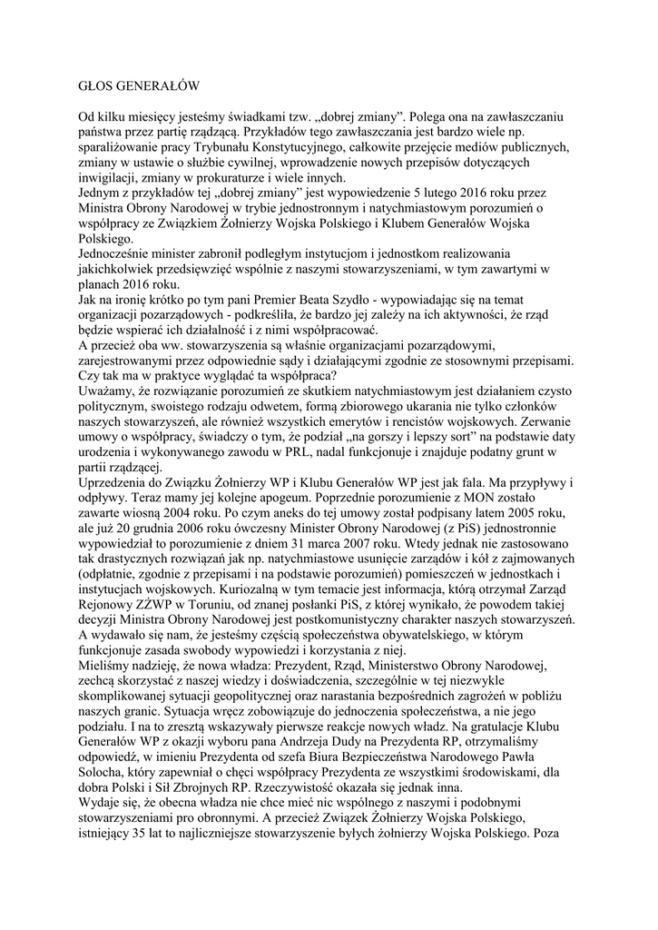 GŁOS GENERAŁÓW Od kilku miesięcy jesteśmy świadkami tzw. „dobrej zmiany”. Polega ona na zawłaszczaniu państwa przez partię rządzącą. Przykładów tego zawłaszczania jest bardzo wiele np. sparaliżowanie pracy Trybunału Konstytucyjnego, całkowite przejęcie mediów publicznych, zmiany w ustawie o służbie cywilnej, wprowadzenie nowych przepisów dotyczących inwigilacji, zmiany w prokuraturze i wiele innych. Jednym z przykładów tej „dobrej zmiany” jest wypowiedzenie 5 lutego 2016 roku przez Ministra Obrony Narodowej w trybie jednostronnym i natychmiastowym porozumień o współpracy ze Związkiem Żołnierzy Wojska Polskiego i Klubem Generałów Wojska Polskiego. Jednocześnie minister zabronił podległym instytucjom i jednostkom realizowania jakichkolwiek przedsięwzięć wspólnie z naszymi stowarzyszeniami, w tym zawartymi w planach 2016 roku. Jak na ironię krótko po tym pani Premier Beata Szydło - wypowiadając się na temat organizacji pozarządowych - podkreśliła, że bardzo jej zależy na ich aktywności, że rząd będzie wspierać ich działalność i z nimi współpracować. A przecież oba ww. stowarzyszenia są właśnie organizacjami pozarządowymi, zarejestrowanymi przez odpowiednie sądy i działającymi zgodnie ze stosownymi przepisami. Czy tak ma w praktyce wyglądać ta współpraca? Uważamy, że rozwiązanie porozumień ze skutkiem natychmiastowym jest działaniem czysto politycznym, swoistego rodzaju odwetem, formą zbiorowego ukarania nie tylko członków naszych stowarzyszeń, ale również wszystkich emerytów i rencistów wojskowych. Zerwanie umowy o współpracy, świadczy o tym, że podział „na gorszy i lepszy sort” na podstawie daty urodzenia i wykonywanego zawodu w PRL, nadal funkcjonuje i znajduje podatny grunt w partii rządzącej. Uprzedzenia do Związku Żołnierzy WP i Klubu Generałów WP jest jak fala. Ma przypływy i odpływy. Teraz mamy jej kolejne apogeum. Poprzednie porozumienie z MON zostało zawarte wiosną 2004 roku. Po czym aneks do tej umowy został podpisany latem 2005 roku, ale już 20 grudnia 2006 roku ówczesny Minister Obrony Narodowej (z PiS) jednostronnie wypowiedział to porozumienie z dniem 31 marca 2007 roku. Wtedy jednak nie zastosowano tak drastycznych rozwiązań jak np. natychmiastowe usunięcie zarządów i kół z zajmowanych (odpłatnie, zgodnie z przepisami i na podstawie porozumień) pomieszczeń w jednostkach i instytucjach wojskowych. Kuriozalną w tym temacie jest informacja, którą otrzymał Zarząd Rejonowy ZŻWP w Toruniu, od znanej posłanki PiS, z której wynikało, że powodem takiej decyzji Ministra Obrony Narodowej jest postkomunistyczny charakter naszych stowarzyszeń. A wydawało się nam, że jesteśmy częścią społeczeństwa obywatelskiego, w którym funkcjonuje zasada swobody wypowiedzi i korzystania z niej. Mieliśmy nadzieję, że nowa władza: Prezydent, Rząd, Ministerstwo Obrony Narodowej, zechcą skorzystać z naszej wiedzy i doświadczenia, szczególnie w tej niezwykle skomplikowanej sytuacji geopolitycznej oraz narastania bezpośrednich zagrożeń w pobliżu naszych granic. Sytuacja wręcz zobowiązuje do jednoczenia społeczeństwa, a nie jego podziału. I na to zresztą wskazywały pierwsze reakcje nowych władz. Na gratulacje Klubu Generałów WP z okazji wyboru pana Andrzeja Dudy na Prezydenta RP, otrzymaliśmy odpowiedź, w imieniu Prezydenta od szefa Biura Bezpieczeństwa Narodowego Pawła Solocha, który zapewniał o chęci współpracy Prezydenta ze wszystkimi środowiskami, dla dobra Polski i Sił Zbrojnych RP. Rzeczywistość okazała się jednak inna. Wydaje się, że obecna władza nie chce mieć nic wspólnego z naszymi i podobnymi stowarzyszeniami pro obronnymi. A przecież Związek Żołnierzy Wojska Polskiego, istniejący 35 lat to najliczniejsze stowarzyszenie byłych żołnierzy Wojska Polskiego. Poza centralą w Warszawie posiada 42 zarządy wojewódzkie i rejonowe i ponad 400 kół, co daje łącznie ponad 14 tysięcy członków. Niebagatelny jest też potencjał Klubu Generałów WP, gdzie 1/3 członków posiada tytuły profesorów i doktorów. Wielu z nich służyło na odpowiedzialnych stanowiskach w kraju i za granicą, już w III RP, tworząc podwaliny wstąpienia do Sojuszu Północnoatlantyckiego. Wielu wykonywało odpowiedzialne zadania w misjach w Iraku i Afganistanie. Od wielu lat, a szczególnie od podpisania porozumienia o współpracy z Ministrem Obrony Narodowej Tomaszem Siemoniakiem w lecie 2013 roku jesteśmy atakowani przez te same środowiska polityczne i medialne. Ówczesny poseł Patryk Jaki, dziś wiceminister sprawiedliwości, grzmiał wtedy: „To co robi MON, jest gloryfikowaniem komunistycznego reżimu totalitarnego…” Środowiska te atakują nieustannie w tym samym tonie o to, że wśród członków Klubu Generałów WP są członkowie Wojskowej Rady Ocalenia Narodowego, szefowie służb czy też prokuratorzy wojskowi, a nawet główni planiści stanu wojennego. Władza nami gardzi, uważa okres PRL z całym dobrodziejstwem inwentarza, a więc i z nami, za czarną dziurę, którą trzeba wyrzucić z pamięci społeczeństwa. Przykładem takiego działania może tu być ogłoszona 17 marca 2016 roku nowa polityka historyczna zakładająca m.in. lustrację sal tradycji i izb pamięci jednostek wojskowych oraz usunięcie z nich „niewłaściwych” symboli. Oznaczać to będzie, że gromadzone przez wiele dziesięcioleci pamiątki, znajdą się na śmietniku. To będzie swoistego rodzaju zemsta, na wszystkich byłych żołnierzach, głównie zawodowych. Od dawna bowiem emeryci wojskowi są przedstawiani jak pasożyty, którzy dostają wojskowe emerytury za nic. Nie bierze się pod uwagę, że służyliśmy uczciwie Ojczyźnie takiej, jaką nam dała historia. Wielu emerytów mundurowych, rozczarowanych rządami PO, oddało głos w ostatnich wyborach na PiS. Dziś już wiedzą na pewno, że był to błąd, gdyż nie 