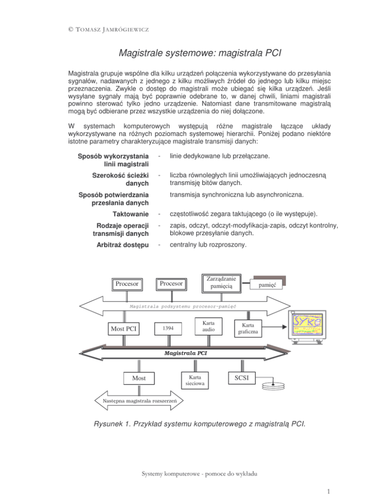 Magistrale systemowe: magistrala PCI Magistrala grupuje wspólne dla kilku urządzeń połączenia wykorzystywane do przesyłania sygnałów, nadawanych z jednego z kilku możliwych źródeł do jednego lub kilku miejsc przeznaczenia. Zwykle o dostęp do magistrali może ubiegać się kilka urządzeń. Jeśli wysyłane sygnały mają być poprawnie odebrane to, w danej chwili, liniami magistrali powinno sterować tylko jedno urządzenie. Natomiast dane transmitowane magistralą mogą być odbierane przez wszystkie urządzenia do niej dołączone. W systemach komputerowych występują różne magistrale łączące układy wykorzystywane na różnych poziomach systemowej hierarchii. Poniżej podano niektóre istotne parametry charakteryzujące magistrale transmisji danych: Sposób wykorzystania linii magistrali - linie dedykowane lub przełączane. Szerokość ścieżki danych - liczba równoległych linii umożliwiających jednoczesną transmisję bitów danych. transmisja synchroniczna lub asynchroniczna. Sposób potwierdzania przesłania danych Taktowanie - częstotliwość zegara taktującego (o ile występuje). Rodzaje operacji transmisji danych - zapis, odczyt, odczyt-modyfikacja-zapis, odczyt kontrolny, blokowe przesyłanie danych. Arbitraż dostępu - centralny lub rozproszony. Procesor Zarządzanie pamięcią Procesor pamięć Magistrala podsystemu procesor-pamięć Most PCI 1394 Karta audio Karta graficzna Magistrala PCI Most Karta sieciowa SCSI Następna magistrala rozszerzeń Rysunek 1. Przykład systemu komputerowego z magistralą PCI. ! Od blisko 10 lat do rozszerzania funkcji systemu komputerowego najczęściej wykorzystywana jest magistrala PCI (Peripheral Component Interconnect). Jest to magistrala, o dość dużej przepustowości (w wersji podstawowej do 132 MB/s), z centralnym arbitrażem i synchronicznym taktowaniem transmisji danych. Na magistrali PCI do przesyłania adresu i danych wykorzystywane są te same linie, przełączane odpowiednio w zależności od fazy operacji i szerokości ścieżki danych. 1. OPIS STANDARDU W normie PCI Local Bus (ostatnia wersja: Revision 2.2 pochodzi z 18. grudnia 1998) wydanej przez PCI Special Interest Group, zdefiniowano magistralę 32.bitową, ze wspólnymi przełączanymi liniami adresu i danych, synchronizowaną przebiegiem zegarowym o częstotliwości do 33 MHz. Przewidziano możliwość rozszerzenia ścieżki danych do 64 bitów i wprowadzenia dodatkowej częstotliwości zegara taktującego równej 66 MHz. Przyjęty protokół transmisji danych dostosowany jest do przesyłania sekwencyjnego. Przy częstotliwości zegara 33 MHz, magistralą PCI można transmitować 32.bitowe dane z szybkością do 132 Megabajtów/sekundę. 64.bitowe rozszerzenie i zastosowanie zegara 66 MHz pozwala tą szybkość zwiększyć czterokrotnie. W normie założono, że bezpośredni styk z magistralą obsługiwany jest przez wyspecjalizowany układ scalony wielkiej skali integracji. Określone normą parametry elektryczne odnoszą się do tego układu. Nie przewidziano dodatkowego buforowania. Magistrala nie jest zakończona dopasowanymi terminatorami. Układy sterujące dostarczają jedynie połowę napięcia w stanie wysokim lub niskim; sygnał osiąga właściwy poziom po zsumowaniu się fali pierwotnej z odbitą od końca magistrali. W hierarchii systemowej magistrala PCI usytuowana jest zwykle bezpośrednio poniżej magistrali podsystemu jednostka centralna–pamięć podręczna-pamięć operacyjna a z bezpośrednim otoczeniem procesora łączy ją most-sterownik magistrali PCI. Most PCI często dodatkowo pełni funkcję bufora danych oraz układu arbitrażu. Dołączane za pośrednictwem magistrali urządzenia, które rozszerzają funkcje systemu komputerowego, mogą realizować swoje zadania niezależnie od jednostki centralnej. Moduły mogą przejmować kontrolę nad magistralą i inicjować bezpośrednią wymianę informacji z urządzeniami we-wy, tak samo jak jednostka centralna. Urządzenia skupione wokół magistrali PCI mogą współpracować ze sobą bez pośrednictwa podsystemu jednostka centralna–pamięć podręczna-pamięć operacyjna. Zastosowanie magistrali PCI w systemie komputerowym umożliwia jego rozbudowę niezależnie od typu jednostki centralnej. I tak np. wykonana zgodnie z normą karta sterownika we-wy może być użyta na magistrali PCI zarówno w stacji roboczej sterowanej procesorem PowerPC, UltraSparc jak i Pentium. Różnice dotyczą oprogramowania systemowego. W systemie PCI dołączane urządzenia konfigurowane są automatycznie . Po włożeniu nowej karty w gniazdo rozszerzeń i zainicjowaniu pracy systemu - numery przerwań, kanały DMA, adresy we-wy itd. przydzielane są automatycznie. Nie trzeba ustawiać zworek, przełączników, zegarów. Pozwala to systemowi operacyjnemu eliminować ewentualne konflikty adresów, numerów przerwań a także błędy niedopasowania prędkości działania współpracujących ze sobą urządzeń. W urządzeniach standardu PCI, w specjalnie do tego " celu wydzielonej przestrzeni adresowej, dostępne są ich charakterystyki i rejestry umożliwiające programowe ustawianie konfiguracji oraz zainicjowanie pracy. 2. OMÓWIENIE WAŻNIEJSZYCH TERMINÓW Agent jednostka podejmująca działanie na magistrali komputera. (ang. agent) Blokowanie dostępu mechanizm umożliwiający zamknięcie, przed innymi agentami, (ang. locking) dostępu do wspólnej pamięci na czas wykonywania tzw. krytycznej sekwencji rozkazów, której wykonanie raz rozpoczęte musi zostać doprowadzone do końca. Moduł docelowy urządzenie, które współdziała w przeprowadzeniu operacji (ang. target) zainicjowanej przez moduł nadrzędny: sygnalizuje, że zostało zaadresowane i potwierdza gotowość zakończenia każdej z faz transmisji danych. Moduł nadrzędny urządzenie, które inicjuje operacje przesyłania danych na (ang. master) magistrali PCI: steruje fazą adresową, wyznacza czas trwania operacji, potwier