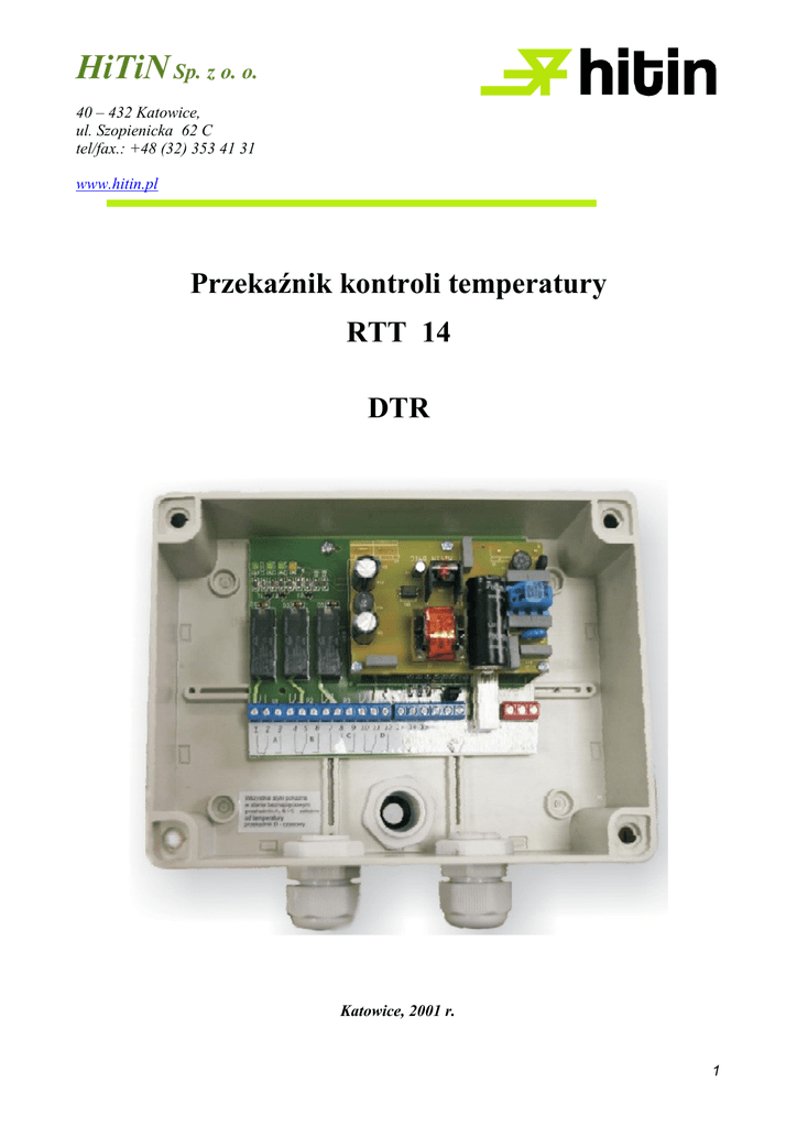 HiTiN Sp. z o. o. 40 – 432 Katowice, ul. Szopienicka 62 C tel/fax.: +48 (32) 353 41 31 www.hitin.pl Przekaźnik kontroli temperatury RTT 14 DTR Katowice, 2001 r. 1 1. Wstęp. Przekażnik elektroniczny RTT-14 jest przeznaczony do wykrywania przekroczenia temperatury przez transformatory wyposażone w czujniki typu PTC lub NTC. 2. Zastosowanie. Układ RTT-14 przeznaczony jest do nadzorowania temperatury transformatorów suchych i żywicznych oraz silników wyposażonych w czujniki typu PTC lub NTC. Układ kontroluje maksymalnie trzy progi temperatur. Wyjściem układu dla każdego z czujników temperatury jest przekaźnik ze stykiem przełącznym. Czwarty przekaźnik pracuje jako układ czasowy załączający się ze zwłoką 5 sekund od podania napięcia zasilania na układ. 3. Dane techniczne: Napięcie znamionowe zasilania: Maksymalna moc pobierana: Ilość wejść: Oporność nominalna przełączenia: Zwłoka na załączenie toru D (t1): Zwłoka na wyłączenie toru D (t2): Ilość wyjść: Maksymalne napięcie przełączane styków: Maksymalna zdolność łączeniowa AC: Obciążalność znamionowa styków: Temp.otoczenia (praca): Temp.otoczenia (przechowywanie): Ochrona: Izolacja zasilania do obudowy: Izolacja wejść do obudowy: Izolacja wejść do zasilania: Stopień ochrony: Gabaryty: − szerokość − długość − wysokość Waga: Dławiki kablowe: 42 – 240 V AC lub 42 – 240 V DC bez przełączeń 6 VA 3 (do każdego można dołączyć max. 3 czujniki PTC lub NTC połączone szeregowo, o łącznej rezystancji nominalnej < 1 kΏ) i układ czasowy 1 kΩ 5 sek min 0,2 sek 4 przełączne 400V AC 2000VA 250V AC/8A -25 do 55°C -25 do 80°C zerowanie lub uziemianie 3,5 kV 1,0 kV 3,5 kV IP 56 190 mm 140 + 22 mm dławiki kablowe 70 mm + 22 mm dławiki kablowe ok. 0,5 kg 3xPG16 4. Instalowanie. Układ należy zamocować mechanicznie do podstawy trzema wkrętami M4 lub M5 przez otwory w dolnej części obudowy (wymiary na rysunku gabarytowym nr 1). W zależności od typu zastosowanych czujników ustawić odpowiednio zwory na płytce drukowanej zgodnie z opisem podanym niżej. Podłączyć ochronę, zasilanie i czujniki. Styki przełączne połączyć według potrzeb. Układ nie wymaga regulacji. Położenie pracy dowolne. Zaciski przyłączeniowe o średnicy max 2,5mm 2, zalecane przyłączenie linką 1 lub 1,5 mm2. Układ nie wymaga konserwacji. Producent udziela na wyrób 3 letniej gwarancji od daty sprzedaży na ogólnie obowiązujących zasadach pod warunkiem eksploatacji zgodnej z przeznaczeniem oraz obowiązującymi przepisami. Dla ułatwienia montażu schemat blokowy RTT-14 i jego wyprowadzenia przedstawione są na rysunku wewnątrz obudowy. 2 5. Budowa. Do wejść pomiarowych urządzenia można przyłączyć maksymalnie trzy czujniki o rezystancji 1kom dla temperatury nominalnej. Każdy z czujników jest sprawdzany w układzie mostkowym przez własny komparator z histerezą. Komparator uruchamia bądź wyłącza odpowiedni element wykonawczy. Elementami wykonawczymi są przekaźniki RM96P. Tor D załącza się po czasie 5 sekund od podania zasilania na układ . Zastosowany w urządzeniu zasilacz impulsowy pozwala na poprawną pracę przy zasilaniu napięciem z zakresu 42-240V DC/AC bez jakichkolwiek przełączeń. Rozwiązanie zastosowane w układzie jest zastrzeżone. Schemat podłączeń zewnętrznych przedstawiono na rysunku wewnątrz obudowy i poniżej. 6. Programowanie. Do ustawiania rodzaju pracy układu RTT-14 służą dwie zworki umieszczone na przełącznikch Z1 i Z2. Przełączniki Z1 i Z2 umożliwiają konfigurowanie rodzaju pracy czujników. Możliwe są następujące kombinacje. - Dla czujników typu PTC: Zwarcie zworą pierwszą złącza Z1 a drugą złącza Z2 - w pozycji tej przekaźniki są załączone gdy temperatura jest prawidłowa. Przekaźniki wyłączają się po przekroczeniu temperatury progowej. Kombinacja ta powoduje, że po zaniku napięcia zasilającego przekaźniki przechodzą w stan taki jak po przekroczeniu temperatury, co chroni transformator w wypadku awarii zasilania układu. Zwarcie zworami odpowiednio zacisku Z1:1 z Z2:1 i Z1:2 z Z2:2 - w pozycji tej przekaźniki są wyłączone gdy temperatura nie przekracza progów. Przekaźniki załączają się gdy temperatura przekroczy progi czujników. W pozycji tej układ przy braku napięcia zasilającego nie kontroluje temperatury. - Dla czujników typu NTC: Zwarcie zworami odpowiednio zacisku Z1:1 z Z2:1 i Z1:2 z Z2:2 - w pozycji tej przekaźniki są załączone gdy temperatura jest prawidłowa. Przekaźniki wyłączają się po przekroczeniu temperatury progowej. Kombinacja ta powoduje, że po zaniku napięcia zasilającego przekaźniki przechodzą w stan taki jak po przekroczeniu temperatury, co chroni transformator w wypadku awarii zasilania układu. Zwarcie zworą pierwszą złącza Z1 a drugą złącza Z2 - w pozycji tej przekaźniki są wyłączone gdy temperatura nie przekracza progów. Przekaźniki załączają się gdy temperatura przekroczy progi czujników. W pozycji tej układ przy braku napięcia zasilającego nie kontroluje temperatury. 3 Rys. 1 - Szkic wymiarowy układu RTT-14 wraz z rozstawem otworów mocujących. A, B i C przekaźniki wykonawcze torów kontroli temperatury, D- przekaźnik wyjściowy układu czasowego. 4 7. Stany awaryjne: • Przekaźniki nie załączają się mimo prawidłowego stanu czujników: - sprawdzić zasilanie układu - powinna się świecić lampka na zasilaczu wewnątrz układu - sprawdzić czy są prawidłowo założone zworki na układzie kodującym, jeżeli objaw nie ustępuje należy skonsultować się z producentem.Objawy takie mogą wystąpić jeżeli układ został zniszczony lub zablokowany został zasilacz. Przyczyną może być wystąpienie wysokich potencjałów pomiędzy czujnikami lub pojawienie się w napięciu zasilającym serii impulsów napięciowych o energii umożliwiającej przepalenie wewnętrznych bezpieczników lub warystora