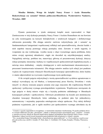 Monika Bobako, Wstęp do książki Nancy Fraser i Axela Honnetha. Redystrybucja czy uznanie? Debata polityczno-filozoficzna. Wydawnictwo Naukowe, Wrocław. 2005 Pytanie postawione w tytule niniejszej książki może wprowadzić w błąd. Zamieszczona w niej dyskusja pomiędzy Nancy Fraser i Axelem Honnethem nie ma bowiem na celu rozstrzygania na korzyść którejkolwiek z tytułowych kategorii i definitywnego odrzucenia pozostałej. Dla obojga autorów zarówno redystrybucja, jak i uznanie1 są fundamentalnymi kategoriami współczesnej refleksji nad sprawiedliwością, chociaż każde z nich zupełnie inaczej postrzega relację pomiędzy nimi. Zawarta w tytule sugestia, iż wzajemnie się one wykluczają wynika raczej z chęci wyrazistego ujęcia problemu, który mimo swojej ogromnej aktualności, ciągle nie doczekał się satysfakcjonującej analizy. Najogólniej mówiąc, problem ten, stanowiący główną oś prezentowanej dyskusji, dotyczy relacji pomiędzy ekonomią i kulturą we współczesnych społeczeństwach kapitalistycznych, a mówiąc nieco dokładniej – między działającymi w nich mechanizmami ekonomicznymi, a procesami konstruowania tożsamości. Dla obojga autorów analiza tych relacji jest punktem wyjścia do wypracowania własnych filozoficznych koncepcji sprawiedliwości, które byłyby w stanie odpowiedzieć na wyzwania współczesnego życia społecznego. O ile związki pojęcia redystrybucji z teorią sprawiedliwości są dobrze ugruntowane w tradycji wywodzącej się od Marksa, a kontynuowanej przez Rawlsa, Dworkina i wielu innych2, to obecny renesans pojęcia uznania oraz jego znaczenie dla współczesnej filozofii społecznej i politycznej wymaga prawdopodobnie wyjaśnienia. Współczesne nawiązanie do tego pojęcia w dużej mierze wiąże się z krytyką podmiotu zakładanego w liberalnych koncepcjach polityki i społeczeństwa. Głównym przedmiotem tej krytyki jest atomistyczny charakter koncepcji liberalnych, które zakładają, że podmiot jako byt jednostkowy, autonomiczny i racjonalny poprzedza ontologicznie relacje społeczne. Przy takiej definicji podmiotu wyjaśnienie, jak w ogóle możliwe jest społeczeństwo wymaga odwołania się do 1 Uznanie w języku angielskim to recognition, w niemieckim natomiast Anerkennung. W języku polskim słowo to czasami oddawane jest jako „docenienie”, jednak w niniejszej książce pozostajemy przy „uznaniu”. Uznanie w sposób oczywisty odsyła do filozofii heglowskiej (będącej niezbędnym tłem dyskusji Nancy Fraser i Axela Honnetha) i odnosi się do kwestii konstytuowania podmiotu (lub tożsamości) w relacji z innymi. 2 Por. na przykład Serge-Christophe Kolm „Dystrybutywna sprawiedliwość”, w: Przewodnik po współczesnej filozofii politycznej, red.R.E. Goodin i P. Petit, tłum. C. Cieśliński i M. Poręba, Książka i Wiedza, Warszawa, 1998. 1 jakiegoś zewnętrznego czynnika odpowiedzialnego za wytworzenie więzi społecznej. Takim czynnikiem bywa na przykład „pierwotna umowa społeczna”. Współcześni teoretycy sięgający po pojęcie uznania kwestionują zasadność abstrakcyjnego definiowania podmiotu, które odrywa go od jego kontekstu społecznego i kulturowego.3 Sprzeciwiając się negowaniu lub lekceważeniu roli relacji z innymi w konstytuowaniu podmiotowości, przedstawiają oni podmiot jako wytwór intersubiektywności będącej podstawą wszelkiego uspołecznienia. W tym sensie znajdują się w sytuacji analogicznej do tej, w której znajdował się młody Hegel konstruujący swoją koncepcję uznania w oparciu o wątki zaczerpnięte z filozofii Hobbesa i Fichtego. Podobnie jak on próbują mediować między nowoczesną koncepcją wolności, a jej rozumieniem klasycznym, kładącym nacisk na uczestnictwo w polityce i ściśle wiążącym się z etyką i moralnością. Nic zatem dziwnego, że krytycy atomistycznego ujęcia podmiotu sięgają do heglowskiej koncepcji uznania głoszącej, iż warunkiem ukonstytuowania się samoistnego podmiotu jest wzajemność uznania.4 W ujęciu Hegla uznanie jest dynamicznym procesem w nieunikniony sposób prowadzącym do uniwersalizacji wolności. Figura Pana i Sługi pokazuje, że dzieje się tak mimo początkowej asymetrii w relacjach między podmiotami: aby Pan mógł panować, musi jako Pan być uznany przez Sługę. Ponieważ jednak aby uznawać, trzeba być uznanym, Pan nie może osiągnąć samoistnej podmiotowości i wolności nie uznając Sługi za samoistny i wolny podmiot. W modelu heglowskim na mocy samej logiki intersubiektywności powstaje zatem wspólnota równoprawnych podmiotów, które z jednej strony są odrębnymi wolnymi jednostkami, z drugiej natomiast swoje istnienie jako wolne podmioty zawdzięczają uczestnictwu w relacjach społecznych. U samego Hegla nie jest jednak jasne, co konkretnie ma być w jednostkach uznawane aby powstała tego typu wspólnota. Jego dialektyka Pana i Sługi interpretowana jest zatem rozmaicie: w terminach podmiotowości uniwersalnej, uniwersalności przejawiającej podmiotowości się w tym, jednostkowej co lub jednostkowe. w odniesieniu Właśnie dzięki do tej niejednoznaczności, a tym samym plastyczności, heglowska koncepcja uznania okazuje się użytecznym narzędziem do opisu współczesnych zjawisk społecznych. 3 Poza autorami niniejszego tomu, do tych teoretyków należą między innymi tacy filozofowie, jak: Charles Taylor, Will Kimlicka, Michel Walzer, Seyla Benhabib, Iris Marion Young, Stuart Hall, Zygmunt Bauman. Por. również: „Recognition and Difference. Politics, Identity, Multiculture”, red. S. Lasch i M. Featherstone, Theory, Culture&Society, vol. 18(2-3), SAGE, London, Thousand Oaks, New Delhi, 2001. 4 Por. G. W. F. Hegel, Fenomenologia ducha, tłum. A. Landman, BKF, PWN, Warszawa, 1963. oraz Marek Siemek, Hegel i filozofia, Terminus Oficyna Naukowa, Warszawa, 1998. Marek Siemek, Wolność, rozum, intersubiektywność, Terminus Oficyna Wydawnicza, Warszawa, 2002. 2