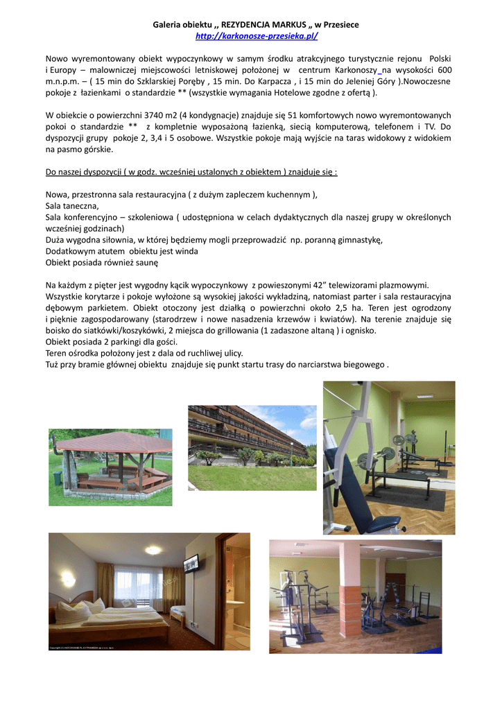 Galeria obiektu ,, REZYDENCJA MARKUS „ w Przesiece http://karkonosze-przesieka.pl/ Nowo wyremontowany obiekt wypoczynkowy w samym środku atrakcyjnego turystycznie rejonu Polski i Europy – malowniczej miejscowości letniskowej położonej w centrum Karkonoszy na wysokości 600 m.n.p.m. – ( 15 min do Szklarskiej Poręby , 15 min. Do Karpacza , i 15 min do Jeleniej Góry ).Nowoczesne pokoje z łazienkami o standardzie ** (wszystkie wymagania Hotelowe zgodne z ofertą ). W obiekcie o powierzchni 3740 m2 (4 kondygnacje) znajduje się 51 komfortowych nowo wyremontowanych pokoi o standardzie ** z kompletnie wyposażoną łazienką, siecią komputerową, telefonem i TV. Do dyspozycji grupy pokoje 2, 3,4 i 5 osobowe. Wszystkie pokoje mają wyjście na taras widokowy z widokiem na pasmo górskie. Do naszej dyspozycji ( w godz. wcześniej ustalonych z obiektem ) znajduje się : Nowa, przestronna sala restauracyjna ( z dużym zapleczem kuchennym ), Sala taneczna, Sala konferencyjno – szkoleniowa ( udostępniona w celach dydaktycznych dla naszej grupy w określonych wcześniej godzinach) Duża wygodna siłownia, w której będziemy mogli przeprowadzić np. poranną gimnastykę, Dodatkowym atutem obiektu jest winda Obiekt posiada również saunę Na każdym z pięter jest wygodny kącik wypoczynkowy z powieszonymi 42” telewizorami plazmowymi. Wszystkie korytarze i pokoje wyłożone są wysokiej jakości wykładziną, natomiast parter i sala restauracyjna dębowym parkietem. Obiekt otoczony jest działką o powierzchni około 2,5 ha. Teren jest ogrodzony i pięknie zagospodarowany (starodrzew i nowe nasadzenia krzewów i kwiatów). Na terenie znajduje się boisko do siatkówki/koszykówki, 2 miejsca do grillowania (1 zadaszone altaną ) i ognisko. Obiekt posiada 2 parkingi dla gości. Teren ośrodka położony jest z dala od ruchliwej ulicy. Tuż przy bramie głównej obiektu znajduje się punkt startu trasy do narciarstwa biegowego . WYŻYWIENIE 1 dzień obiad w Restauracji ,, Nad Potokiem „ w Kaczorowie http://www.nadpotokiem.com/ Rosół + filet drobiowy + ziemniaki + surówka + kompot + deser : galaretka z owocami Menu podczas pobytu ŚNIADANIA W FORMIE STOŁU SZWEDZKIEGO: ser żółty, topiony, twarożki, miód, dżemy, delikatne wędliny, pomidory, papryka, ogórki, rzodkiewki, sałata, sałatka jarzynowa, jakaś pasta, jajka gotowane z majonezem, specjalnie dla dzieci masło czekoladowe, ciepłe mleko + chrupki, płatki śniadaniowe ,masło, pieczywo, herbata, kakao + na gorąco 2 dania codziennie : jajecznica + parówki ; jajecznica + kiełbasa zapiekana z żółtym serem; naleśniki : do wyboru ( suche, z dżemem, serkiem ) ; gofry, Zupy pomidorowa z makaronem, żurek z kiełbasą, ogórkowa, pieczarkowa - krem z makaronem, rosół, krupnik z ryżu Drugie dania obiadowe ziemniaki, kluski śląskie, kopytka, frytki (każdego dnia coś innego ) kotlet schabowy panierowany z wieprzowiny, kotlet drobiowy, nuggetsy z kurczaka, pulpety w sosie pomidorowym, gulasz z mięsa wieprzowego lub wołowego, kotlety mielone, ryba panierowana, spaghetti z sosem bolońskim surówka z kapusty pekińskiej, duszona marchewka, surówka z kiszonej kapusty, mizeria, sałata ze śmietaną, ogórek konserwowy, buraczki, surówka z kapusty czerwonej i białej Kolacje ( 1 danie na ciepło + zimna płyta / bufet ) pierogi w wersji na słodko, spaghetti, naleśniki, parowce , pierogi leniwe, racuszki, pieczona kiełbaska Podwieczorki budyń czekoladowy z sokiem owocowym kisiel z bitą śmietaną jogurt owocowy galaretka owocowa z bitą śmietaną ciasto W CENIE ZAWARTE SĄ NASTĘPUJĄCE ŚWIADCZENIA Transport : autokar klasy LUX i bus (wyposażone w klimatyzację, rozsuwane fotele, odtwarzacz DVD / CD, telewizor) • ubezpieczenie NNW na kwotę 10.000,00 zł - na czas przejazdu • opieka licencjonowanego pilota wycieczek – (pilot posiada uprawnienia nadane przez Urząd Marszałkowski w Łodzi) • całodobowa opieka pielęgniarki ( również na trasach przejazdów ), • lekarz na wezwanie Świadczenia ( wyżywienie i nocleg) : • 4 x śniadanie w formie stołu szwedzkiego 2 x suchy prowiant ( słodka bułka + jabłko lub inny owoc i 0,5 l wody mineralnej nie gazowanej ) 2 x wzmocniony suchy prowiant w dniu: 19 i 21.05.2015 r. ( słodka bułka, bułka z serem i masłem, woda mineralna, owoc, coś słodkiego np. wafelek ) • 2 x obiadokolacja (zupa + drugie danie + podwieczorek ) jedna obiadokolacja może być wymienna na ognisko • 2 x kolacja ( coś ciepłego + zimna płyta / bufet + podwieczorek ) • 4 x nocleg w pokojach 3,4 os. z łazienkami ( standard ** ) • 3 x obiad • kolacja w dniu powrotu: zestaw Happy Meal dla wszystkich uczestników wycieczki i opiekunów Bilety wstępu : • • • wg załączonego programu Przewodnicy: 2 x przewodnik w drugim dniu wycieczki 2 x przewodnik w 4 dniu wycieczki Dodatkowe atrakcje ok. 4 godz. zajęcia integracyjne z zakresu Team Building - opieka instruktorska Dodatkowa GRATISOWA atrakcja : podczas wycieczki będzie robiona profesjonalna sesja zdjęciowa dzieci. Po wycieczce szkoła otrzyma pakiet wywołanych Pamiątkowych Zdjęć + Upominki dla Dzieci Pamiątkowe płyty pełne animowanych wspomnień o zielonej szkole - dostarczone w granicach 2 / 3 tygodni od momentu realizacji fotoreportażu.