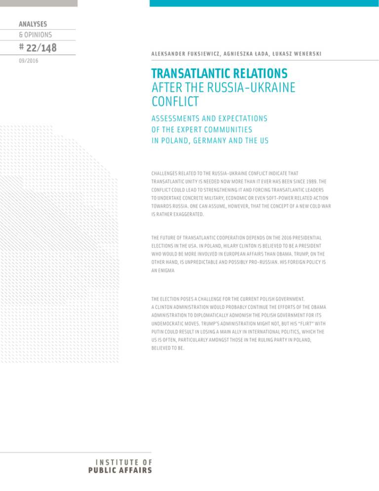 ANALYSES & OPINIONS # 22/148 ALEKSANDER FUKSIEWICZ, AGNIESZKA ŁADA, ŁUKASZ WENERSKI 09/2016 TRANSATLANTIC RELATIONS AFTER THE RUSSIA-UKRAINE CONFLICT ASSESSMENTS AND EXPECTATIONS OF THE EXPERT COMMUNITIES IN POLAND, GERMANY AND THE US CHALLENGES RELATED TO THE RUSSIA-UKRAINE CONFLICT INDICATE THAT TRANSATLANTIC UNITY IS NEEDED NOW MORE THAN IT EVER HAS BEEN SINCE 1989. THE CONFLICT COULD LEAD TO STRENGTHENING IT AND FORCING TRANSATLANTIC LEADERS TO UNDERTAKE CONCRETE MILITARY, ECONOMIC OR EVEN SOFT-POWER RELATED ACTION TOWARDS RUSSIA. ONE CAN ASSUME, HOWEVER, THAT THE CONCEPT OF A NEW COLD WAR IS RATHER EXAGGERATED. THE FUTURE OF TRANSATLANTIC COOPERATION DEPENDS ON THE 2016 PRESIDENTIAL ELECTIONS IN THE USA. IN POLAND, HILARY CLINTON IS BELIEVED TO BE A PRESIDENT WHO WOULD BE MORE INVOLVED IN EUROPEAN AFFAIRS THAN OBAMA. TRUMP, ON THE OTHER HAND, IS UNPREDICTABLE AND POSSIBLY PRO-RUSSIAN. HIS FOREIGN POLICY IS AN ENIGMA THE ELECTION POSES A CHALLENGE FOR THE CURRENT POLISH GOVERNMENT. A CLINTON ADMINISTRATION WOULD PROBABLY CONTINUE THE EFFORTS OF THE OBAMA ADMINISTRATION TO DIPLOMATICALLY ADMONISH THE POLISH GOVERNMENT FOR ITS UNDEMOCRATIC MOVES. TRUMP’S ADMINISTRATION MIGHT NOT, BUT HIS “FLIRT” WITH PUTIN COULD RESULT IN LOSING A MAIN ALLY IN INTERNATIONAL POLITICS, WHICH THE US IS OFTEN, PARTICULARLY AMONGST THOSE IN THE RULING PARTY IN POLAND, BELIEVED TO BE. ALEKSANDER FUKSIEWICZ, AGNIESZKA ŁADA, ŁUKASZ WENERSKI TRANSATLANTIC RELATIONS AFTER THE RUSSIA-UKRAINE CONFLICT ASSESSMENTS AND EXPECTATIONS OF THE EXPERT COMMUNITIES IN POLAND, GERMANY AND THE US Serious and deep cracks in the transatlantic community appeared in the first decade of the twenty-first century, when Western Europe, its people and elites, strongly opposed the US military intervention in Iraq. Poland and other Central European countries supported this intervention both politically and militarily, which led not only to profound differences and animosity between the US and Europe, but also to a division into “old” and “new” Europe. The failure of the US intervention in Iraq had serious and permanent consequences for the transatlantic community. In Germany, but also in Poland, there was disappointment in their cooperation with the United States. Moreover, the administration of President Obama, who had taken office on a wave of criticism of the domestic and international policies of Bush, made the famous “pivot to Asia” at the expense of transatlantic relations and involvement in European affairs. This era of transatlantic “quiet” is now over due to internal and external changes in the policy of Russia, with its significant authoritarian retreat from democracy and its military aggression towards Ukraine. The feeling of insecurity in the Western world has led some commentators and political analysts to the thesis of a “new Cold War,” discussed in Poland, Germany and the United States. This analogy, also vigorously challenged by some experts, has brought to the agenda the question of how the new Russian policy, specifically as it regards the Russia-Ukraine conflict, will impact transatlantic cooperation. Will it become a catalyst for the re-strengthening of political, economic and military cooperation, or on the contrary, will it consolidate the existing divisions between America and Europe and within Europe itself?1. Challenges related to the Russia-Ukraine conflict indicate that transatlantic unity is needed now more than it ever has been since 1989. The conflict could lead to strengthening it and forcing transatlantic leaders to undertake concrete military, economic or even soft-power related action towards Russia. One can assume, however, that the concept of a new Cold War is rather exaggerated. There are still many areas of dialogue with Russia, and today’s confrontation is also not comparable to that of the Cold War. We live in a multipolar world. Russia is no longer a military superpower compared to the times of the USSR, 1 This was to become one of the key questions of research undertaken by the Institute of Public Affairs. This paper is a summary of the report resulting from that research. In-depth interviews were conducted in Poland, Germany and the US during February-May 2016 based on a questionnaire, and to widen the analysis, expert opinions were confronted with those of leading opinion-forming media in Poland and Germany. See: Wpływ konfliktu rosyjsko-ukraińskiego na stosunki transatlantyckie. Perspektywa Polski, Niemiec i USA [The impact of the Russia-Ukraine conflict on transatlantic relations. Perspectives of Poland, Germany and the US], Warsaw 2016, Institute of Public Affairs. and for the US it is just one of many elements on the global agenda. The current conflict with Russia also lacks the ideological clout that was crucial during the Cold War. Another difference is that having lost its “military superpower” status, Russia’s code of conduct is different than during the Cold War – the Kremlin is less dangerous but more unpredictable. Some experts in the US, however, are still considering whether the current global situation may be a pre-condition of a “cold war 2.0”, with empires competing with each other, but based on a different sociological, political and economic approach than during the Cold War. Transatlantic response to the RussiaUkraine conflict law with its annexation of Crimea, and so in this matter the responsibility lies clearly on its side. Putin is not seen as a reliable partner. German experts close to the Social Democrats are the only ones to point out mistakes made by the European Union, for instance, not consulting the Ukraine Association Agreement with Russia sufficiently early. According to these opinions, Russia’s negative reaction could have been foreseen even though nobody could have expected military intervention. Russia’s policy towards Ukraine in early 2014 came as a huge surprise for the US administration and independent anal