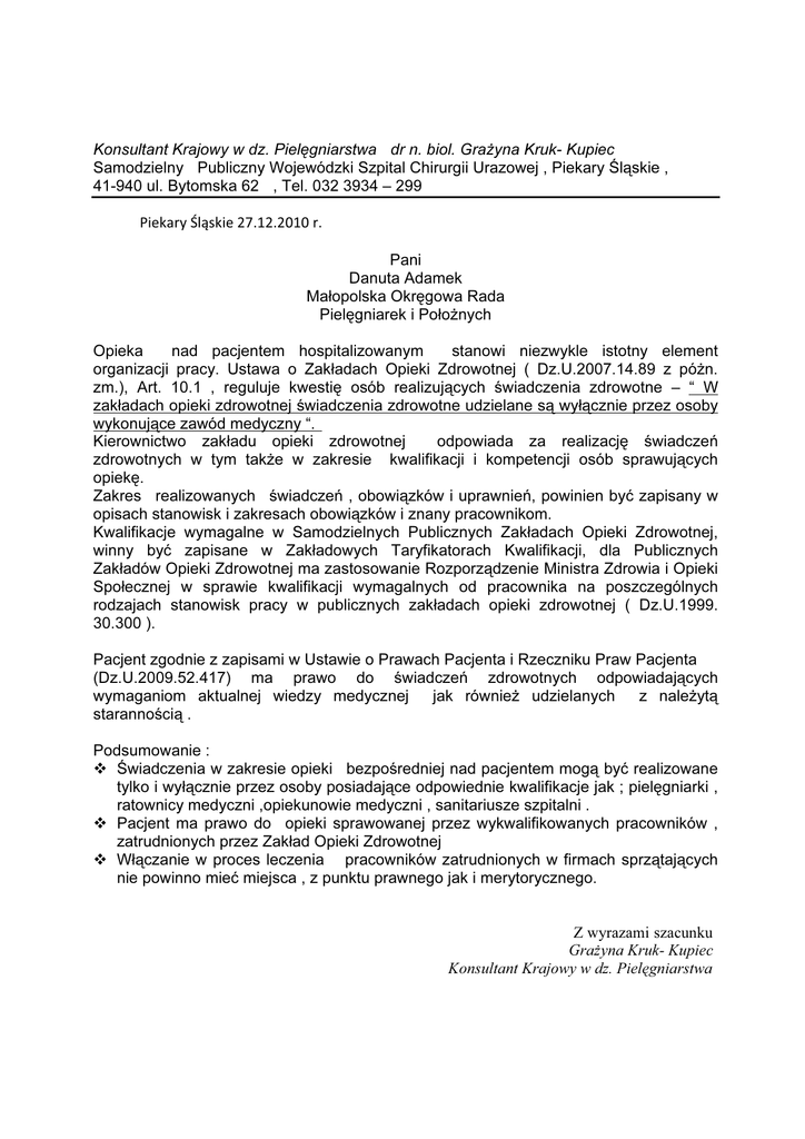 Konsultant Krajowy w dz. Pielęgniarstwa dr n. biol. Grażyna Kruk- Kupiec Samodzielny Publiczny Wojewódzki Szpital Chirurgii Urazowej , Piekary Śląskie , 41-940 ul. Bytomska 62 , Tel. 032 3934 – 299 WŝĞŬĂƌLJ_ůČƐŬŝĞϮϳ͘ϭϮ͘ϮϬϭϬƌ͘ Pani Danuta Adamek Małopolska Okręgowa Rada Pielęgniarek i Położnych Opieka nad pacjentem hospitalizowanym stanowi niezwykle istotny element organizacji pracy. Ustawa o Zakładach Opieki Zdrowotnej ( Dz.U.2007.14.89 z póżn. zm.), Art. 10.1 , reguluje kwestię osób realizujących świadczenia zdrowotne – “ W zakładach opieki zdrowotnej świadczenia zdrowotne udzielane są wyłącznie przez osoby wykonujące zawód medyczny “. Kierownictwo zakładu opieki zdrowotnej odpowiada za realizację świadczeń zdrowotnych w tym także w zakresie kwalifikacji i kompetencji osób sprawujących opiekę. Zakres realizowanych świadczeń , obowiązków i uprawnień, powinien być zapisany w opisach stanowisk i zakresach obowiązków i znany pracownikom. Kwalifikacje wymagalne w Samodzielnych Publicznych Zakładach Opieki Zdrowotnej, winny być zapisane w Zakładowych Taryfikatorach Kwalifikacji, dla Publicznych Zakładów Opieki Zdrowotnej ma zastosowanie Rozporządzenie Ministra Zdrowia i Opieki Społecznej w sprawie kwalifikacji wymagalnych od pracownika na poszczególnych rodzajach stanowisk pracy w publicznych zakładach opieki zdrowotnej ( Dz.U.1999. 30.300 ). Pacjent zgodnie z zapisami w Ustawie o Prawach Pacjenta i Rzeczniku Praw Pacjenta (Dz.U.2009.52.417) ma prawo do świadczeń zdrowotnych odpowiadających wymaganiom aktualnej wiedzy medycznej jak również udzielanych z należytą starannością . Podsumowanie : Świadczenia w zakresie opieki bezpośredniej nad pacjentem mogą być realizowane tylko i wyłącznie przez osoby posiadające odpowiednie kwalifikacje jak ; pielęgniarki , ratownicy medyczni ,opiekunowie medyczni , sanitariusze szpitalni . Pacjent ma prawo do opieki sprawowanej przez wykwalifikowanych pracowników , zatrudnionych przez Zakład Opieki Zdrowotnej Włączanie w proces leczenia pracowników zatrudnionych w firmach sprzątających nie powinno mieć miejsca , z punktu prawnego jak i merytorycznego. Z wyrazami szacunku Grażyna Kruk- Kupiec Konsultant Krajowy w dz. Pielęgniarstwa