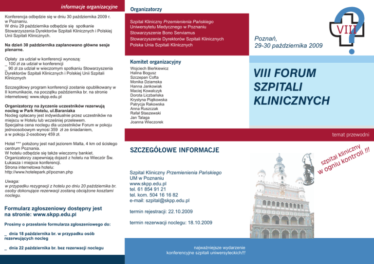 informacje organizacyjne Konferencja odbêdzie siê w dniu 30 paŸdziernika 2009 r. w Poznaniu. W dniu 29 paŸdziernika odbêdzie siê spotkanie Stowarzyszenia Dyrektorów Szpitali Klinicznych i Polskiej Unii Szpitali Klinicznych. Na dzieñ 30 paŸdziernika zaplanowano g³ówne sesje plenarne. Op³aty za udzia³ w konferencji wynosz¹: _ 100 z³ za udzia³ w konferencji _ 90 z³ za udzia³ w wieczornym spotkaniu Stowarzyszenia Dyrektorów Szpitali Klinicznych i Polskiej Unii Szpitali Klinicznych Szczegó³owy program konferencji zostanie opublikowany w II komunikacie, na pocz¹tku paŸdziernika br. na stronie internetowej: www.skpp.edu.pl Organizatorzy na ¿yczenie uczestników rezerwuj¹ nocleg w Park Hotelu, ul.Baraniaka Nocleg op³acany jest indywidualnie przez uczestników na miejscu w Hotelu lub wczeœniej przelewem. Specjalna cena noclegu dla uczestników Forum w pokoju jednoosobowym wynosi 359 z³ ze œniadaniem, a w pokoju 2-osobowy 459 z³. Hotel *** po³o¿ony jest nad jeziorem Malta, 4 km od œcis³ego centrum Poznania. W hotelu odbêdzie siê tak¿e wieczorny bankiet. Organizatorzy zapewniaj¹ dojazd z hotelu na Wieczór Œw. £ukasza i miejsce konferencji. Strona internetowa hotelu: http://www.hotelepark.pl/poznan.php Organizatorzy Szpital Kliniczny Przemienienia Pañskiego Uniwersytetu Medycznego w Poznaniu Stowarzyszenie Bono Serviamus Stowarzyszenie Dyrektorów Szpitali Klinicznych Polska Unia Szpitali Klinicznych Komitet organizacyjny Wojciech Bieñkiewicz Halina Bogusz Szczepan Cofta Monika Dziamska Hanna Jankowiak Maciej Kowalczyk Dorota Liczbañska Krystyna Pi¹tkowska Patrycja Rakowska Anna Ruszczak Rafa³ Staszewski Jan Talaga Joanna Wieczorek VIII FORUM SZPITALI KLINICZNYCH temat przewodni ny cz ini SZCZEGÓLOWE INFORMACJE l al k it szp Uwaga: w przypadku rezygnacji z hotelu po dniu 20 paŸdziernika br. osoby dokonuj¹ce rezerwacji zostan¹ obci¹¿one kosztami noclegu. Szpital Kliniczny Przemienienia Pañskiego UM w Poznaniu www.skpp.edu.pl tel. 61 854 91 21 tel. kom. 504 16 16 82 e-mail: [email protected] Formularz zg³oszeniowy dostêpny jest na stronie: www.skpp.edu.pl termin rejestracji: 22.10.2009 Prosimy o przes³anie formularza zg³oszeniowego do: termin rezerwacji noclegu: 18.10.2009 _ dnia 18 paŸdziernika br. w przypadku osób rezerwuj¹cych nocleg _ dnia 22 paŸdziernika br. bez rezerwacji noclegu VIII Poznañ, 29-30 paŸdziernika 2009 najwa¿niejsze wydarzenie konferencyjne szpitali uniwersyteckich!!! w og k niu on li tro !!! Pi¹tek, 30.10.2009 VIII Forum Szpitali Klinicznych 2009 godz. 9.30-14.00 program ramowy* czwartek, 29.10.2009 godz. 13.00-17.00 Centrum Kongresowo-Dydaktyczne Uniwerystetu Medycznego w Poznaniu, ul. Przybyszewskiego 37, Sala B SESJA kontrakty 2010 SPOTKANIE DYREKTORÓW SZPITALI KLINICZNYCH Szanowni Pañstwo, zapraszamy po raz kolejny do Poznania na coroczne spotkanie dyrektorów szpitali klinicznych i œrodowiska osób zwi¹zanych z medycyn¹ akademick¹. Park Hotel, ul. Arcybiskupa Baraniaka 77 sala konferencyjna SESJA szpital kliniczny w ogniu kontroli godz. 13.00-13.30 lunch powitalny Kanw¹ tegorocznych obrad bêd¹ refleksje poœwiêcone prowadzonej od ponad pó³ roku kontroli NIK. Chcielibyœmy tak¿e poruszyæ inne istotne zagadnienia jak np. szanse i zagro¿enia wynikaj¹ce z zatrudniania pracowników w ramach umów cywilno-prawnych, sytuacjê szpitali klinicznych w aspekcie kontraktowania œwiadczeñ na rok 2010, czy te¿ kwestie ograniczonych mo¿liwoœci pozyskiwania œrodków z Unii Europejskiej. godz. 13.30-17.00 Obrady Stowarzyszenia Dyrektorów Szpitali Klinicznych i Polskiej Unii Szpitali Klinicznych przewodnicz¹: dr hab. Maciej Kowalczyk dr Wojciech Bieñkiewicz Walne Zgromadzenie Stowarzyszenia Dyrektorów Szpitali Klinicznych. Spotkanie sprawozdawczo-wyborcze Wa¿nym elementem bêdzie tak¿e poprzedzaj¹ce konferencjê spotkanie Stowarzyszenia Dyrektorów Szpitali Klinicznych z walnym zgromadzeniem cz³onków oraz obrady Polskiej Unii Szpitali Klinicznych. Mamy nadziejê, ¿e i w tym roku zaszczyc¹ nas Pañstwo swoj¹ obecnoœci¹. dr Wojciech Bieñkiewicz Wieczór Œw. £ukasza Sala Widowiskowa Kina Apollo, ul. Ratajczaka 18, 29.10.2009, godz. 19.00 Goœæ honorowy dr Konstanty Radziwi³³ Prezes Naczelnej Rady Lekarskiej W imieniu organizatorów dr hab. Maciej Kowalczyk Gwiazda wieczoru Zenon Laskowik i jego Kabareciarnia dr Jan Talaga Finansowanie szpitali klinicznych w systemie JGP - stan obecny i plany na rok 2010 Przedstawiciel NFZ, zaproszenie skierowane do Prezesa NFZ Jacka Paszkiewicza dr Szczepan Cofta UROCZYSTA KOLACJA godz. 21.30 Restauracja Park Hotelu ul. Arcybiskupa Baraniaka 77 Reminiscencje po ogólnopolskiej kontroli szpitali klinicznych prof. dr hab Piotr Kuna prof. dr hab. Grzegorz Oszkinis prof. dr hab. Tomasz Opala dr Maria Ilnicka-M¹dry dr Piotr Pobrotyn dr Jan Talaga SESJA badania kliniczne Nowe zasady organizacji badañ klinicznych w szpitalu uniwersyteckim - zamach na „akademickie sacrum”? prof. dr hab. Stefan Grajek dr Szczepan Cofta dr Monika Urbaniak dr Wojciech Mase³bas dr Rafa³ Staszewski SESJA pal¹ce problemy szpitali klinicznych Szpital kliniczny wobec wyzwañ demograficznoepidemiologicznych Organizacja bezw³adu? - zarz¹dzanie oddzia³em klinicznym Wynagrodzenia lekarzy i pielêgniarek - kto psuje rynek Lekarz na kilku etatach- czas na zakaz konkurencji? „Akademik” na kontrakcie - mocne i s³abe strony Wykluczeni - szpitale kliniczne w obliczu funduszy UE dr Wojciech Bieñkiewicz dr Halina Bogusz dr Szczepan Cofta dr Piotr Pobrotyn dr Rafa³ Staszewski dr Jan Talaga