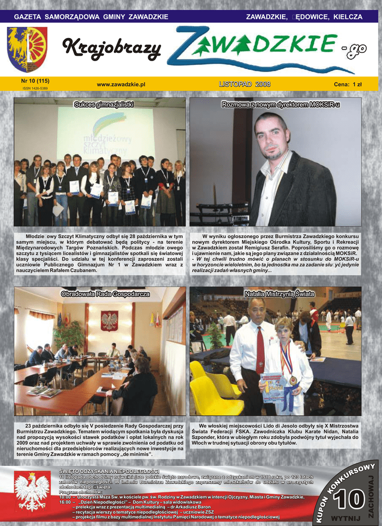 Nr 10 (115) ISSN 1426-5389 www.zawadzkie.pl ZAWADZKIE, ŻĘDOWICE, KIELCZA LISTOPAD 2008 Cena: 1 zł Młodzieżowy Szczyt Klimatyczny odbył się 28 października w tym samym miejscu, w którym debatować będą politycy - na terenie Międzynarodowych Targów Poznańskich. Podczas młodzieżowego szczytu z tysiącem licealistów i gimnazjalistów spotkali się światowej klasy specjaliści. Do udziału w tej konferencji zaproszeni zostali uczniowie Publicznego Gimnazjum Nr 1 w Zawadzkiem wraz z nauczycielem Rafałem Czubanem. W wyniku ogłoszonego przez Burmistrza Zawadzkiego konkursu nowym dyrektorem Miejskiego Ośrodka Kultury, Sportu i Rekreacji w Zawadzkiem został Remigiusz Serafin. Poprosiliśmy go o rozmowę i ujawnienie nam, jakie są jego plany związane z działalnością MOKSiR. - W tej chwili trudno mówić o planach w stosunku do MOKSiR-u w horyzoncie wieloletnim, bo ta jednostka ma za zadanie służyć jedynie realizacji zadań własnych gminy... 23 października odbyło się V posiedzenie Rady Gospodarczej przy Burmistrzu Zawadzkiego. Tematem wiodącym spotkania była dyskusja nad propozycją wysokości stawek podatków i opłat lokalnych na rok 2009 oraz nad projektem uchwały w sprawie zwolnienia od podatku od nieruchomości dla przedsiębiorców realizujących nowe inwestycje na terenie Gminy Zawadzkie w ramach pomocy „de minimis”. We włoskiej miejscowości Lido di Jesolo odbyły się X Mistrzostwa Świata Federacji FSKA. Zawodniczka Klubu Karate Nidan, Natalia Szponder, która w ubiegłym roku zdobyła podwójny tytuł wyjechała do Włoch w trudnej sytuacji obrony obu tytułów. N KU P O 11 listopada obchodzimy najważniejsze polskie święto narodowe, związane z odzyskaniem w 1918 roku, po 123 latach zaborów niepodległości. W imieniu Burmistrza Zawadzkiego zapraszamy mieszkańców do udziału w uroczystych obchodach tegoż święta. Program obchodów: 10:00 – Uroczysta Msza Św. w kościele pw. św. Rodziny w Zawadzkiem w intencji Ojczyzny, Miasta i Gminy Zawadzkie, 16:00 – „Dzień Niepodległości” – Dom Kultury – sala widowiskowa – prelekcja wraz z prezentacją multimedialną – dr Arkadiusz Baron – recytacja wierszy o tematyce niepodległościowej – uczniowie ZSZ – projekcja filmu z bazy multimedialnej Instytutu Pamięci Narodowej o tematyce niepodległościowej KO ŚWIĘTO ODZYSKANIA NIEPODLEGŁOŚCI N WY SO R U K 10 WYTNIJ ZACHOWAJ GAZETA SAMORZĄDOWA GMINY ZAWADZKIE Sesja Rady Miejskiej 27 października 2008 r. odbyła się XXII sesja Rady Miejskiej. Obradom sesji przewodniczył Wiceprzewodniczący Rady Miejskiej Rafał Czuban. Na sesji przyjęto między innymi informację na temat przygotowania do sezonu zimowego oraz informację na temat działalności Spółki ZAW-KOM. W ramach punktu dotyczącego podjęcia uchwał, radni uchwalili zmiany w budżecie gminy na 2008 r., ustalili wysokość n a j n i ż s z e g o wynagrodzenia zasadniczego oraz wartość 1 punktu w z ł o t y c h d l a p r a c o w n i k ó w gminnych jednostek organizacyjnych. Przyjęto również Program Współpracy Gminy Zawadzkie z Organizacjami Pozarządowymi na rok 2009 oraz wyrażono zgodę na udzielenie pomocy finansowej Gminie Ujazd (uchwała dotyczy przekazania środków finansowych, które były planowane na organizację dożynek w Żędowicach, a które zgodnie z decyzją Rady Sołeckiej zostaną przekazane ofiarom trąby powietrznej, jaka miała miejsce w miesiącu sierpniu na terenie powiatu strzeleckiego). Radni uchwalili również siedem uchwał dotyczących wyrażenia zgody na udzielenie bonifikaty przekraczającej wartość 50.000 zł od ceny nieruchomości przy sprzedaży lokali mieszkalnych. Na sesję przybyli mieszkańcy Żędowic, którzy wyrazili swój sprzeciw w sprawie planów przeniesienia przedszkola do szkoły w Żędowicach. Temat ten był szeroko omawiany na posiedzeniach przedsesyjnych komisji problemowych, na których radni ustalili na miesiąc listopad spotkanie z Radą Rodziców przedszkola oraz wizję lokalną obiektów. Obecny na sesji był również Zastępca Komendanta Komisariatu Policji w Zawadzkiem Andrzej Białkowski, który odpowiadał radnym na pytania dotyczące bezpieczeństwa w naszej gminie. Radni zwrócili szczególną uwagę na zwiększenie liczby patroli w godzinach porannych, karanie za parkowanie samochodów na ścieżkach rowerowych oraz interweniowanie w przypadku braku oświetlenia rowerów. Na zaproszenie Przewodniczącego Rady Miejskiej na sesję przybyła Teresa Zimoch, Kierownik Oddziału Terenowego Zarządu Dróg Wojewódzkich w Oleśnie. I tak radni dowiedzieli się, że utrudnienia w przejeździe do Strzelec Opolskich potrwają co najmniej do września 2009 r. Według zapewnień Dyrektora Zarządu Dróg Wojewódzkich w przyszłym roku ruszy budowa ronda w Zawadzkiem, a jeszcze w tym roku jest szansa na remont nawierzchni drogi od przejazdu kolejowego na ul. Strzeleckiej w Zawadzkiem w kierunku Wierchlesia. Radni wyrazili swoje zaniepokojenie inwestycją, jak prowadzona jest na drodze wojewódzkiej – budowa gazociągu. Budowa ta mogła być prowadzona w zupełnie innym miejscu bez naruszenia chodnika. Inwestycji tej nikt nie uzgadniał z U r z ę d e m Miejskim ani S p ó ł k ą Z AWK O M . Te r e s a Z i m o c h wyjaśniła, że i n w e s t o r otrzymał decyzję lokalizacyjną w Zarządzie Dróg Wojewódzkich i t a m t e ż inwestycja ta była uzgadniana. Zarząd Dróg dopilnuje również, by ułożono chodnik tak jak był w pierwotnym stanie. Do Komisji Uchwał i Wniosków wpłynęły następujące wnioski: Radny Józef Romberg: 1. Wniosek o zmianę znaków na ulicy Opolskiej na wysokości skrzyżowania z ulicą M. Ziai w Żędowicach. Obecnie stoją tam znaki – kontynuacja drogi z pierwszeństwem. Według mieszkańców powinny tam stać znaki „uwaga skrzyżowanie z drogą podporządkowaną”. Oprócz tego pasy ciągłe kończą się ok. 5m za tym skrzyżowaniem, co stanowi bardzo duże zagroż