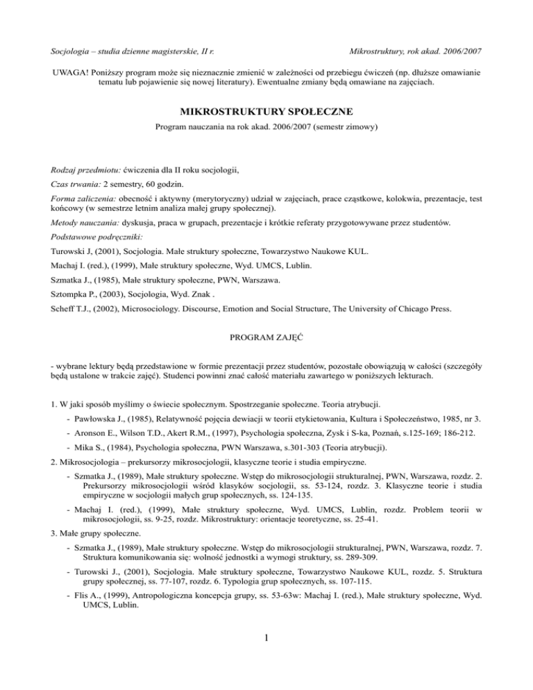 Socjologia – studia dzienne magisterskie, II r. Mikrostruktury, rok akad. 2006/2007 UWAGA! Poniższy program może się nieznacznie zmienić w zależności od przebiegu ćwiczeń (np. dłuższe omawianie tematu lub pojawienie się nowej literatury). Ewentualne zmiany będą omawiane na zajęciach. MIKROSTRUKTURY SPOŁECZNE Program nauczania na rok akad. 2006/2007 (semestr zimowy) Rodzaj przedmiotu: ćwiczenia dla II roku socjologii, Czas trwania: 2 semestry, 60 godzin. Forma zaliczenia: obecność i aktywny (merytoryczny) udział w zajęciach, prace cząstkowe, kolokwia, prezentacje, test końcowy (w semestrze letnim analiza małej grupy społecznej). Metody nauczania: dyskusja, praca w grupach, prezentacje i krótkie referaty przygotowywane przez studentów. Podstawowe podręczniki: Turowski J, (2001), Socjologia. Małe struktury społeczne, Towarzystwo Naukowe KUL. Machaj I. (red.), (1999), Małe struktury społeczne, Wyd. UMCS, Lublin. Szmatka J., (1985), Małe struktury społeczne, PWN, Warszawa. Sztompka P., (2003), Socjologia, Wyd. Znak . Scheff T.J., (2002), Microsociology. Discourse, Emotion and Social Structure, The University of Chicago Press. PROGRAM ZAJĘĆ - wybrane lektury będą przedstawione w formie prezentacji przez studentów, pozostałe obowiązują w całości (szczegóły będą ustalone w trakcie zajęć). Studenci powinni znać całość materiału zawartego w poniższych lekturach. 1. W jaki sposób myślimy o świecie społecznym. Spostrzeganie społeczne. Teoria atrybucji. - Pawłowska J., (1985), Relatywność pojęcia dewiacji w teorii etykietowania, Kultura i Społeczeństwo, 1985, nr 3. - Aronson E., Wilson T.D., Akert R.M., (1997), Psychologia społeczna, Zysk i S-ka, Poznań, s.125-169; 186-212. - Mika S., (1984), Psychologia społeczna, PWN Warszawa, s.301-303 (Teoria atrybucji). 2. Mikrosocjologia – prekursorzy mikrosocjologii, klasyczne teorie i studia empiryczne. - Szmatka J., (1989), Małe struktury społeczne. Wstęp do mikrosocjologii strukturalnej, PWN, Warszawa, rozdz. 2. Prekursorzy mikrosocjologii wśród klasyków socjologii, ss. 53-124, rozdz. 3. Klasyczne teorie i studia empiryczne w socjologii małych grup społecznych, ss. 124-135. - Machaj I. (red.), (1999), Małe struktury społeczne, Wyd. UMCS, Lublin, rozdz. Problem teorii w mikrosocjologii, ss. 9-25, rozdz. Mikrostruktury: orientacje teoretyczne, ss. 25-41. 3. Małe grupy społeczne. - Szmatka J., (1989), Małe struktury społeczne. Wstęp do mikrosocjologii strukturalnej, PWN, Warszawa, rozdz. 7. Struktura komunikowania się: wolność jednostki a wymogi struktury, ss. 289-309. - Turowski J., (2001), Socjologia. Małe struktury społeczne, Towarzystwo Naukowe KUL, rozdz. 5. Struktura grupy społecznej, ss. 77-107, rozdz. 6. Typologia grup społecznych, ss. 107-115. - Flis A., (1999), Antropologiczna koncepcja grupy, ss. 53-63w: Machaj I. (red.), Małe struktury społeczne, Wyd. UMCS, Lublin. 1 Socjologia – studia dzienne magisterskie, II r. Mikrostruktury, rok akad. 2006/2007 4. Procesy grupowe (ćwiczenie). - Aronson E., Wilson T.D., Akert R.M., (1997), Psychologia społeczna, Zysk i S-ka, Poznań, ss. 355-399. 5. Natura – społeczeństwo. - Turowski J., (2001), Socjologia. Małe struktury społeczne, Towarzystwo Naukowe KUL, rozdz. 1. Człowiek jako istota społeczna, ss. 7 – 17, rozdz. 2. Jednostka a społeczeństwo, ss. 17-37. 6. Socjalizacja jednostki w małych grupach. - Turowski J., (2001), Socjologia. Małe struktury społeczne, Towarzystwo Naukowe KUL, rozdz. 3. Osobowość, socjalizacja, postawy, ss. 37-57. - Konecki K., (2005), Ludzie i ich zwierzęta. Interakcjonistyczno-symboliczna analiza społecznego świata właścicieli zwierząt domowych, Wyd. Naukowe Scholar, Warszawa, rozdz. 2. Zwierzęta domowe w polskiej rodzinie. Interakcjonistyczna analiza procesu socjalizacji zwierząt domowych, ss. 39-67, rozdz. 3. Zwierzęta w życiu dzieci, ss. 67-79. 7. Jaźń i tożsamość. - Konecki K., (2005), Ludzie i ich zwierzęta. Interakcjonistyczno-symboliczna analiza społecznego świata właścicieli zwierząt domowych, Wyd. Naukowe Scholar, Warszawa, rozdz. 7. Cielesność a interakcja symboliczna i konstruowanie jaźni, ss. 166-185. - Stewart E.A., (2000), Towards the social analysis of twinship, British Journal of Sociology Vol. 51 Issue No. 4 (Dec) (wybór). - March K., (2000), Who Do I Look Like? Gaining a Sense of Self-Authenticity Through the Physical Reflections of Others, Symbolic Interaction, Vol. 23, No. 4 (wybór). 8. Władza, przywództwo, style kierowania w małych grupach (ćwiczenie). - White R., Lippitt R., Zachowania przywódcy a reakcja członków grupy w trzech typach „klimatów społecznych” (maszynopis). - Szmatka J., (1989), Małe struktury społeczne. Wstęp do mikrosocjologii strukturalnej, PWN, Warszawa, rozdz. 8. Struktura przywództwa: wpływ kontekstu strukturalnego na cechy indywidualnej jednostki, ss. 309-329. 9. Relacje w małych grupach – więzienie, instytucje totalne. - Konecki K., (1985), Jaźń w totalnej instytucji obozu koncentracyjnego, Kultura i Społeczeństwo nr 3. - Haney C., Banks C., Zimbardo P., (2002) Więźniowie i strażnicy – badanie w symulowanym więzieniu, [w:] Aronson E. (red.) Człowiek istota społeczna. Wybór tekstów, ss. 83 – 102, PWN. - Kamiński M., (2004) Gry więźniów. Podział ról społecznych w instytucji totalnej, Studia Socjologiczne 3/2004 nr 147. - Greer K., (2000), Walking an Emotional Tightrope: Managing Emotions in a Women`s Prison, Symbolic Interaction 2002, Vol. 25, No 1(wybór). - Scarce R., (2002), Doing Time as an Act of Survival, Symbolic Interaction, Vol. 25, no. 3 (wybór). 10. Teoria grup odniesienia. - Merton R.K., (1978) Elementy teorii grup odniesienia, [w:] Szmatka J., Elementy mikrosocjologii (wybór tekstów), Uniwersytet Jagielloński (wybór). - Turowski J., (2001), Socjologia. Małe struktury społeczne, Towarzystwo Naukowe KUL, rozdz. 7. Teoria grup odniesienia, 
