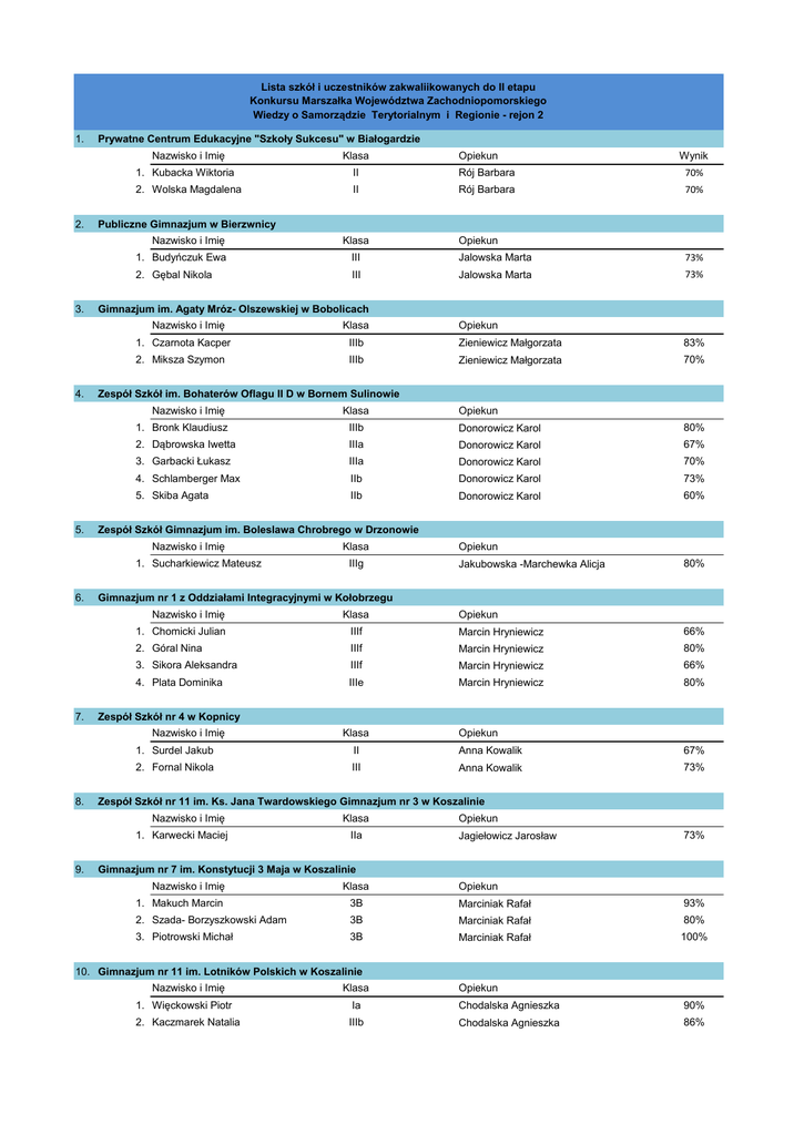 Lista szkół i uczestników zakwaliikowanych do II etapu Konkursu Marszałka Województwa Zachodniopomorskiego Wiedzy o Samorządzie Terytorialnym i Regionie - rejon 2 1. Prywatne Centrum Edukacyjne "Szkoły Sukcesu" w Białogardzie Nazwisko i Imię 2. 70% 2. Wolska Magdalena II Rój Barbara 70% Publiczne Gimnazjum w Bierzwnicy Jalowska Marta 73% 2. Gębal Nikola III Jalowska Marta 73% Gimnazjum im. Agaty Mróz- Olszewskiej w Bobolicach Zieniewicz Małgorzata 83% 2. Miksza Szymon IIIb Zieniewicz Małgorzata 70% Zespół Szkół im. Bohaterów Oflagu II D w Bornem Sulinowie Klasa Opiekun 1. Bronk Klaudiusz IIIb Donorowicz Karol 80% 2. Dąbrowska Iwetta IIIa Donorowicz Karol 67% 3. Garbacki Łukasz IIIa Donorowicz Karol 70% 4. Schlamberger Max IIb Donorowicz Karol 73% 5. Skiba Agata IIb Donorowicz Karol 60% Zespół Szkół Gimnazjum im. Boleslawa Chrobrego w Drzonowie Klasa IIIg Opiekun Jakubowska -Marchewka Alicja 80% Gimnazjum nr 1 z Oddziałami Integracyjnymi w Kołobrzegu Klasa Opiekun 1. Chomicki Julian IIIf Marcin Hryniewicz 66% 2. Góral Nina IIIf Marcin Hryniewicz 80% 3. Sikora Aleksandra IIIf Marcin Hryniewicz 66% 4. Plata Dominika IIIe Marcin Hryniewicz 80% Zespół Szkół nr 4 w Kopnicy Nazwisko i Imię Klasa Opiekun 1. Surdel Jakub II Anna Kowalik 67% 2. Fornal Nikola III Anna Kowalik 73% Zespół Szkół nr 11 im. Ks. Jana Twardowskiego Gimnazjum nr 3 w Koszalinie Nazwisko i Imię 1. Karwecki Maciej 9. Opiekun IIIb Nazwisko i Imię 8. Klasa 1. Czarnota Kacper Nazwisko i Imię 7. Opiekun III 1. Sucharkiewicz Mateusz 6. Klasa 1. Budyńczuk Ewa Nazwisko i Imię 5. Wynik Rój Barbara Nazwisko i Imię 4. Opiekun II Nazwisko i Imię 3. Klasa 1. Kubacka Wiktoria Klasa IIa Opiekun Jagiełowicz Jarosław 73% Gimnazjum nr 7 im. Konstytucji 3 Maja w Koszalinie Nazwisko i Imię Klasa Opiekun 1. Makuch Marcin 3B Marciniak Rafał 2. Szada- Borzyszkowski Adam 3B Marciniak Rafał 80% 3. Piotrowski Michał 3B Marciniak Rafał 100% 93% 10. Gimnazjum nr 11 im. Lotników Polskich w Koszalinie Nazwisko i Imię Klasa Opiekun 1. Więckowski Piotr Ia Chodalska Agnieszka 90% 2. Kaczmarek Natalia IIIb Chodalska Agnieszka 86% 11. Zespół Szkół nr 13 Gimnazjum nr 5 w Koszalinie Nazwisko i Imię Klasa Opiekun 1. Żmuda Kinga IIIA Rosłan Halina 67% 2. Król Mateusz IIIA Rosłan Halina 83% 3. Szyliński Waldemar IIIA Rosłan Halina 63% 4. Dywelska Agnieszka IIIA Rosłan Halina 80% 5. Tucka Nikola IIIA Rosłan Halina 70% 6. Dudczak Zuzanna IIIA Rosłan Halina 67% 7. Tarasewicz Julia IIIA Rosłan Halina 67% 8. Wilkin Piotr IIIA Rosłan Halina 70% 12. Gimnazjum nr 9 im. Noblistów Polskich w Koszalinie Nazwisko i Imię Klasa 1. Czesyk Anna IIb Opiekun Maciejewski Krzysztof 67% 13. Katolickie Gimnazjm w Koszalinie Nazwisko i Imię Klasa Opiekun 1. Górny Szymon III Wiśniewska Teresa 90% 2. Wiśniewski Krzysztof II Wiśniewska Teresa 86% 14. Zespół Szkół im. Ludzi Morza w Mścicach Nazwisko i Imię Klasa Opiekun 1. Dżuga Katarzyna IIIa Skonieczny Tomasz 80% 2. Nyga Jonatan IIIa Skonieczny Tomasz 67% 3. Śliwińksa Natalia IIIb Skonieczny Tomasz 80% 4. Zarzycki Mateusz IIIb Skonieczny Tomasz 60% 15. Gimnazjum im. Ignacego Krasickiego w Pomianowie Nazwisko i Imię Klasa Opiekun 1. Zawadzka Agata IIIa Rój Barbara 80% 2. Małecka Marlena IIIa Rój Barbara 80% 3. Chódzyńska Patrycja IIIb Rój Barbara 70% 4. Zacharek Katarzyna IIIb Rój Barbara 67% 16. Publiczne Gimnazjum nr 2 im. Roberta Schumana w Wałczu Nazwisko i Imię Klasa 1. Komorowski Michał IIIA Opiekun Ferenc Maria 60% 17. Zespół Szkół Miejskich Gimnazjum nr 1 w Wałczu Nazwisko i Imię Klasa Opiekun 1. Sadło Anna Iic Sadlej Joanna 70% 2. Kasielski Rafał IIc Sadlej Joanna 67% 3. Kuternowski Jakub IIc Sadlej Joanna 63% 4. Czaszyński Maciej Ib Sadlej Joanna 73% 5. Sinoradzki Krystian Ib Sadlej Joanna 87% 6. Sobecki Jakub Ib Sadlej Joanna 60% 7. Kosidło Lidia IIIc Sadlej Joanna 70% 8. Grzybkowska Barbara IIb Sadlej Joanna 60% 18. Gimnazjum im. Jana Pawła II w Wierzchowie Nazwisko i Imię Klasa Opiekun 1. Retkowski Kamil III Samulewska Katarzyna 93% 2. Ambroziak Dominik III Samulewska Katarzyna 63% 3. Czerepaniak Martyna III Samulewska Katarzyna 70% 4. Safaryn Martyna II Samulewska Katarzyna 70% 5. Romaniec Wojciech II Samulewska Katarzyna 60% 6. Kędzierski Wojciech III Samulewska Katarzyna 73% 19. Zespół Szkół w Wierzchowie Nazwisko i Imię 1. Kot Wiktoria Klasa III Opiekun Giermakowska Helena 60% 20. Zespół Szkół w Złocieńcu Nazwisko i Imię Klasa Opiekun 1. Łyżwińska Daria IIIa Kaczmarek Aleksandra 70% 2. Żurek Dominika IIIa Kaczmarek Aleksandra 70% 3. Zacharzewski Eryk IIa Kaczmarek Aleksandra 60% 4. Osak Maciej Ia Kaczmarek Aleksandra 60%