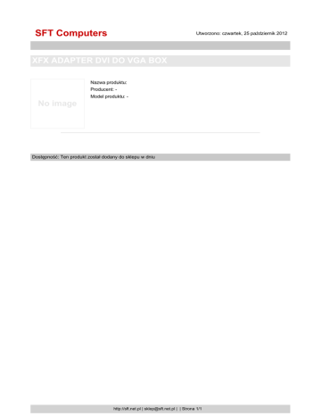 SFT Computers Utworzono: czwartek, 25 październik 2012 XFX ADAPTER DVI DO VGA BOX Nazwa produktu: Producent: Model produktu: - No image Dostępność: Ten produkt został dodany do sklepu w dniu http://sft.net.pl | [email protected] | | Strona 1/1