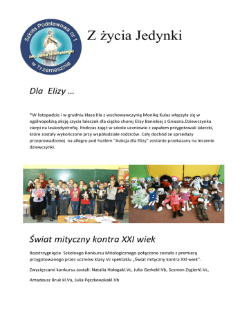 Z życia Jedynki Dla Elizy … *W listopadzie i w grudniu klasa IIIa z wychowawczynią Moniką Kulas włączyła się w ogólnopolską akcję szycia laleczek dla ciężko chorej Elizy Banickiej z Gniezna.Dziewczynka cierpi na leukodystrofię. Podczas zajęd w szkole uczniowie z zapałem przygotowali laleczki, które zostały wykooczone przy współudziale rodziców. Cały dochód ze sprzedaży przeprowadzonej na allegro pod hasłem "Aukcja dla Elizy" zostanie przekazany na leczenie dziewczynki. Świat mityczny kontra XXI wiek Rozstrzygnięcie Szkolnego Konkursu Mitologicznego połączone zostało z premierą przygotowanego przez uczniów klasy Vc spektaklu „Świat mityczny kontra XXI wiek”. Zwycięzcami konkursu zostali: Natalia Hołogakl.Vc, Julia Gerkekl.Vb, Szymon Zygierkl.Vc, Amadeusz Bruk kl.Va, Julia Pęczkowskakl.Vb Szkolny etap Konkursu Wiedzy o Wielkopolsce Celem eliminacji szkolnych było wyłonienie uczniów, którzy będą reprezentowali naszą szkołę w etapie powiatowym Konkursu Wiedzy o Wielkopolsce. Do kolejnego etapu zakwalifikowali się: Olga Wożniak kl.IVd, Jagoda Białek kl.IVa, Martyna Wekwerthkl.IVa; Kacper Kuś kl.Vb, Paulina Gaca kl.Vb, Mikołaj Korzyckikl.Vb; uczniowie klas szóstych – laureaci poprzednich konkursów – otrzymali zaproszenie do wzięcia udziału w konkursie bez wcześniejszych eliminacji, są to: Kacper Głowala , Dominika Ferenc, Marika Jaskuła. Wiadomości ekologiczne *Klasa IV c przez trzy dni wzbogacała swą wiedzę w Centrum Edukacji Ekologicznej w Myślęcinku. Uczniowie korzystali z zajęd edukacyjnych o tematyce przyrodniczo-ekologicznej; odwiedzili ogród botaniczny, pracownię mikroskopową i laboratorium, gdzie przeprowadzili analizę wody z okolicznych jezior; próbowali jazdy konnej, brali udział w konkursach przyrodniczych. *W nagrodę za prowadzone przez wiele lat akcje ekologiczne p. Ewa Kaźmierska oraz uczennice: Jagoda Przybylska i SandraStrzelinska zostały zaproszone przez fundację RECAL na „zieloną szkołę” do Sielpi Wielkiej. Fundacja ta zajmuje się w Polsce odzyskiem puszek aluminiowych. Na miejscu spotkali się koordynatorzy szkolnych projektów ekologicznych z całego kraju. Jagoda i Sandra na wieczornym spotkaniu zaprezentowały dorobek ekologiczny naszej szkoły oraz prowadzone akcje. Następnego dnia zwiedziły fabrykę Pepsi Coli w Michrowie oraz zakład recyklingu puszek. Ogromną atrakcją był „Park Linowy”, w którym dziewczęta poradziły sobie znakomicie. *Nasza szkoła jest jedną ze 170 szkół podstawowych z obszaru całej Polski, które biorą udział w konkursie dotyczącym właściwego postępowania ze zużytym sprzętem elektrycznym i elektronicznym. Szkolny zespół konkursowy tworzą: Jagoda Przybylska, Oliwia Rodak, Szymon Sydorowicz, Janusz Koteras, Oktawian Jasudowicz, jego opiekunem jest p. Ewa Kaźmierska. Realizację pierwszych zadao: stworzenie mapy gminy wraz z miejscami dzikich wysypisk i punktami zbiórki elektrośmieci oraz projekt gry edukacyjnej zakooczymy w styczniu. *Od początku roku szkolnego trwa zbiórka surowców wtórnych: makulatury, puszek aluminiowych, baterii i plastikowych nakrętek. Aktualności sportowe *14 listopada 2012 r. odbyły się Mistrzostwa Miasta i Gminy Trzemeszno w unihokeju dziewcząt i chłopców. W rozgrywkach wzięły udział 3 drużyny: SP2 Trzemeszno, SP Trzemżal oraz SP1 Trzemeszno. Wszystkie zespoły dzielnie walczyły. Dziewczęta i chłopcy uplasowali się na poszczególnych miejscach: IIIIII- SP1 Trzemeszno SP Trzemżal SP2 Trzemeszno. SP1 Trzemeszno, wygrywając zawody, wzięła udział w eliminacjach do Mistrzostw Powiatu. O awans walczyły z nami zespoły z Fałkowa, Szczytnik Duchownych i Łubowa. W kategorii dziewcząt nasza reprezentacja zwyciężyła, natomiast chłopcy zajęli drugie miejsce. *4 grudnia 2012 r. w Niechanowie reprezentacja dziewcząt spotkała się z najlepszymi drużynami w powiecie: SP3 Gniezno i SP Niechanowo. Dzięki walecznej postawie, dziewczęta wygrały z zespołem z Gniezna, natomiast uległy zespołowi z Niechanowa. Oto koocowa klasyfikacja: IIIIII- SP Niechanowo SP1 Trzemeszno SP3 Gniezno. *10 grudnia 2012 r. w hali sportowej w Trzemesznie rozegrane zostały Mistrzostwa Miasta i Gminy Trzemeszno w piłce siatkowej dziewcząt i chłopców. Tym razem udział w zawodach wzięły wszystkie drużyny z gminy. Mecze dziewcząt i chłopców rozgrywane były na równoległych boiskach, systemem „każdy z każdym”. Rywalizacja trwała do dwóch wygranych setów. Ostatecznie, w obu kategoriach miejsce I zajęła nasza szkoła, kwalifikując się do dalszych rozgrywek. Mistrzostwo Powiatu! * 13 grudnia w Kłeckuodbyły się Mistrzostwa Powiatu w piłkę ręczną.W zawodach startowały 4 zespoły z następujących szkół: SP12 Gniezno,SP Kłecko,SP Niechanowo i SP1 Trzemeszno. Uczniowie z naszej szkoły toczyli bardzo zacięte mecze,rozgrywając z meczu na mecz coraz lepsze spotkania,dostosowując się szybko do znacznie większego boiska w porównaniu z salą w naszej szkole. Pierwszy mecz zremisowaliśmy 8:8 z SP 12 Gniezno(faworytem turnieju),kolejny wygraliśmy 14:7 ze szkołą z Niechanowa(zespołem o najlepszych warunkach fizycznych). W ostatnim meczu, decydującym o zwycięstwie również zwyciężyliśmy,pokonując gospodarza zawodów SP Kłecko 15:8. Na słowa uznania zasługuje cały zespół,który właściwą taktyką na boisku nie pozwolił pograd przeciwnikom.Piękne bramki po bardzo szybkich akcjach zdobyli:Szymon Sochacki,Eryk Grzegorski,Bruno Kaźmierczak,Damian Psuty. Chłopcy zdobyli I miejsce, okazały puchar i możliwośd reprezentowania powiatu gnieźnieoskiego w rozgrywkach wojewódzkich.Gratulujemy naszym reprezentantom i życzymy powodzenia. Oto skład zwycięskiego zespołu: Artur Stepaniak ( kapitan ), ErykGrzegorski ,Szymon Sochacki , Adam Mietlicki ( bramkarz ),Bruno Kaźmierczak , Damian Psuty , Oskar Kiełpioski , KrystianStaszewski , Krzesimir Kiełpioski , Bartosz Soba