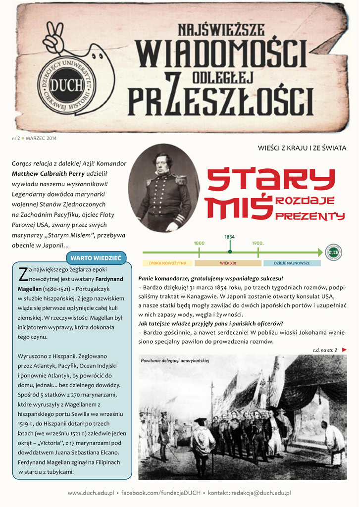 nr 2 MARZEC 2014 WIEŚCI Z KRAJU I ZE ŚWIATA STARY , MIS Gorąca relacja z dalekiej Azji! Komandor Matthew Calbraith Perry udzielił wywiadu naszemu wysłannikowi! rozdaje prezenty Legendarny dowódca marynarki wojennej Stanów Zjednoczonych na Zachodnim Pacyfiku, ojciec Floty Parowej USA, zwany przez swych marynarzy „Starym Misiem”, przebywa 1854 1800 obecnie w Japonii… Z WARTO WIEDZIEĆ 1900. EPOKA NOWOŻYTNA WIEK XIX DZIEJE NAJNOWSZE a największego żeglarza epoki nowożytnej jest uważany Ferdynand Magellan (1480-1521) − Portugalczyk w służbie hiszpańskiej. Z jego nazwiskiem wiąże się pierwsze opłynięcie całej kuli ziemskiej. W rzeczywistości Magellan był inicjatorem wyprawy, która dokonała tego czynu. Panie komandorze, gratulujemy wspaniałego sukcesu! − Bardzo dziękuję! 31 marca 1854 roku, po trzech tygodniach rozmów, podpisaliśmy traktat w Kanagawie. W Japonii zostanie otwarty konsulat USA, a nasze statki będą mogły zawijać do dwóch japońskich portów i uzupełniać w nich zapasy wody, węgla i żywności. Jak tutejsze władze przyjęły pana i pańskich oficerów? − Bardzo gościnnie, a nawet serdecznie! W pobliżu wioski Jokohama wzniesiono specjalny pawilon do prowadzenia rozmów. c.d. na str. 2 Wyruszono z Hiszpanii. Żeglowano Powitanie delegacji amerykańskiej przez Atlantyk, Pacyfik, Ocean Indyjski i ponownie Atlantyk, by powrócić do domu, jednak... bez dzielnego dowódcy. Spośród 5 statków z 270 marynarzami, które wyruszyły z Magellanem z hiszpańskiego portu Sewilla we wrześniu 1519 r., do Hiszpanii dotarł po trzech latach (we wrześniu 1521 r.) zaledwie jeden okręt − „Victoria”, z 17 marynarzami pod dowództwem Juana Sebastiana Elcano. Ferdynand Magellan zginął na Filipinach w starciu z tubylcami. www.duch.edu.pl facebook.com/fundacjaDUCH kontakt: [email protected] Najświeższe Wiadomości z Odległej Przeszłości Czy byliście, panowie, odpowiednio przygotowani do spotkania? − Oczywiście! Reprezentujemy przecież rząd Stanów Zjednoczonych! Każdy japoński urzędnik otrzymał w prezencie strzelbę i rewolwer, zegarek i nieco whisky! Ofiarowaliśmy także nowoczesny teleskop oraz gotowy do użytku telegraf. Szczególnie spodobał się naszym gospodarzom duży model lokomotywy parowej wraz z kompletem szyn. To wspaniałe prezenty! A czym zrewanżowali się Japończycy? − Cóż, tutejszy przemysł nie ma się czym pochwalić… Podarowano nam wyroby miejscowego rzemiosła: wspaniałe pamiątki z jedwabiu, brązu, Samurajowie w tradycyjnych strojach piękną ceramikę. Specjalnie dla nas urządzono pokaz zapasów. Są tu bardzo popularne. Miejscowi nazywają je sumo. Uczestniczący w nich zawodnicy to prawdziwe grubasy! Ich zmagania wydały się nam dość śmieszne. Nie ma to jednak jak nasz, amerykański boks! Uroczystym wizytom często towarzyszą różne zabawne zdarzenia. Czy i panom przytrafiło się coś podobnego? − Przy spotkaniu przedstawicieli dwóch różnych kultur musi dojść do niecodziennych sytuacji… Japońskie damy nie uczestniczą w oficjalnych spotkaniach. Gdy, jak prawdziwi gentlemani, wznieśliśmy toast za zdrowie pań, nasi gospodarze byli bardzo rozbawieni. Powody do śmiechu mieli też nasi marynarze, gdy oficerowie ruszyli do tańca z samurajami! Cóż, co kraj, to obyczaj… Kim są samurajowie? − To rycerze – wojownicy. Są bardzo dumni. Obowiązuje ich surowy kodeks honorowy – bushido. Podobnie jak wszyscy Japończycy z prawdziwą czcią odnoszą się do osoby cesarza, którego uważają za boga. Mówią o nim mikado, nie ośmielają się nawet używać jego oficjalnego tytułu tenno – „król nieba”. Nie jest to pana pierwsza wizyta w Kraju Kwitnącej Wiśni… − To prawda. W lipcu 1853 roku w imieniu prezydenta USA przedstawiłem władzom japońskim propozycję zawarcia porozumienia handlowego między naszymi państwami. Teraz wróciliśmy po odpowiedź. Flotylla dziewięciu okrętów zrobiła tu duże wrażenie! Obie wyprawy były ryzykowne i niebezpieczne… − Muszę przyznać, że nie wiedzieliśmy, co nas spotka... Japonia nie utrzymuje jakichkolwiek stosunków ze światem. www.duch.edu.pl nr 2 MARZEC 2014 To tajemniczy kraj. Najwyższa władza należy do cesarza, ale rządy sprawuje jego namiestnik – shogun. Dowodzi on wojskiem i kontroluje całe państwo. Od 250 lat urząd ten pełnią przedstawiciele rodu Tokugawa. Shogunowie zakazali Japończykom zagranicznych podróży i jakichkolwiek kontaktów z innymi państwami. Dlatego niewiele wiadomo o Japonii. Czy nikt do tej pory nie starał się nawiązać współpracy z Japonią? − Śmiałków było wielu! Podejmowane przez nich próby kończyły się jednak niepowodzeniem. Dopiero nasza misja nieco uchyliła zamknięte dotąd drzwi. Panie komandorze, jak pan sądzi, czy podpisany w Kanagawie traktat zmieni coś w życiu Kraju Kwitnącej Wiśni? − Przypuszczam, że Japonia będzie poszerzała swe kontakty z Ameryką i Europą. Japończycy są bardzo ciekawi świata. Na pewno wyruszą za granicę. Niedługo będą wiedzieć więcej o nas, niż my o nich! Myślę, że Japonię czekają wielkie zmiany. WARTO WIEDZIEĆ W 1868, czternaście lat po wizycie komandora Perry’ego, na tron wstąpił młody cesarz Mutsuhito. Za jego panowania rozpoczął się okres głębokich reform − Meiji − Oświecenie. Shogun odsunięty został od władzy, wprowadzono ustrój wzorowany na zachodnim, uproszczono podziały społeczne. Młodzi Japończycy studiowali na europejskich i amerykańskich uczelniach. Rozbudowywano przemysł. Stworzono kolej, pocztę i sieć telegraficzną. Wprowadzono zachodni kalendarz. Japonia stawała się nowoczesnym, potężnym państwem. Nie rezygnowano jednak z tradycji. Samurajowie ściśle przestrzegali reguł swego kodeksu, a cesarz wciąż uznawany był za bóstwo. facebook.com/fundacjaDUCH Cesarz Mutsuhito 1852-1912 kontakt: [email protected] Najświeższe Wiadomości z Odległej Prze