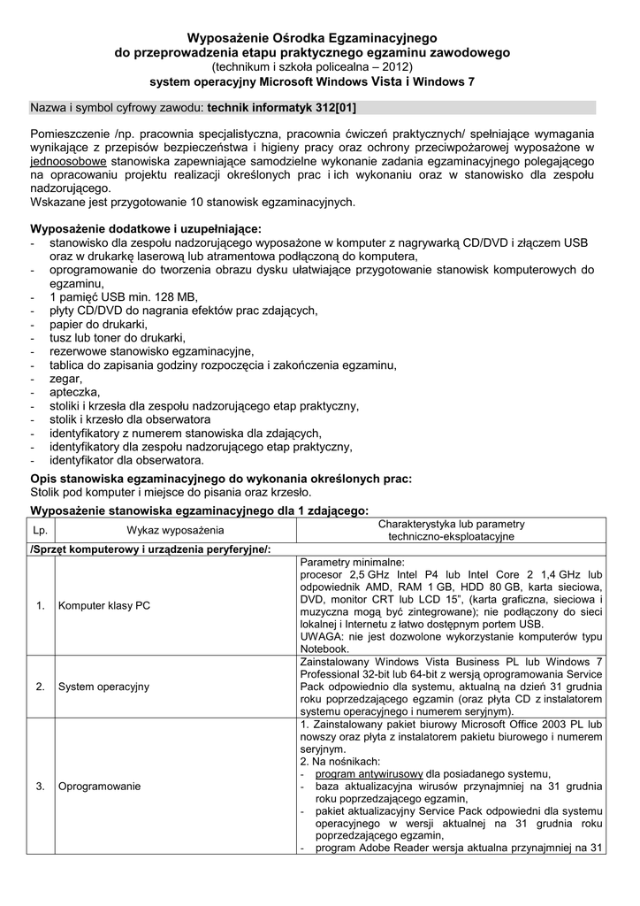 Wyposażenie Ośrodka Egzaminacyjnego do przeprowadzenia etapu praktycznego egzaminu zawodowego (technikum i szkoła policealna – 2012) system operacyjny Microsoft Windows Vista i Windows 7 Nazwa i symbol cyfrowy zawodu: technik informatyk 312[01] Pomieszczenie /np. pracownia specjalistyczna, pracownia ćwiczeń praktycznych/ spełniające wymagania wynikające z przepisów bezpieczeństwa i higieny pracy oraz ochrony przeciwpożarowej wyposażone w jednoosobowe stanowiska zapewniające samodzielne wykonanie zadania egzaminacyjnego polegającego na opracowaniu projektu realizacji określonych prac i ich wykonaniu oraz w stanowisko dla zespołu nadzorującego. Wskazane jest przygotowanie 10 stanowisk egzaminacyjnych. Wyposażenie dodatkowe i uzupełniające: - stanowisko dla zespołu nadzorującego wyposażone w komputer z nagrywarką CD/DVD i złączem USB oraz w drukarkę laserową lub atramentowa podłączoną do komputera, - oprogramowanie do tworzenia obrazu dysku ułatwiające przygotowanie stanowisk komputerowych do egzaminu, - 1 pamięć USB min. 128 MB, - płyty CD/DVD do nagrania efektów prac zdających, - papier do drukarki, - tusz lub toner do drukarki, - rezerwowe stanowisko egzaminacyjne, - tablica do zapisania godziny rozpoczęcia i zakończenia egzaminu, - zegar, - apteczka, - stoliki i krzesła dla zespołu nadzorującego etap praktyczny, - stolik i krzesło dla obserwatora - identyfikatory z numerem stanowiska dla zdających, - identyfikatory dla zespołu nadzorującego etap praktyczny, - identyfikator dla obserwatora. Opis stanowiska egzaminacyjnego do wykonania określonych prac: Stolik pod komputer i miejsce do pisania oraz krzesło. Wyposażenie stanowiska egzaminacyjnego dla 1 zdającego: Lp. Wykaz wyposażenia Charakterystyka lub parametry techniczno-eksploatacyjne /Sprzęt komputerowy i urządzenia peryferyjne/: 1. Komputer klasy PC 2. System operacyjny 3. Oprogramowanie Parametry minimalne: procesor 2,5 GHz Intel P4 lub Intel Core 2 1,4 GHz lub odpowiednik AMD, RAM 1 GB, HDD 80 GB, karta sieciowa, DVD, monitor CRT lub LCD 15”, (karta graficzna, sieciowa i muzyczna mogą być zintegrowane); nie podłączony do sieci lokalnej i Internetu z łatwo dostępnym portem USB. UWAGA: nie jest dozwolone wykorzystanie komputerów typu Notebook. Zainstalowany Windows Vista Business PL lub Windows 7 Professional 32-bit lub 64-bit z wersją oprogramowania Service Pack odpowiednio dla systemu, aktualną na dzień 31 grudnia roku poprzedzającego egzamin (oraz płyta CD z instalatorem systemu operacyjnego i numerem seryjnym). 1. Zainstalowany pakiet biurowy Microsoft Office 2003 PL lub nowszy oraz płyta z instalatorem pakietu biurowego i numerem seryjnym. 2. Na nośnikach: - program antywirusowy dla posiadanego systemu, - baza aktualizacyjna wirusów przynajmniej na 31 grudnia roku poprzedzającego egzamin, - pakiet aktualizacyjny Service Pack odpowiedni dla systemu operacyjnego w wersji aktualnej na 31 grudnia roku poprzedzającego egzamin, - program Adobe Reader wersja aktualna przynajmniej na 31 grudnia roku poprzedzającego egzamin, sterowniki do komputera (płyta główna, karta sieciowa, graficzna, muzyczna). Dokumentacja płyty głównej komputera zawierająca opis BIOS Setup i instrukcja obsługi monitora dostępne na każdym stanowisku w postaci wydruku lub w wersji elektronicznej. - Instrukcje specjalistyczne lub dokumentacja: 2