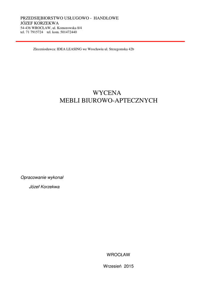PRZEDSIĘBIORSTWO USŁUGOWO - HANDLOWE JÓZEF KORZEKWA 54-436 WROCŁAW, ul. Komorowska 8/4 tel. 71 7915724 tel. kom. 501472440 Zleceniodawca: IDEA LEASING we Wrocławiu ul. Strzegomska 42b WYCENA MEBLI BIUROWO-APTECZNYCH Opracowanie wykonał Józef Korzekwa WROCŁAW Wrzesień 2015 2 WYCENA MEBLI BIUROWO-APTECZNYCH 1.Podstawa formalna Podstawą opracowania opinii technicznej jest zlecenie IDEA LEASING S.A. we Wrocławiu ul. Strzegomska 42b. z dnia 23.09.2015r. 2.Podstawa merytoryczna Merytoryczną podstawę opracowania stanowią: - Oferty firmy IWO - Informacje o wyposażeniu i cenach maszyn strony internetowe 3.Cel opracowania Celem opracowania jest określenie stanu technicznego i ustalenie aktualnej wartości rynkowej mebli celem ich sprzedaży. 4.Wizja lokalna W dniu 23.09.2015 r. dokonano oględzin oraz wykonano fotografie mebli w miejscu ich składowania t.j. w magazynie składowym Idea Leasing we Wrocławiu przy ul. Góralskiej 46. Wyjaśnień oraz pomocy podczas oględzin udzielił przedstawiciel Idea Leasing. 5. Analiza wyników oględzin W wyniku oględzin ustalono następujące dane: Producent KOMANDOR Rok produkcji (zakupu) 2013 Meble stanowiące wyposażenie lokalu apteki są w stanie zdemontowanym złożone w magazynie. Szafa typu komandor z przesuwnymi drzwiami wykonana z płyty meblowej gr. 18 mm, krawędzie zabezpieczone ABS 2 mm. Stan techniczny określony na podstawie oględzin dobry. Mebel bez śladów uszkodzeń, zniszczeń i zużycia. 6. Ustalenie aktualnej wartości rynkowej Model wykonany na indywidualne zamówienie, przystosowany kształtem i wielkością do konkretnego pomieszczenia. Wyceny dokonano metodą odtworzeniową przy zastosowaniu wzoru: W = C ( 1 - s/100 ) x n x k x r gdzie: 3 W – wartość aktualna odtworzeniowa mebli C - wartość nowych mebli według ceny producenta s - stopień zużycia technicznego n - wskaźnik podobieństwa mebli wycenianych do mebli stanowiących podstawę wyceny k - wskaźnik nowoczesności, określony przy pomocy wzoru: k = 1 - α (Te - 1 ) gdzie: α - wskaźnik empiryczny Te - ilość lat eksploatacji r – wskaźnik równowagi rynkowej Na podstawie zasad wycen Państwowej Komisji Cen /Zarządzenie nr 308/72/ i przeprowadzonych czynności sprawdzających oraz posiadanego doświadczenia ustalono wartości wskaźników. Meble – szafa głęboka typu KOMANDOR C – Do wyceny jako wartość wyjściową przyjęto cenę zakupu która wynosi 15 000 zł netto. n - wskaźnik podobieństwa wynosi 1,0 s – stopień zużycia technicznego oceniono na 30 % k – wskaźnik nowoczesności 0,99 przy α = 0,01 i dwa lata eksploatacji. r – wskaźnik równowagi rynkowej = 0,3 (meble dostosowane do określonego pomieszczenia). W = C ( 1 - s/100 ) x n x k x r = 15 000 (1-30/100) x 1,0 x 0,99 x 0,3 = 3 118 PLN Wartość rynkową mebli określa się na 3 100 PLN netto słownie: trzy tysiące sto zł.