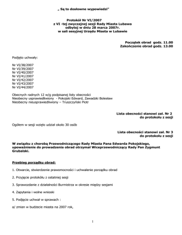„ Są to dosłowne wypowiedzi” Protokół Nr VI/2007 z VI -tej zwyczajnej sesji Rady Miasta Lubawa odbytej w dniu 28 marca 2007r. w sali sesyjnej Urzędu Miasta w Lubawie Początek obrad godz. 11.00 Zakończenie obrad godz. 13.00 Podjęto uchwały: Nr Nr Nr Nr Nr Nr Nr VI/38/2007 VI/39/2007 VI/40/2007 VI/41/2007 VI/42/2007 VI/43/2007 VI/44/2007 Obecnych radnych 12 w/g podpisanej listy obecności Nieobecny usprawiedliwiony - Pokojski Edward, Zawadzki Bolesław Nieobecny nieusprawiedliwiony – Truszczyński Piotr Lista obecności stanowi zał. Nr 2 do protokołu z sesji Ogółem w sesji wzięło udział około 30 osób Lista obecności stanowi zał. Nr 3 do protokołu z sesji W związku z chorobą Przewodniczącego Rady Miasta Pana Edwarda Pokojskiego, upoważnienie do prowadzenia obrad otrzymał Wiceprzewodniczący Rady Pan Zygmunt Grubalski. Przebieg porządku obrad: 1. Otwarcie, stwierdzenie prawomocności i uchwalenie porządku obrad 2. Przyjęcie protokółu z ostatniej sesji 3. Sprawozdanie z działalności Burmistrza w okresie między sesjami 4. Zapytania i wolne wnioski 5. Podjęcie uchwał w sprawach : a/ zmian w budżecie miasta na 2007 rok, 1 b/ wyrażenia zgody na nabycie nieruchomości w drodze darowizny, c/ określenia górnych stawek opłat za usługi w zakresie odbierania odpadów komunalnych od właścicieli nieruchomości i w zakresie opróżniania zbiorników bezodpływowych i transportu nieczystości ciekłych, d/ realizacji i współfinansowania projektu „Budowa boiska piłkarskiego z trawy syntetycznej przy ul. Św. Barbary 45 w Lubawie e/ wyrażenia zgody na zawarcie przez Burmistrza Miasta Lubawa umowy na dofinansowanie „Budowy boiska piłkarskiego z trawy syntetycznej przy ul. Św. Barbary 45 w Lubawie” oraz zabezpieczenia prawidłowego wydatkowania środków Funduszu Rozwoju Kultury Fizycznej, f/ rozwiązania Związku Gmin Trasy Kopernikańskiej Drogi Międzyregionalnej Nr 52 g/ wyrażająca opinię dotyczącą uchwały Rady Gminy Lubawa w sprawie likwidacji Samodzielnego Publicznego Zakładu Opieki Zdrowotnej Gminnego Ośrodka Zdrowia w Lubawie . 6. Przedstawienie protokołu Komisji Rewizyjnej z przeprowadzonej kontroli. 7. Zawiadomienie Skarbnika i Sekretarza o obowiązku złożenia oświadczenia lustracyjnego 8. Odpowiedzi na zapytania i wolne wnioski 9. Zakończenie obrad P. radny Piotrowicz – Panie Przewodniczący. Radni otrzymali trochę inny porządek dzisiejszych obrad, bo tak jak sprawdzamy tu, to punkt 6 jest całkowicie innego brzmienia. Ale właśnie chciałem zgłosić żeśmy usłyszeli pełny porządek obrad, a więc uważam, że wszystko jest w porządku. W wyniku przeprowadzonego jawnego glosowania Rada Miasta jednogłośnie uchwaliła zaproponowany porządek obrad. Ad.2 Przyjęcie protokołu z ostatniej sesji Protokół z V – tej zwyczajnej sesji Rady Miasta wyłożony był do wglądu w Referacie Organizacyjnym. Z treścią protokołu zaraz po jego napisaniu zapoznał się Przewodniczący Rady nie wnosząc żadnych uwag. W wyniku przeprowadzonego jawnego głosowania Rada Miasta 12 głosami „za”, „przy przeciwnym” - 0 głosie i „wstrzymującym się” – 0 głosie przyjęła protokół z V -tej zwyczajnej sesji Rady Miasta odbytej w dniu 28 lutego 2007r. Ad.3 Sprawozdanie Burmistrza w okresie między sesjami P. radny Piotrowicz – Panie Przewodniczący, Panie burmistrzu. Ja mam pytanie - do końca dobrze nie dosłyszałem, że nie doszedł do skutku przetarg ograniczony na sprzedaż obszaru przy Swedwood -e. Czy miasto będzie teraz w dalszy sposób postępowało w ten sposób, że ogłosi kolejny przetarg i obniży cenę wywoławczą? P. Burmistrz – odwołaliśmy przetarg i będziemy pertraktować w dalszym ciągu cenę gruntów. Sprawozdanie stanowi zał. Nr 4 do protokołu z sesji Ad.4 Zapytania i wolne wnioski P. radny Szczawiński – Panie Przewodniczący, Panie burmistrzu, Szanowni Państwo. Wiemy, że w naszym mieście jest wiele potrzeb. Są to mniejsze lub większe potrzeby. Te większe powiedziałbym, że 2 będą realizowane, będą zabiegane na te potrzeby o środki z zewnątrz i będą realizowane przy udziale podmiotów zewnętrznych m.in. myślę tu np. o budowie chodnika przy ulicy Kupnera, gdzie jak Pan burmistrz już informował Radę, w tej kadencji były prowadzone na ten temat rozmowy z władzami województwa, z Zarządem Dróg Wojewódzkich, z Dyrekcją Dróg Wojewódzkich i mam nadzieję, że te inwestycje dojdą do skutku i Pan burmistrz będzie nadal zabiegał o to żeby tak się stało, ale są też mniejsze potrzeby, na które nie trzeba środków zewnętrznych. Możemy je zrealizować sami z własnych środków. Są to inwestycje, które poprawią zarówno jakość życia w Lubawie, jak i poziom bezpieczeństwa i mam tu na uwadze również ulicę Kupnera. Chodzi mi konkretnie o oświetlenie. To oświetlenie jest tam w mojej ocenie bardzo potrzebne dlatego, że piesi poruszający się o zmroku są zagrożeni, jak również stwarza to zagrożenie dla poruszających się tam pojazdów. I żeby ta sprawa nie umknęła naszej uwadze, to już dzisiaj chciałbym zgłosić wniosek o umieszczenie tejże inwestycji w budżecie na rok 2008. Myślę, że wszyscy się zgodzimy z tym, że jest to naprawdę bardzo potrzebna inwestycja. Dziękuję bardzo. P. radny Gul – Szanowny Panie burmistrzu, Szanowna Rado. Ja mam może takie trochę odległe pytanie, może mniej ważne, ale dla niektórych mieszkańców, może będzie to ważne pytanie. To znaczy chodzi mi o jedną rzecz. Czy istnieje przyszłościowo taka możliwość w Lubawie, żeby otworzyć filię szkoły muzycznej. Czy są jakieś takie szanse ku temu, żeby stworzyć mały oddział, nie ogniska muzycznego, a szkołę muzyczną. Dziękuję. P. Wiceprzew. Rady Z. Grubalski – Proszę Państwa wpłynęło do Rady Miasta pismo z zapytaniami od Pana redaktora Kleiny. Pytania do Pana burmistrza na piśmie przedłożył i Pani Wiceprzewodnicząca R