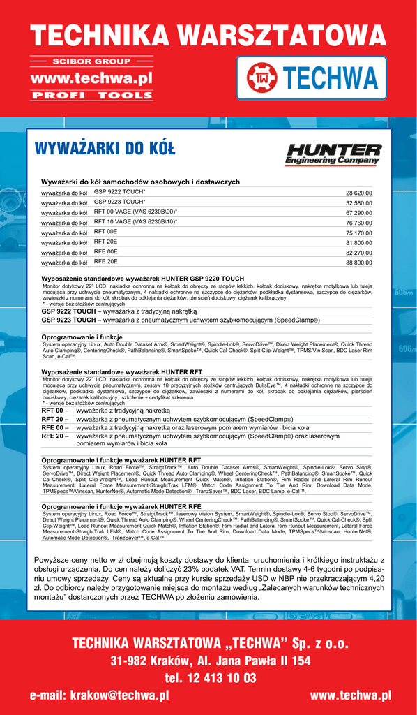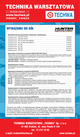TECHNIKA WARSZTATOWA WIMAD Wyposażanie serwisów samochodowych CENNIK HUNTER Engineering Company WIMAD Wyposażanie serwisów s WYWAŻARKI DO KÓŁ Cennik ważny od 01’2017 Wyważarki do kół samochodów Wyważarki do kół samochodów osobowych i dostawczych wyważarka do kół GSP 9222 TOUCH* 28 620,00 wyważarka do kół GSP 9223 TOUCH* 32 580,00 wyważarka do kół RFT 00 VAGE (VAS 6230B\00)* 67 290,00 wyważarka do kół RFT 10 VAGE (VAS 6230B\10)* 76 760,00 wyważarka do kół RFT 00E 75 170,00 wyważarka do kół RFT 20E wyważarka do kół RFE 00E wyważarka do kół RFE 20E Wyposażenie standardowe wyważarek HUNTER GSP 9220 TOUCH 81 800,00 Montażownice do kół samochodów o montażownica do kół montażownica do kół montażownica do kół 82 270,00 TCX525BPS (VAS 6560 88 890,00 TCX56 TCX57 Monitor dotykowy 22” LCD, nakładka ochronna na kołpak do obręczy ze stopów lekkich, kołpak dociskowy, nakrętka motylkowa lub tuleja TCX578 (VAS 6816) do kółdo ciężarków, mocująca przy uchwycie pneumatycznym, 4 nakładki ochronne na szczypce do ciężarków, podkładkamontażownica dystansowa, szczypce zawieszki z numerami do kół, skrobak do odklejania ciężarków, pierścień dociskowy, ciężarek kalibracyjny. TCX3000 (VAS 6645) montażownica do kół * - wersje bez stożków centrujących GSP 9222 TOUCH – wyważarka z tradycyjną nakrętką montażownica do kół GSP 9223 TOUCH – wyważarka z pneumatycznym uchwytem szybkomocującym (SpeedClamp ®) montażownica do kół Oprogramowanie i funkcje montażownica do kół TCX3000 AUTO34S-E (BLK) Revolution TCR1SE-435 System operacyjny Linux, Auto Double Dataset Arm®, SmartWeight®, Spindle-Lok®, ServoDrive™, Direct Weight Placement®, Thread montażownica do kół Quick Revolution Auto Clamping®, CenteringCheck®, PathBalancing®, SmartSpoke™, Quick Cal-Check®, Split Clip-Weight™, TPMS/Vin Scan, BDC Laser Rim montażownica do kół Revolution Scan, e-Cal™. Wyposażenie standardowe wyważarek HUNTER RFT TCR1SBLKE TCR1S VAG Wyposażenie opcjonalne montażownic T Monitor dotykowy 22” LCD, nakładka ochronna na kołpak do obręczy ze stopów lekkich, kołpak dociskowy, nakrętka motylkowa lub tuleja dźwignik RP11-8-11400178 mocująca przy uchwycie pneumatycznym, zestaw 10 precyzyjnych stożków centrujących BullsEye™, 4 nakładki ochronne na szczypce do dźwignik RP11-8-11400149 ciężarków, podkładka dystansowa, szczypce do ciężarków, zawieszki z numerami do kół, skrobak do odklejania ciężarków, pierścień dociskowy, ciężarek kalibracyjny, szkolenie + certyfikat szkolenia. dźwignik RP11-8-11100371 * - wersje bez stożków centrujących koła do TCX30 koła do TCX52 koła do TCX57 zespół inflacji powietrza zestaw do odwrotnego m RP11-8-11400179 wyważarka z tradycyjną nakrętką RP11-8-11400209 wyważarka z pneumatycznym uchwytem szybkomocującym (SpeedClamp ®) rozszerzenie zakresu m wyważarka z tradycyjną nakrętką oraz laserowym pomiarem wymiarów i RP11-8-11400162 bicia koła wyważarka z pneumatycznym uchwytem szybkomocującym (SpeedClamp®) oraz laserowym Wyposażenie opcjonalne montażownic A pomiarem wymiarów i bicia koła dźwignik koła 20-2236-1 Oprogramowanie i funkcje wyważarek HUNTER RFT RFT 00 – RFT 20 – RFE 00 – RFE 20 – System operacyjny Linux, Road Force™, StraigtTrack™, Auto Double Dataset Arms®, SmartWeight®, Spindle-Lok®, Servo Stop®, Wyposażenie opcjonalne montażownic R ServoDrive™, Direct Weight Placement®, Quick Thread Auto Clamping®, Wheel CenteringCheck™, PathBalancing®, SmartSpoke™, Quick tarcza 20-3158-1 Cal-Check®, Split Clip-Weight™, Load Runout Measurement Quick Match®, Inflation Station®, Rim Radial and Lateral Rim Runoutz bolcami do odw Measurement, Lateral Force Measurement-StraightTrak LFM®, Match Code Assignment To Tire And Rim, Download Data Mode,do mocowania k zestaw 20-2964-1 TPMSpecs™/Vinscan, HunterNet®, Automatic Mode Detection®, TranzSaver™, BDC Laser, BDC Lamp, e-Cal™. kamera 20-2945-1 zestaw do opon z grubą 20-3160-1 Oprogramowanie i funkcje wyważarek HUNTER RFE System operacyjny Linux, Road Force™, StraigtTrack™, laserowy Vision System, SmartWeight®, Spindle-Lok®, Servo Stop®, ServoDrive™, stożek mocujący do śre 192-233-1 Direct Weight Placement®, Quick Thread Auto Clamping®, Wheel CenteringCheck™, PathBalancing®, SmartSpoke™, Quick Cal-Check®, Split stożek 192-225-1 Clip-Weight™, Load Runout Measurement Quick Match®, Inflation Station®, Rim Radial and Lateral Rim Runout Measurement, Lateral Forcemocujący do ma Measurement-StraightTrak LFM®, Match Code Assignment To Tire And Rim, Download Data Mode, TPMSpecs™/Vinscan, HunterNet®, stożek mocujący do duż 192-226-1 Automatic Mode Detection®, TranzSaver™, e-Cal™. przyrząd do kalibracji ra 221-744-1-005 kaseton świetlny + szko Kaseton WWW.WIMAD.COM.PL TEL./FAX: 71 346 66 26 Powyższe ceny netto w zł obejmują koszty dostawy do klienta, uruchomienia i krótkiego instruktażu z Publikacja ta nie stanowi oferty w rozumieniu prawa i ma charakter informacyjny. Zastrzegamy sobie prawo do zmian w zakresie modyfikacji Powyższe ceny netto w zł obejmują kosz obsługi urządzenia. Do cen 23% podatekbłędy VAT. Termin 4-6 tygodni po podpisaproduktów. Kolory przedstawione mogąnależy różnić siędoliczyć od oryginałów. Za ewentualne w druku firma dostawy nie ponosi odpowiedzialności. urządzenia. Do cen należy doliczyć 23% niu umowy sprzedaży. Ceny są aktualne przy kursie sprzedaży USD w NBP nie przekraczającym 4,20 sprzedaży. Ceny są aktualne przy kursie sp zł. Do odbiorcy należy przygotowanie miejsca do montażu według „Zalecanych warunków technicznych przygotowanie miejsca do montażu według montażu” dostarczonych przez TECHWA po złożeniu zamówienia. WIMAD po złożeniu zamówienia. TECHNIKA WARSZTATOWA „TECHWA”WWW.WIMAD.COM.PL Sp. z o.o. nie stanowi oferty w rozumieniu prawa i m 3