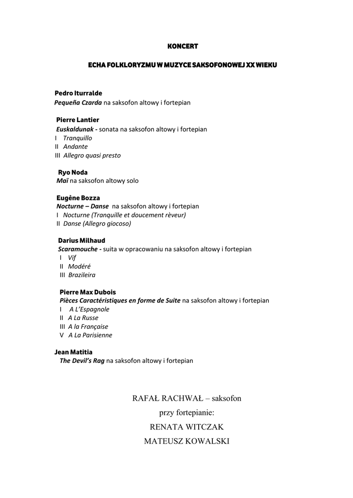 KONCERT ECHA FOLKLORYZMU W MUZYCE SAKSOFONOWEJ XX WIEKU Pedro Iturralde Pequeña Czarda na saksofon altowy i fortepian Pierre Lantier Euskaldunak - sonata na saksofon altowy i fortepian I Tranquillo II Andante III Allegro quasi presto Ryo Noda Maї na saksofon altowy solo Eugène Bozza Nocturne – Danse na saksofon altowy i fortepian I Nocturne (Tranquille et doucement rèveur) II Danse (Allegro giocoso) Darius Milhaud Scaramouche - suita w opracowaniu na saksofon altowy i fortepian I Vif II Modéré III Brazileira Pierre Max Dubois Pièces Caractéristiques en forme de Suite na saksofon altowy i fortepian I A L’Espagnole II A La Russe III A la Française V A La Parisienne Jean Matitia The Devil’s Rag na saksofon altowy i fortepian RAFAŁ RACHWAŁ – saksofon przy fortepianie: RENATA WITCZAK MATEUSZ KOWALSKI
