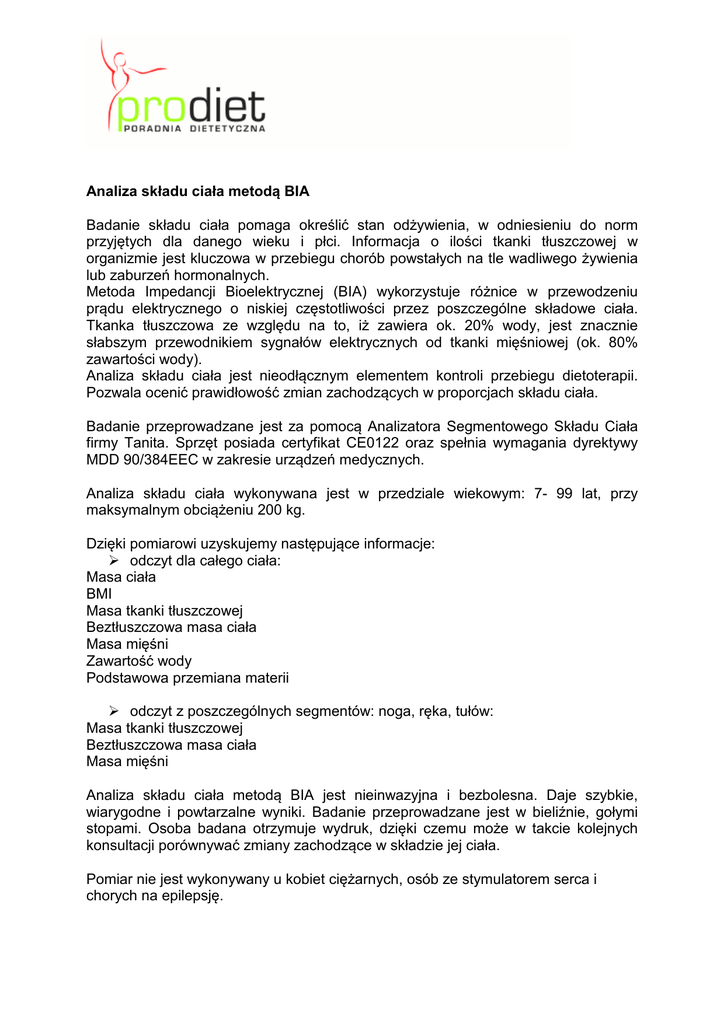Analiza składu ciała metodą BIA Badanie składu ciała pomaga określić stan odżywienia, w odniesieniu do norm przyjętych dla danego wieku i płci. Informacja o ilości tkanki tłuszczowej w organizmie jest kluczowa w przebiegu chorób powstałych na tle wadliwego żywienia lub zaburzeń hormonalnych. Metoda Impedancji Bioelektrycznej (BIA) wykorzystuje różnice w przewodzeniu prądu elektrycznego o niskiej częstotliwości przez poszczególne składowe ciała. Tkanka tłuszczowa ze względu na to, iż zawiera ok. 20% wody, jest znacznie słabszym przewodnikiem sygnałów elektrycznych od tkanki mięśniowej (ok. 80% zawartości wody). Analiza składu ciała jest nieodłącznym elementem kontroli przebiegu dietoterapii. Pozwala ocenić prawidłowość zmian zachodzących w proporcjach składu ciała. Badanie przeprowadzane jest za pomocą Analizatora Segmentowego Składu Ciała firmy Tanita. Sprzęt posiada certyfikat CE0122 oraz spełnia wymagania dyrektywy MDD 90/384EEC w zakresie urządzeń medycznych. Analiza składu ciała wykonywana jest w przedziale wiekowym: 7- 99 lat, przy maksymalnym obciążeniu 200 kg. Dzięki pomiarowi uzyskujemy następujące informacje: odczyt dla całego ciała: Masa ciała BMI Masa tkanki tłuszczowej Beztłuszczowa masa ciała Masa mięśni Zawartość wody Podstawowa przemiana materii odczyt z poszczególnych segmentów: noga, ręka, tułów: Masa tkanki tłuszczowej Beztłuszczowa masa ciała Masa mięśni Analiza składu ciała metodą BIA jest nieinwazyjna i bezbolesna. Daje szybkie, wiarygodne i powtarzalne wyniki. Badanie przeprowadzane jest w bieliźnie, gołymi stopami. Osoba badana otrzymuje wydruk, dzięki czemu może w takcie kolejnych konsultacji porównywać zmiany zachodzące w składzie jej ciała. Pomiar nie jest wykonywany u kobiet ciężarnych, osób ze stymulatorem serca i chorych na epilepsję.