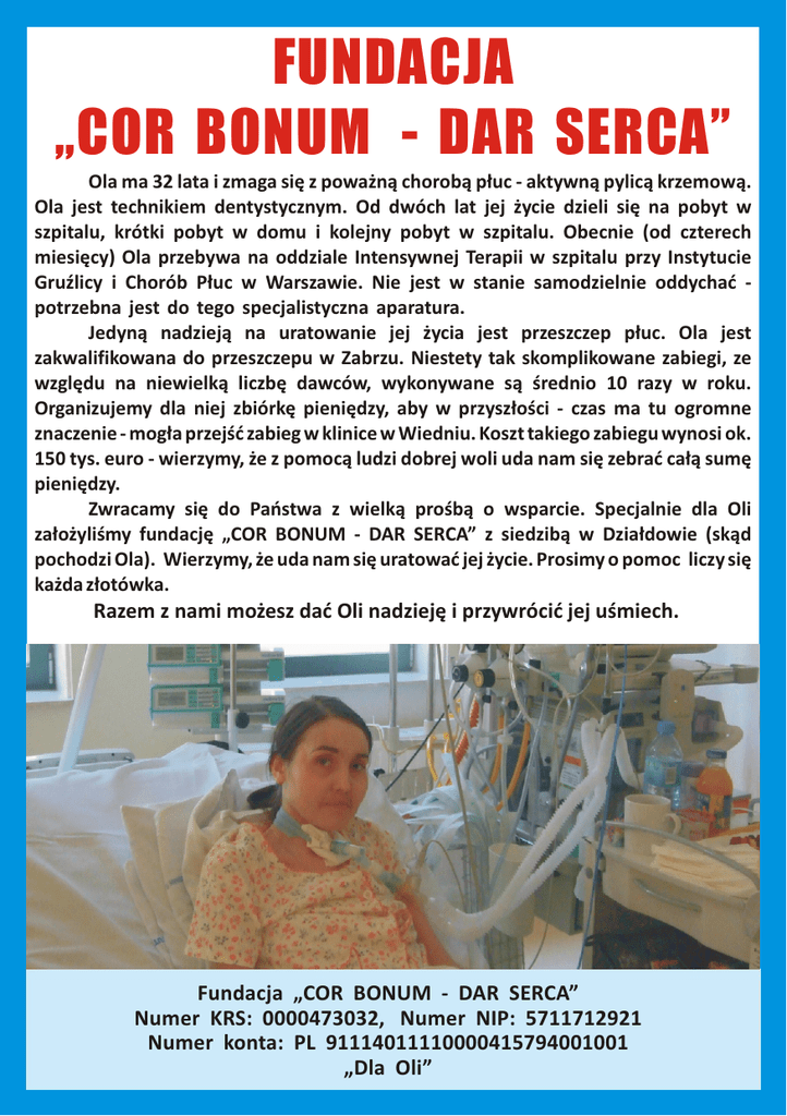 FUNDACJA „COR BONUM - DAR SERCA” Ola ma 32 lata i zmaga się z poważną chorobą płuc - aktywną pylicą krzemową. Ola jest technikiem dentystycznym. Od dwóch lat jej życie dzieli się na pobyt w szpitalu, krótki pobyt w domu i kolejny pobyt w szpitalu. Obecnie (od czterech miesięcy) Ola przebywa na oddziale Intensywnej Terapii w szpitalu przy Instytucie Gruźlicy i Chorób Płuc w Warszawie. Nie jest w stanie samodzielnie oddychać potrzebna jest do tego specjalistyczna aparatura. Jedyną nadzieją na uratowanie jej życia jest przeszczep płuc. Ola jest zakwalifikowana do przeszczepu w Zabrzu. Niestety tak skomplikowane zabiegi, ze względu na niewielką liczbę dawców, wykonywane są średnio 10 razy w roku. Organizujemy dla niej zbiórkę pieniędzy, aby w przyszłości - czas ma tu ogromne znaczenie - mogła przejść zabieg w klinice w Wiedniu. Koszt takiego zabiegu wynosi ok. 150 tys. euro - wierzymy, że z pomocą ludzi dobrej woli uda nam się zebrać całą sumę pieniędzy. Zwracamy się do Państwa z wielką prośbą o wsparcie. Specjalnie dla Oli założyliśmy fundację „COR BONUM - DAR SERCA” z siedzibą w Działdowie (skąd pochodzi Ola). Wierzymy, że uda nam się uratować jej życie. Prosimy o pomoc liczy się każda złotówka. Razem z nami możesz dać Oli nadzieję i przywrócić jej uśmiech. Fundacja „COR BONUM - DAR SERCA” Numer KRS: 0000473032, Numer NIP: 5711712921 Numer konta: PL 91114011110000415794001001 „Dla Oli” FUNDACJA „COR BONUM - DAR SERCA” Ola ma 32 lata i zmaga się z poważną chorobą płuc - aktywną pylicą krzemową. Ola jest technikiem dentystycznym. Od dwóch lat jej życie dzieli się na pobyt w szpitalu, krótki pobyt w domu i kolejny pobyt w szpitalu. Obecnie (od czterech miesięcy) Ola przebywa na oddziale Intensywnej Terapii w szpitalu przy Instytucie Gruźlicy i Chorób Płuc w Warszawie. Nie jest w stanie samodzielnie oddychać potrzebna jest do tego specjalistyczna aparatura. Jedyną nadzieją na uratowanie jej życia jest przeszczep płuc. Ola jest zakwalifikowana do przeszczepu w Zabrzu. Niestety tak skomplikowane zabiegi, ze względu na niewielką liczbę dawców, wykonywane są średnio 10 razy w roku. Organizujemy dla niej zbiórkę pieniędzy, aby w przyszłości - czas ma tu ogromne znaczenie - mogła przejść zabieg w klinice w Wiedniu. Koszt takiego zabiegu wynosi ok. 150 tys. euro - wierzymy, że z pomocą ludzi dobrej woli uda nam się zebrać całą sumę pieniędzy. Zwracamy się do Państwa z wielką prośbą o wsparcie. Specjalnie dla Oli założyliśmy fundację „COR BONUM - DAR SERCA” z siedzibą w Działdowie (skąd pochodzi Ola). Wierzymy, że uda nam się uratować jej życie. Prosimy o pomoc liczy się każda złotówka. Razem z nami możesz dać Oli nadzieję i przywrócić jej uśmiech. Fundacja „COR BONUM - DAR SERCA” Numer KRS: 0000473032, Numer NIP: 5711712921 Numer konta: PL 91114011110000415794001001 „Dla Oli”