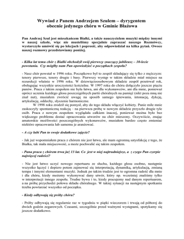 Wywiad z Panem Andrzejem Szulem – dyrygentem obecnie jedynego chóru w Gminie Błażowa Pan Andrzej Szul jest mieszkańcem Białki, a także nauczycielem muzyki między innymi w naszej szkole, więc nie musieliśmy specjalnie zapraszać naszego Rozmówcy, wystarczyło umówić się po lekcjach i poprosić, aby odpowiedział na kilka pytań. Owoce naszej rozmowy przedstawiamy poniżej. - Kilka lat temu chór z Białki obchodził swój pierwszy znaczący jubileusz – 10-lecie powstania. Czy mógłby nam Pan opowiedzieć o początkach zespołu? - Nasz chór powstał w 1996 roku. Początkowo był to zespół składający się tylko z mężczyzn: tenory pierwsze, tenory drugie i basy. Pierwszy występ w takim składzie miał miejsce na rezurekcji właśnie w 1996 roku. W dziewięcioosobowym składzie zespół przetrwał rok, obsługując wszystkie uroczystości kościelne. W 1997 roku do chóru dołączyło jeszcze pięciu panów. Praca z takim zespołem nie była łatwa, ani dla wykonawców, ani dla mnie, ponieważ oprócz uczenia każdego głosu poszczególnych partii chóralnych na pamięć (nikt poza mną nie znał nut), musiałem zwrócić uwagę na sposób samego śpiewania, intonację, dykcję, artykulację, oddechy, słyszenie harmoniczne. W 1998 roku zrodził się pomysł, aby do tego składu włączyć kobiety. Panie mile mnie zaskoczyły spontaniczną reakcją – na pierwsza próbę w nowym składzie przyszło drugie tyle osób. Praca z nowym zespołem wyglądała całkiem inaczej, ponieważ można było bez większego problemu dostać opracowania utworów na chór mieszony. Oczywiście, znając amatorskie możliwości poszczególnych wykonawców, musiałem bardzo często zmieniać niektóre opracowania lub samemu je aranżować. - A czy lubi Pan to swoje dodatkowe zajęcie? - Jak już wspomniałem praca z chórem nie jest łatwa, ale mam ogromną satysfakcję z tego, że Białka, tak mała miejscowość, a może pochwalić się takim zespołem. - Pana praca z chórem trwa już 13 lat. Co jest w niej najtrudniejsze, a z czego Pan czerpie najwięcej radości? - Nie jest łatwo uczyć nowego repertuaru ze słuchu, każdego głosu osobno, następnie wszystko łączyć i dopiero potem zajmować się interpretacją, dynamiką, artykulacją, zmianą tempa i innymi elementami muzyki. Jednak po takim trudzie jest to ogromna radość dla mnie i dla chóru, kiedy możemy wykonywać dany utwór, który np. wcześniej znaliśmy tylko w interpretacji innego zespołu. Trudne bywa i to, kiedy pracujemy nad danym repertuarem, a na próbę przychodzi połowa składu chóralnego. W takiej sytuacji na następnym spotkaniu trzeba powtarzać wszystko od początku. - Kiedy odbywają się próby chóru? - Próby odbywają się regularnie raz w tygodniu w piątki wieczorem i trwają od półtorej do dwóch godzin zegarowych. Czasami, szczególnie przed ważnymi występami, spotykamy się jeszcze dodatkowo. - Jakie warunki trzeba spełniać, aby zapisać się chóru? - Do chóru w zasadzie może należeć każda osoba, która posiada względny słuch muzyczny i potrafi śpiewać oraz deklaruje się regularnie uczęszczać na cotygodniowe próby. Młodsi jednak, którzy chcieliby rozwijać swoje zainteresowania wokalne (np. uczniowie szkoły podstawowej) mogą wykazać się w scholii, która animuje śpiew podczas niedzielnych mszy świętych w Białce. - Wiemy, że chór z Białki często włącza się w przygotowanie różnych uroczystości kościelnych, czasem koncertuje i to nie tylko na terenie naszej gminy. Czy mógłby Pan podzielić się swym doświadczeniem? - Do chóru należą osoby niezwiązane z muzyką zawodowo, to amatorzy, dlatego też nie mamy szczególnych osiągnięć. Jednak wyróżnić należy udział w Dożynkach Diecezjalnych w Jarosławiu w 1998 roku, a także w Dożynkach Archidiecezjalnych w Dynowie w tym samym roku i czuwanie Maryjne w Borku Starym oraz Koncert kolęd dla słuchaczy Centrum „Polonus” Uniwersytetu Rzeszowskiego. Braliśmy również udział w Przeglądzie Kolęd i Pastorałek w Boguchwale. Śpiewaliśmy pieśni podczas mszy świętych związanych z poświęceniem Krzyża Milenijnego w Szklarach i Błażowej. Włączyliśmy się w uroczystość nadania imienia św. Jadwigi Królowej Zespołowi Szkół w Błażowej. Nie zabrakło nas podczas „Dni Kultury Chrześcijańskiej – Błażowa 2001” i peregrynacji kopii obrazu Matki Boskiej Jasnogórskiej – Błażowa 2003, a także na uroczystej mszy, podczas której odbyło się posłanie misjonarza – ks. Wiesława Groszka. Koncertowaliśmy w „Caritas” w Kąkolówce. Poza tym przygotowywałem z zespołem oprawy muzyczne na uroczystości kościelne w Białce i Błażowej, które wynikały z kalendarza liturgicznego. - Dla jakich odbiorców przeznaczona jest Wasza muzyka? - Repertuar chóru to w większość utwory o charakterze religijnym. Związane jest to z animowaniem śpiewu podczas ważniejszych Uroczystości Kościelnych. W święta Bożego Narodzenia – śpiewamy kolędy, następnie pieśni wielkopostne, wielkanocne, a po nich maryjne i eucharystyczne. Chór ma w swoim repertuarze również pieśni patriotyczne, okolicznościowe i ludowe. Myślę, że każdy słuchacz – młodszy czy starszy może coś dla siebie znaleźć. - Jaki są Pana plany związane z najbliższą przyszłością chóru? - Obecnie chór liczy około dwudziestu pięciu osób w bardzo dużym przedziale wiekowym. Chciałbym, żeby w przyszłości do chóru był nieco liczniejszy, ponieważ co jakiś czas ubywa chórzystów. Związane jest to z osobistymi sprawami. Szczególnie ludzie młodzi, którzy szukają pracy, zmieniają swoje miejsce zamieszkania – po prostu wyjeżdżają z wioski i rezygnują ze śpiewania w chórze. - Z obecnej perspektywy wydaję się, iż muzyka towarzyszy Panu przez całe życie. Czy przypomina Pan sobie, w którym momencie stała się tą wielką pasją? - Jak sobie przypominam, od najmłodszych