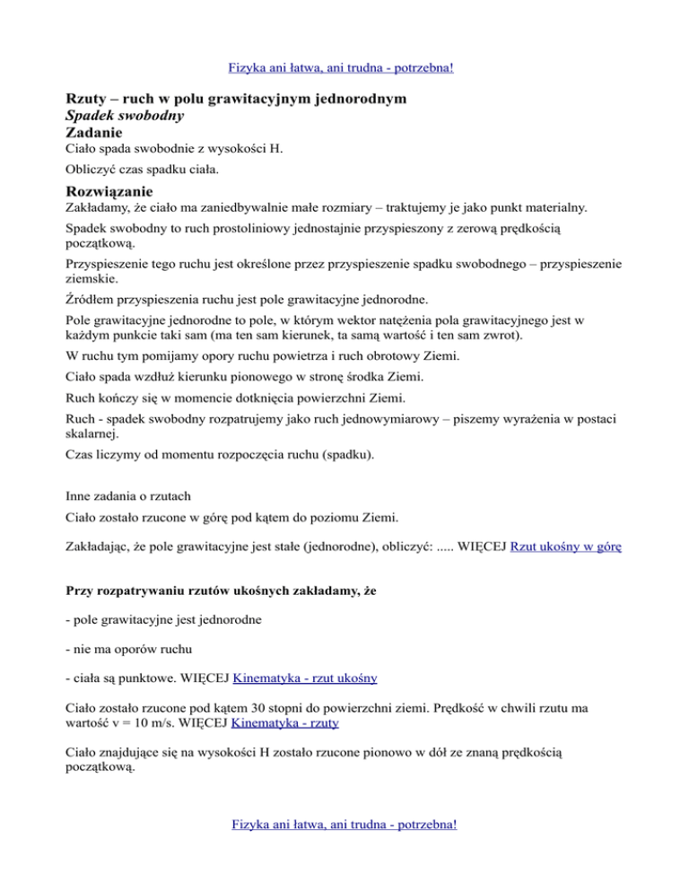 Rzuty – ruch w polu grawitacyjnym jednorodnym. Spadek swobodny